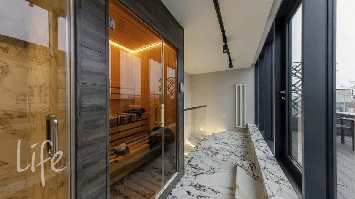Эксплуатируемая кровля: комплексная зона релаксации и отдыха на открытом воздухе: сауна, с/у, душ, выход на кровлю, на которой стоит уличная мебель.