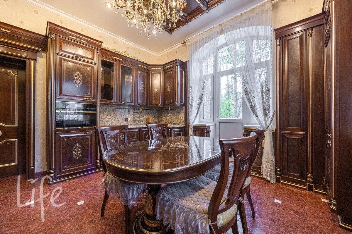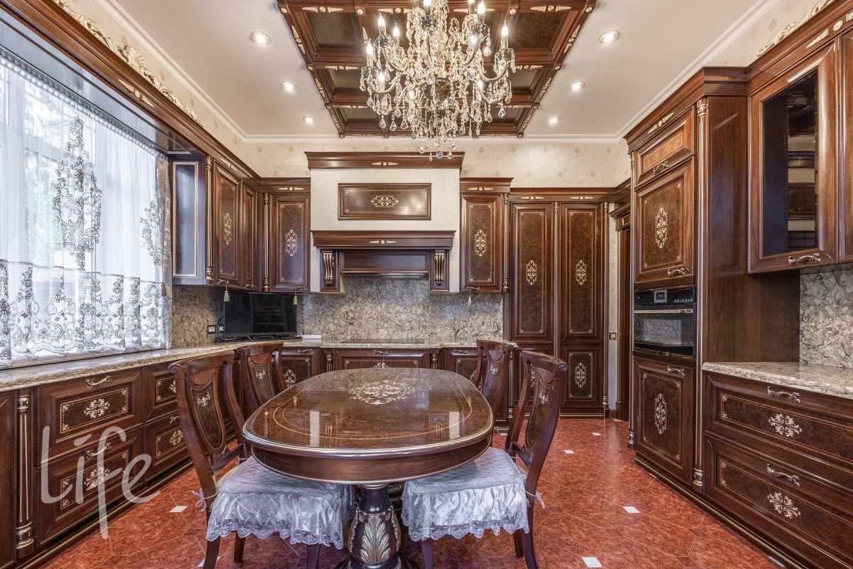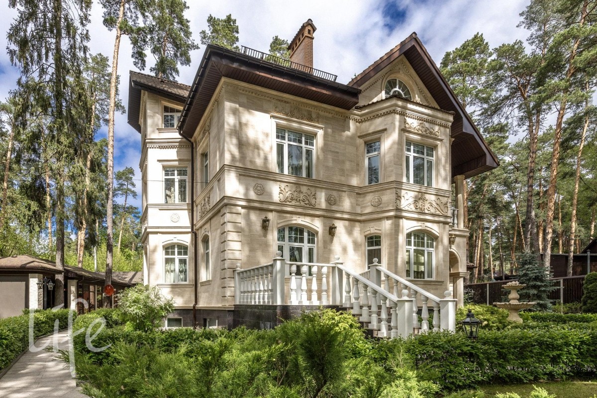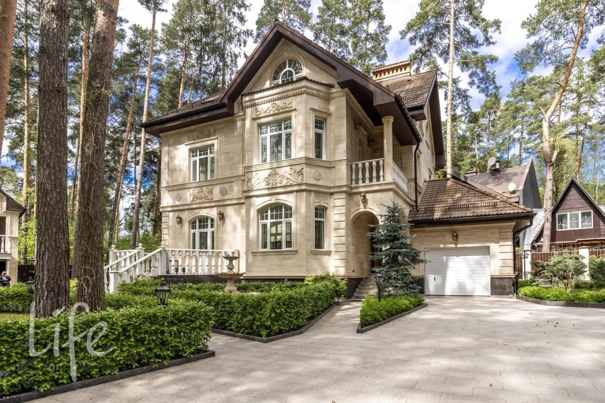 Охраняемый коттеджный поселок. Дом жилой, полностью под ключ, меблирован и оборудован всей необходимой бытовой техникой. Конструктив: монолитный фундамент и перекрытия, стены — кирпич, крыша — черепица, фасад облицован натуральным камнем.