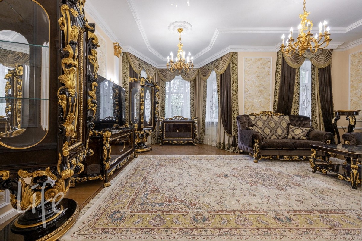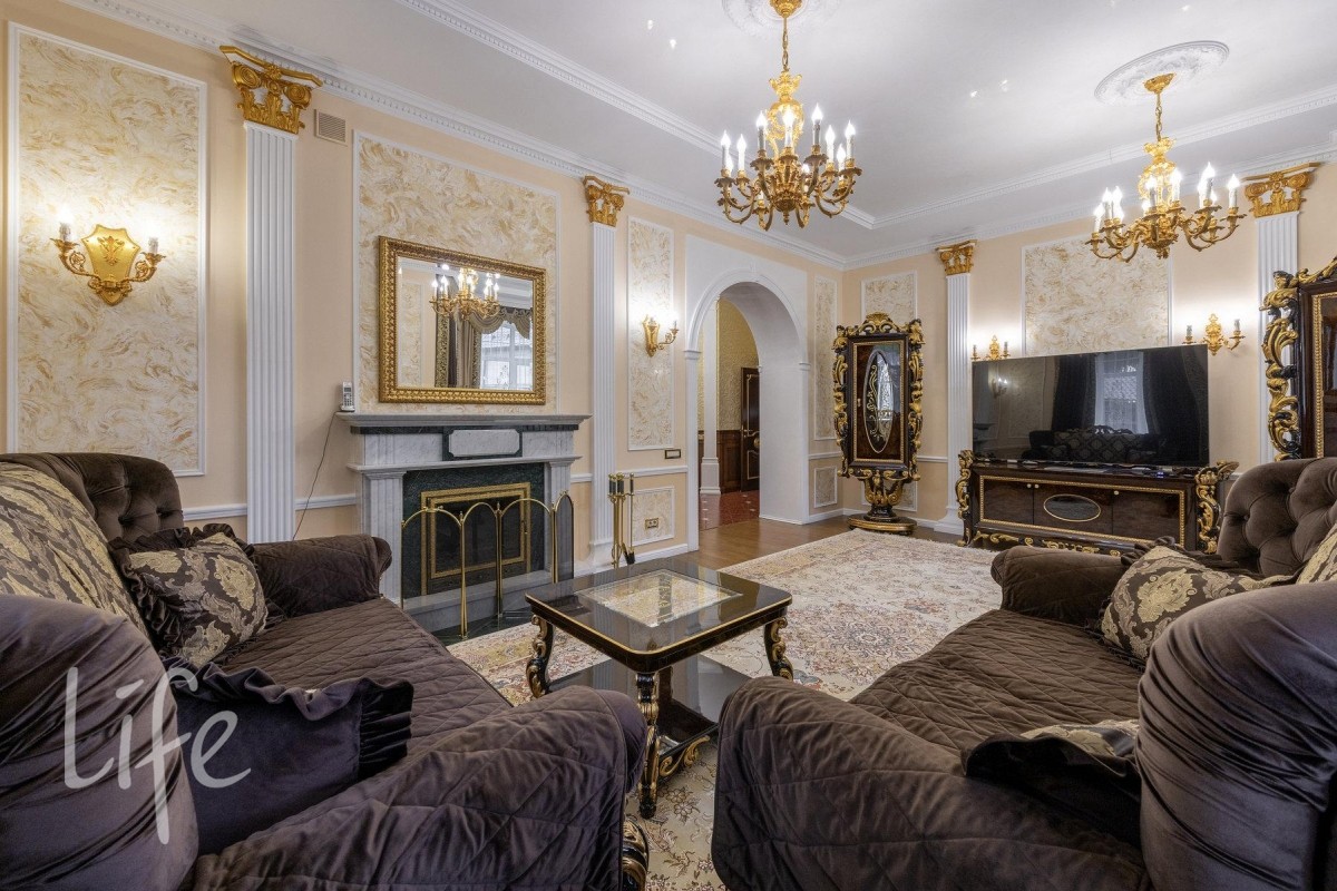Интерьер выполнен в классическом стиле, со вкусом подобрана мебель и аксессуары. Гостиную украшает дровяной камин.