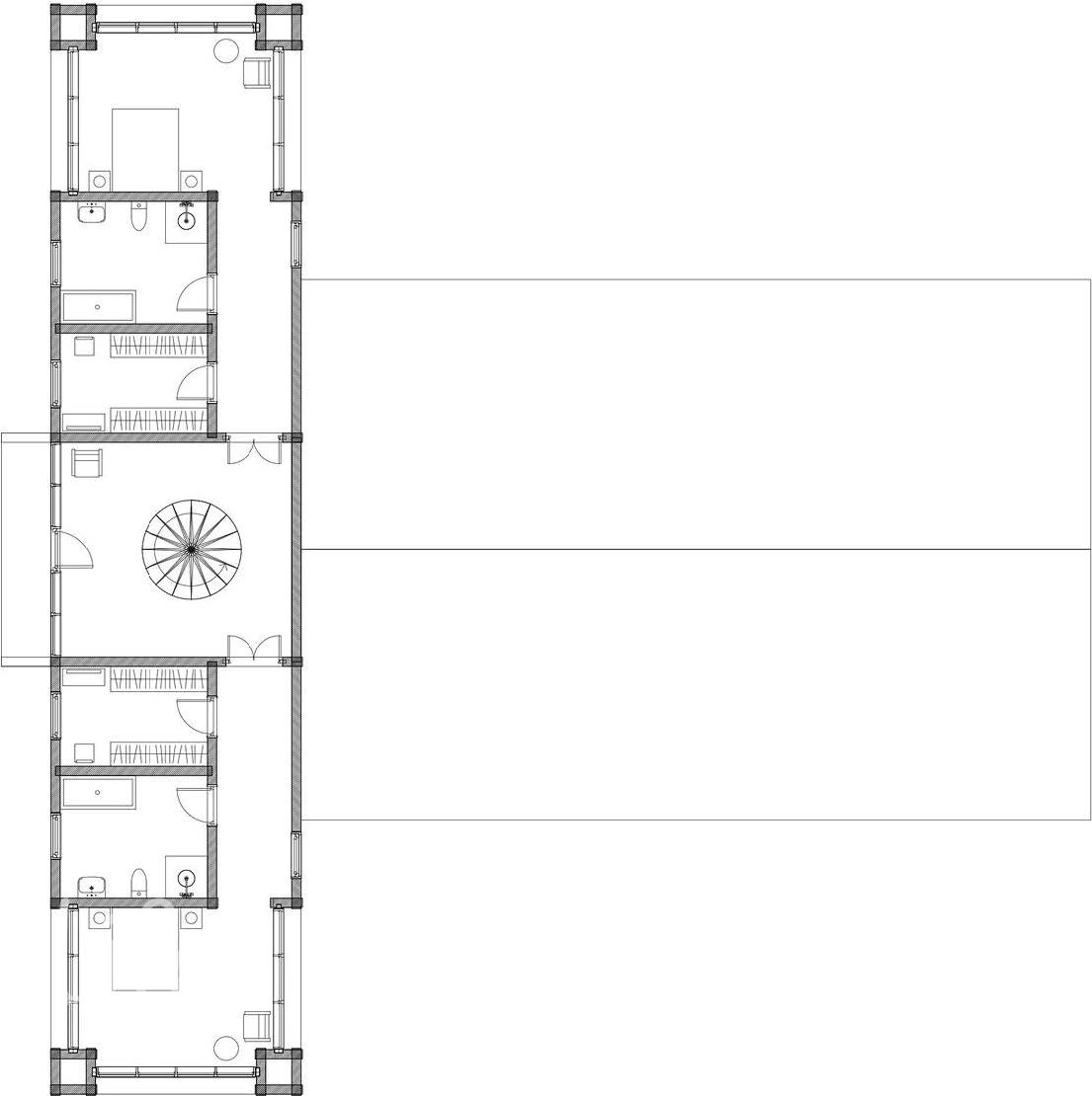 2 этаж: холл и две спальни с личными гардеробными и санузлами, по периметру — лёгкие французские балкончики.