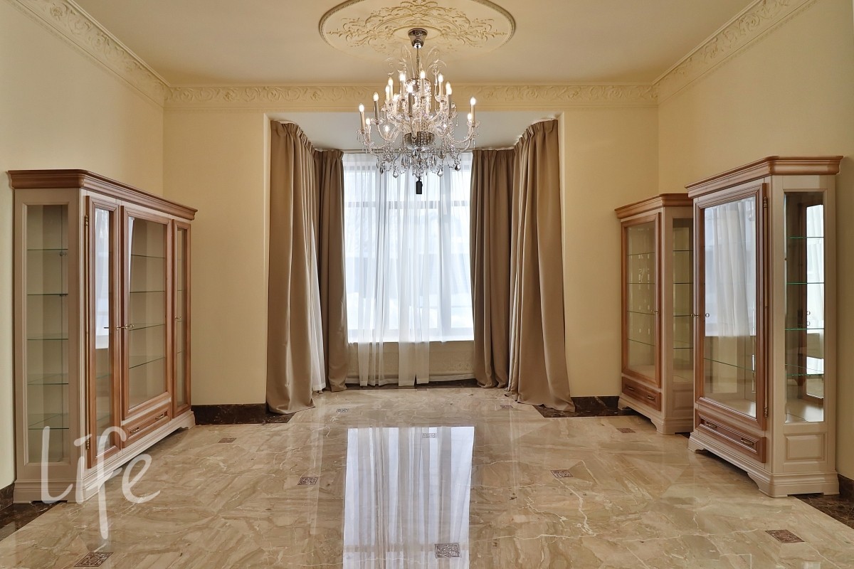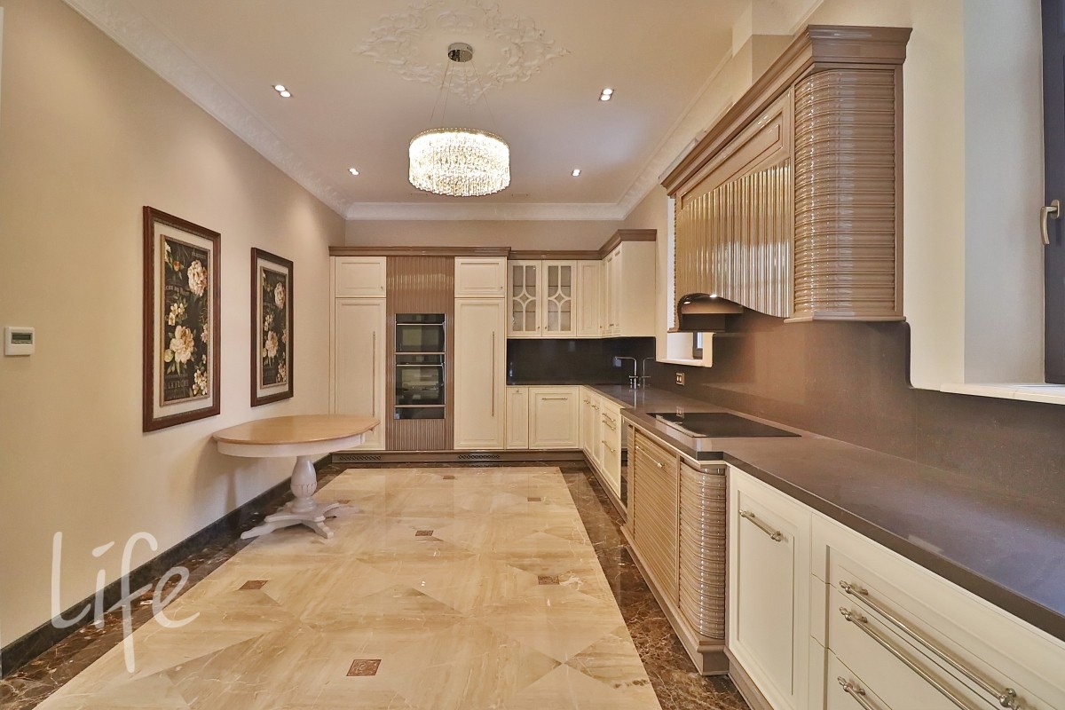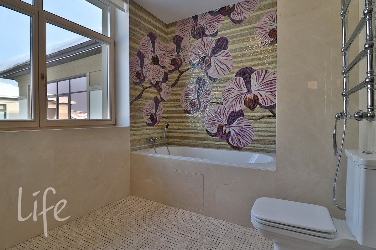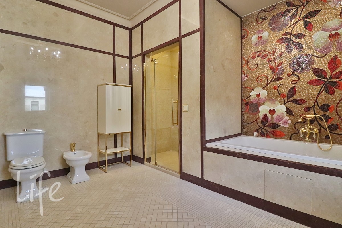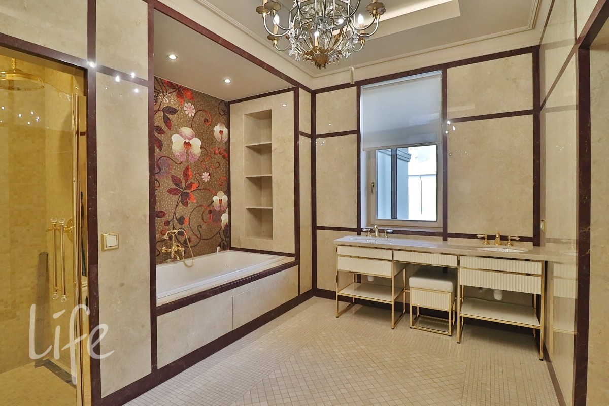 Высокое качество отделочных работ. Натуральный паркет, мозаика, натуральный мрамор и лепнина, итальянская сантехника.