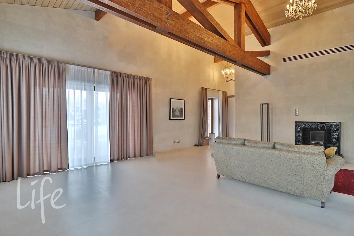 Интерьер выполнен в современном классическом стиле, в мягких тонах, со вкусом подобрана мебель, привезенная из Италии, и аксессуары. Гостиную со вторым светом украшает шикарный дровяной камин.