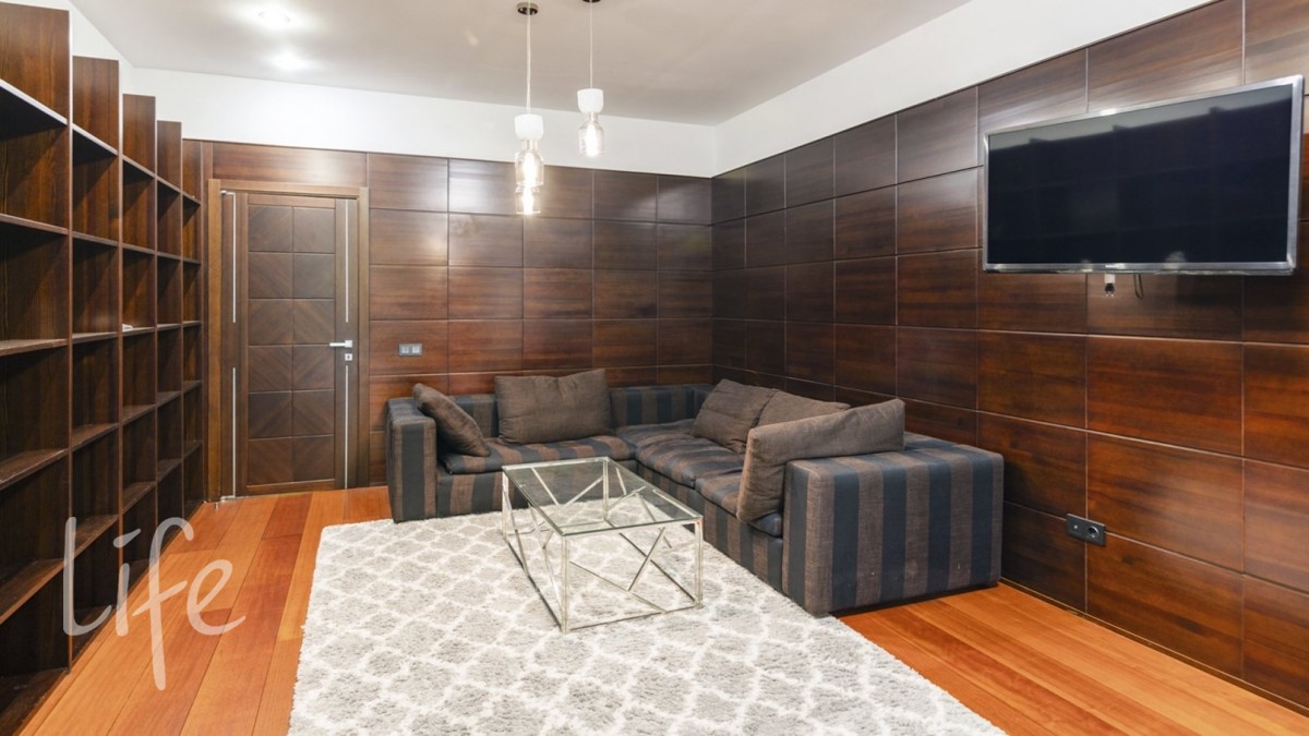 Интерьеры, оформленные в спокойной цветовой гамме, представляют собой гармоничное сочетание природных фактур камня и дерева. Элегантные витражи,изящные светильники, картины, предметы декора и мягкий текстиль наполняют пространство уютом. Мебель и бытовая техника обеспечивают комфорт для будущих владельцев. Планировка включает просторную гостиную с камином, плавно переходящую в кухню-столовую, а также 5 спален, учитывая мастер-спальню с вместительной гардеробной. Особого внимания заслуживают бассейн,оборудованный проектором, и хаммам с ароматизацией.
