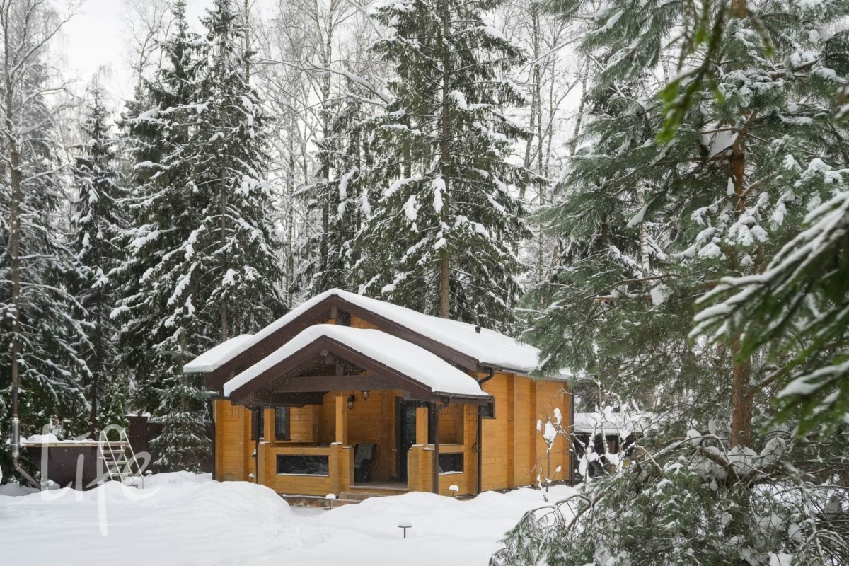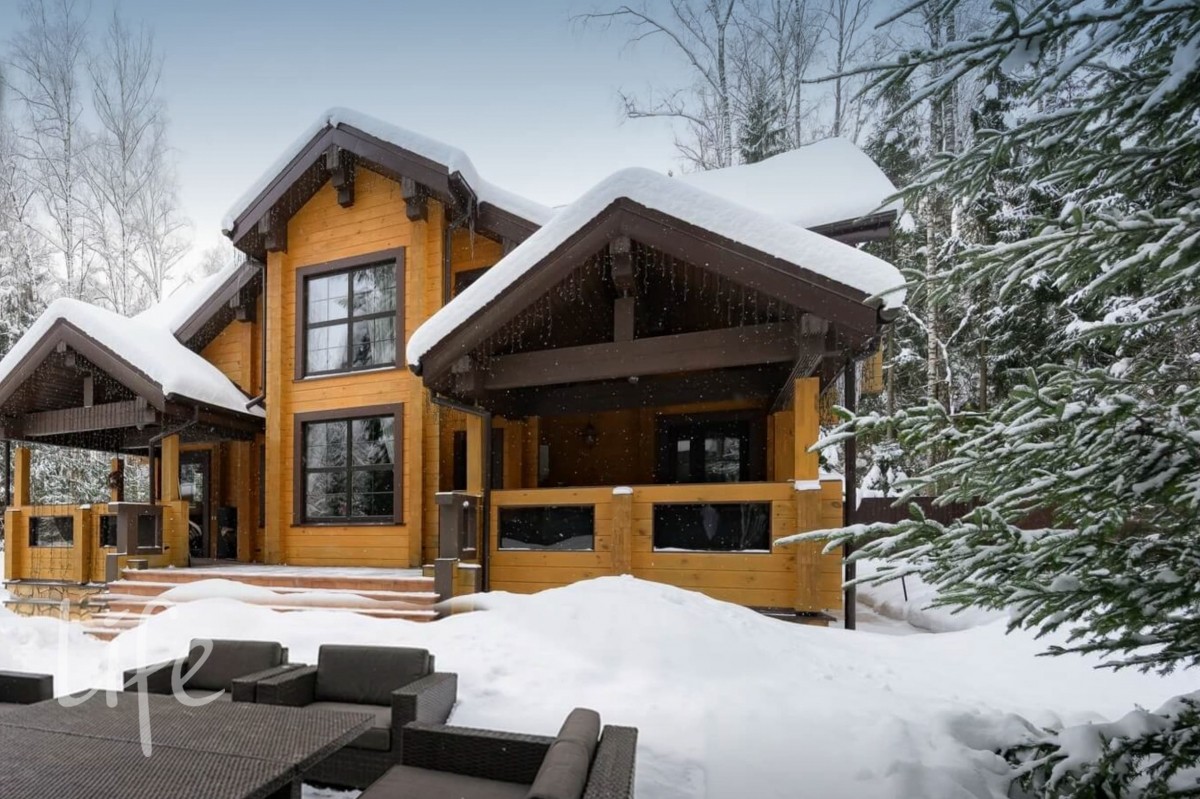 Стильный дом из клееного бруса 250 кв.м и отдельно стоящая русская баня 55 кв.м на лесном участке в коттеджном поселке Назарьево.