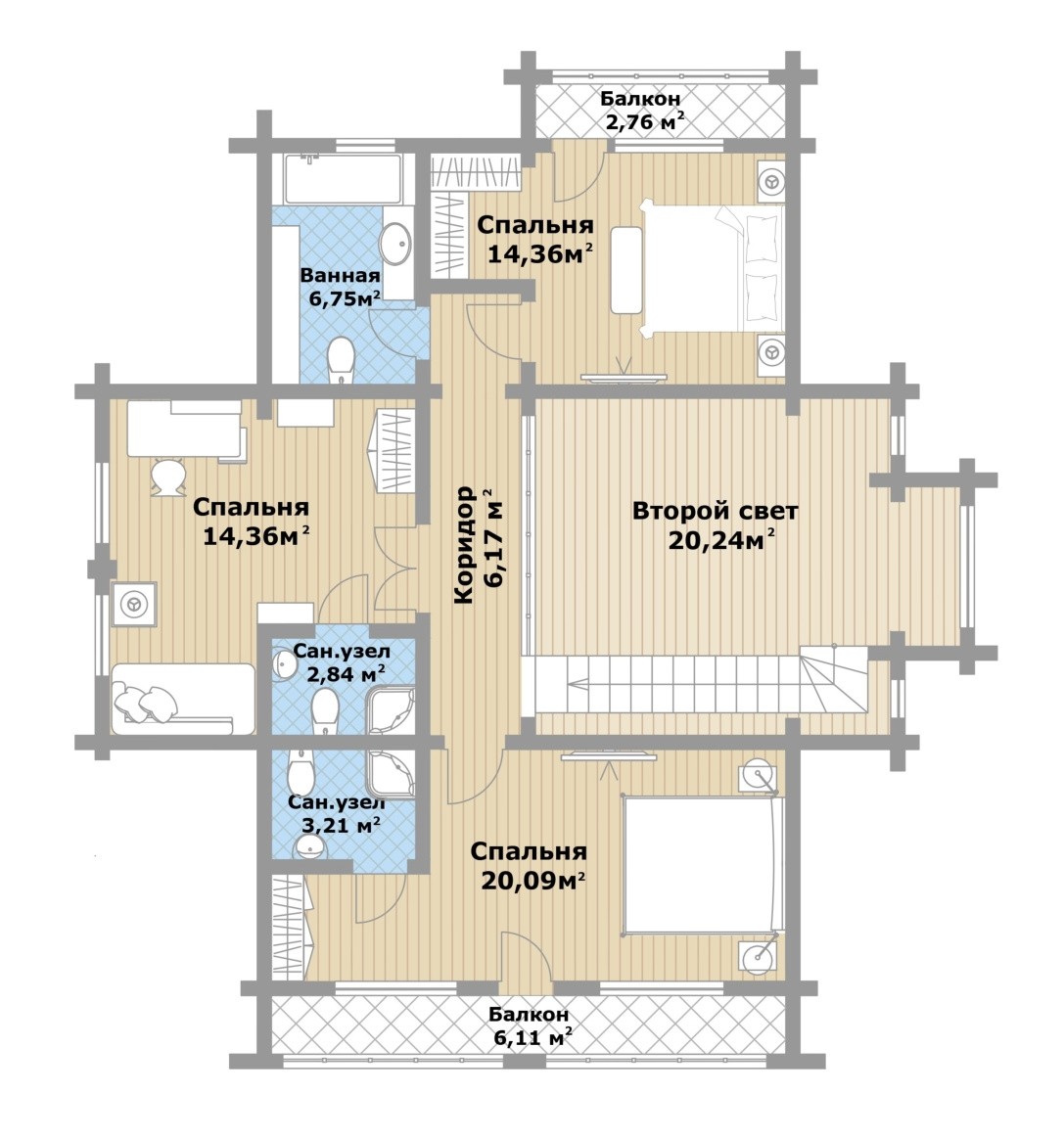 2 этаж: мастер-спальня (20,1) с ванной (3,2) и выходом на балкон (6,11), детская №1 (14,4) с ванной (6,8) и выходом на балкон (2,8), детская №2 (14,4) с ванной (2,8), коридор (6,2), второй свет (20,2).
