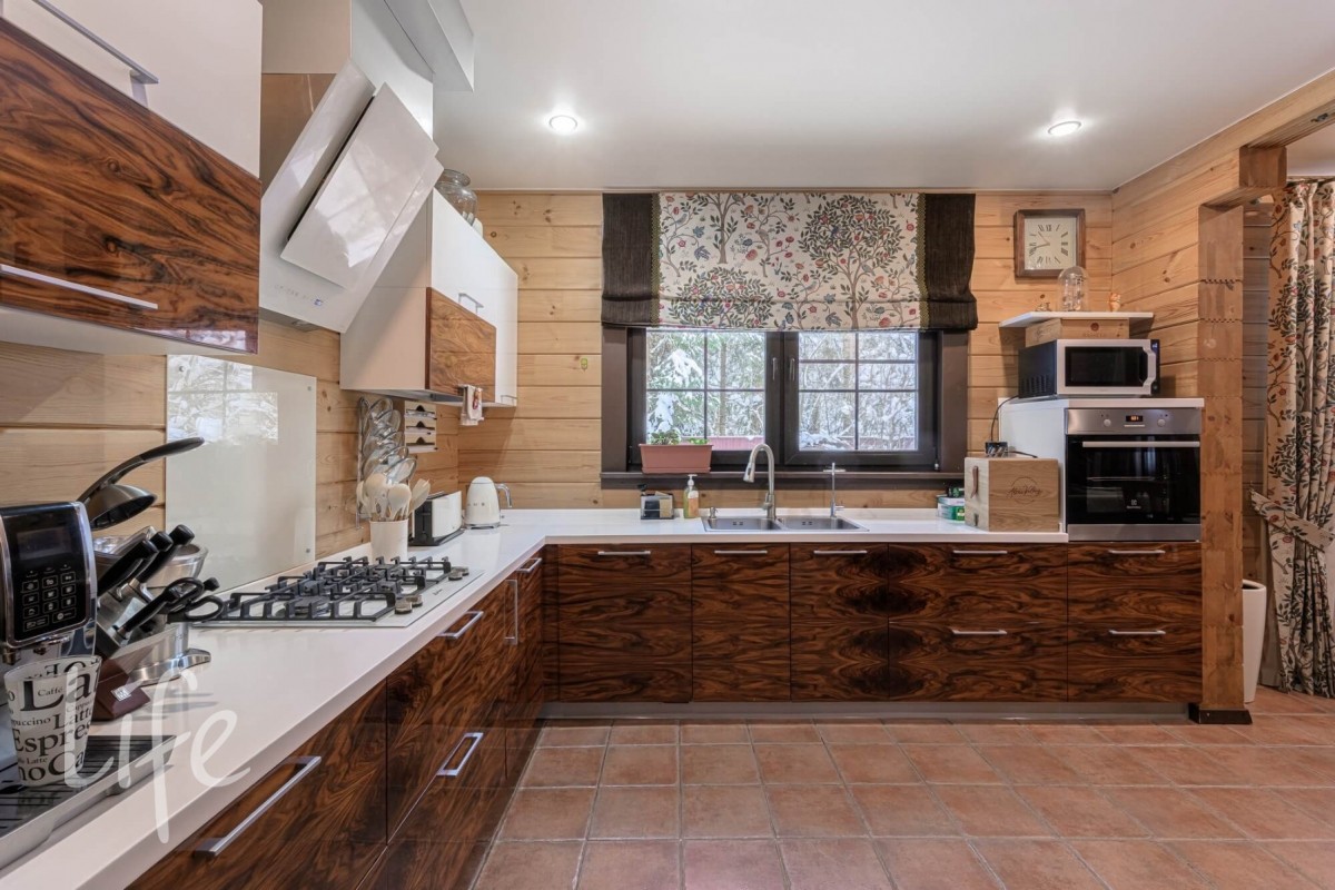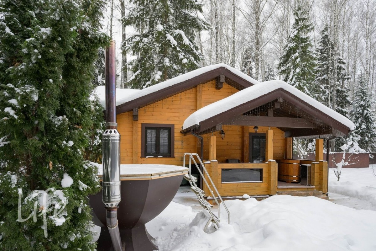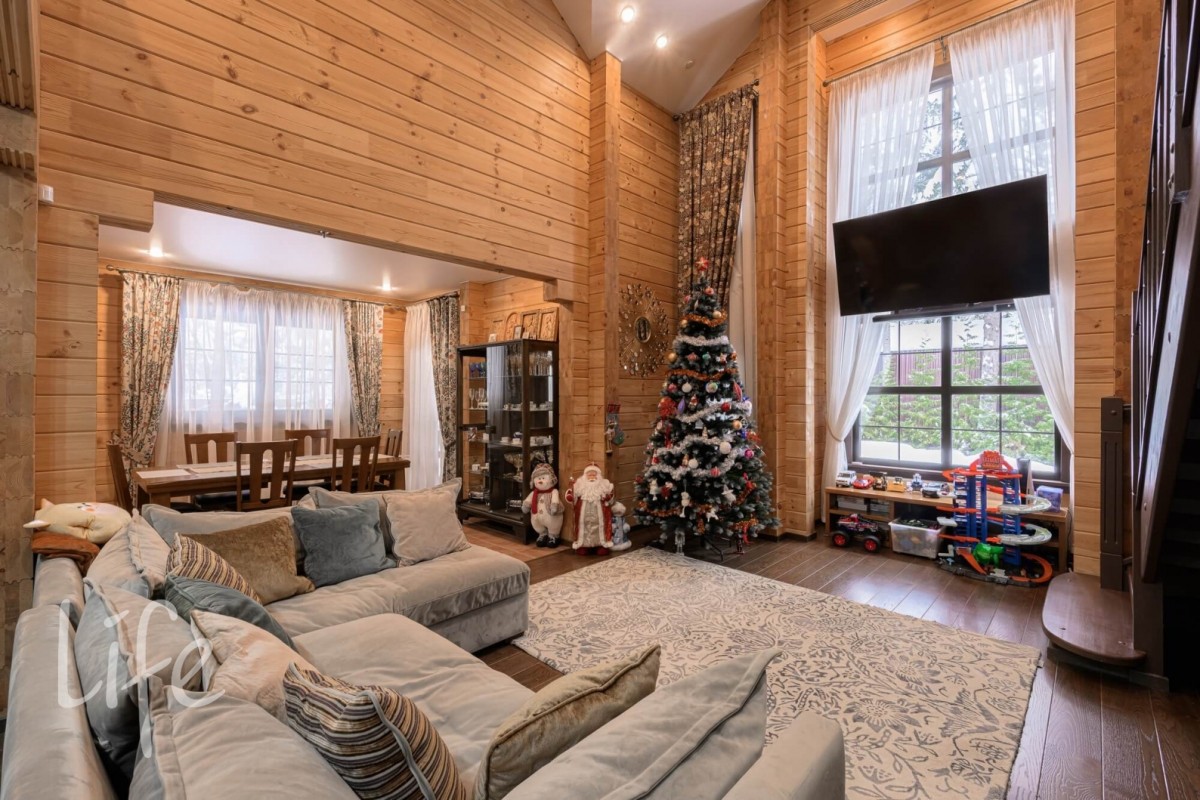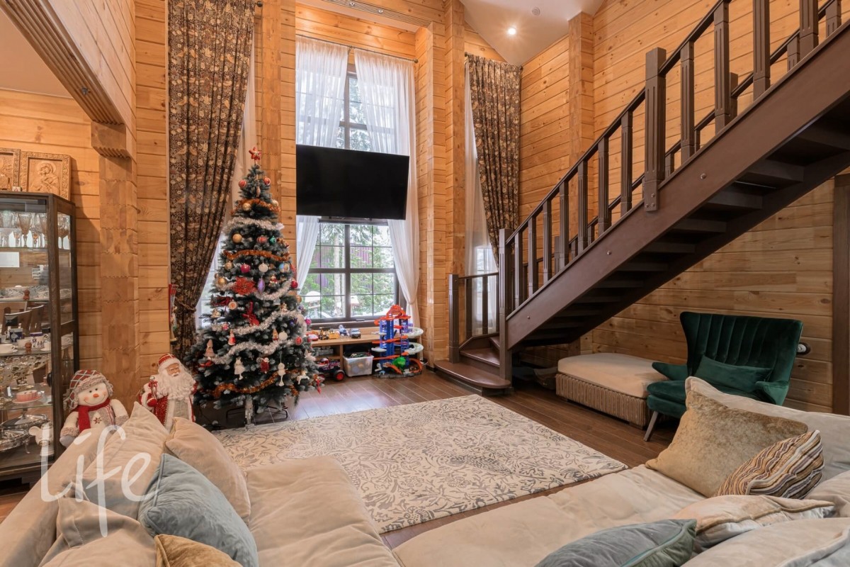 Особенности: просторная двусветная гостиная, английский текстиль (шторы и ковры – Morris), “молодильный” чан на дровах рядом с баней, большой лесной участок, батут. Дом и баня полностью меблированы и готовы к проживанию.