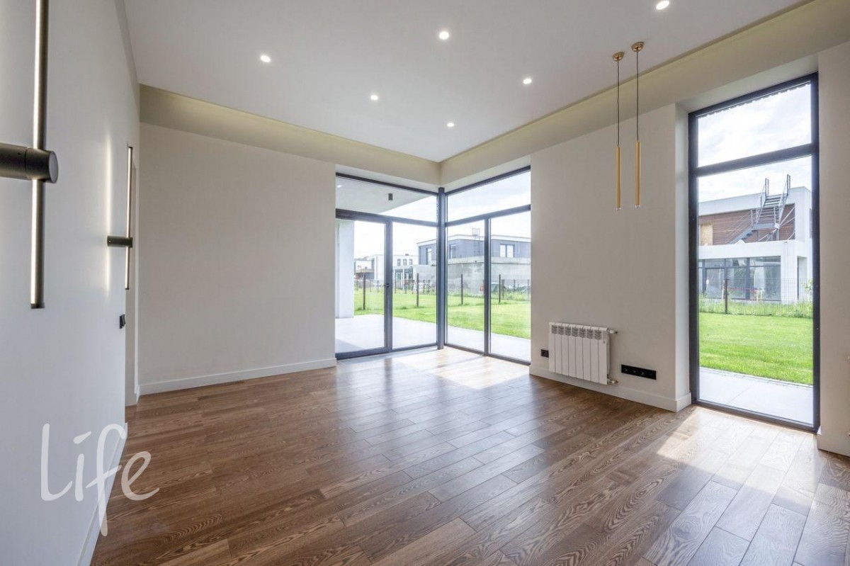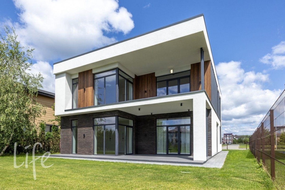 Дом в стиле хай-тек полностью под ключ, меблирован и оборудован всей необходимой бытовой техникой. Панорамное остекление, плоская кровля.