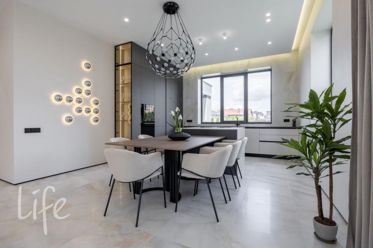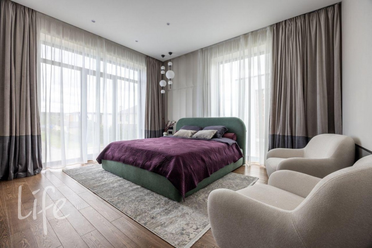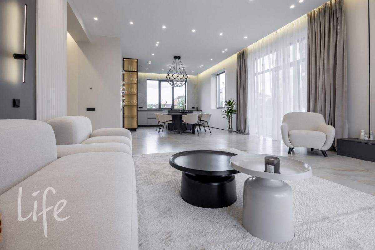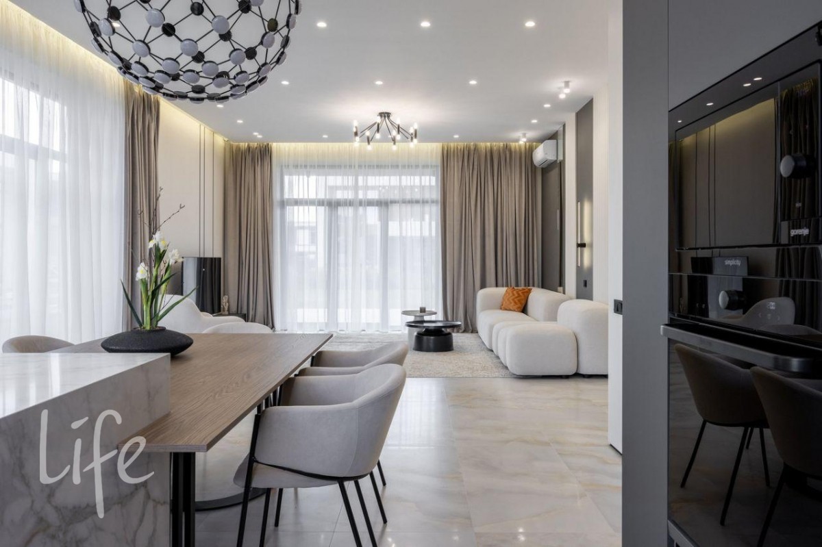 Дизайнерский интерьер в мягких, пастельных тонах, с использованием фактурных декоративных элементов в отделке. Современные световые решения. Большие панорамные окна наполняют дом светом, делая его уютнее и просторнее.