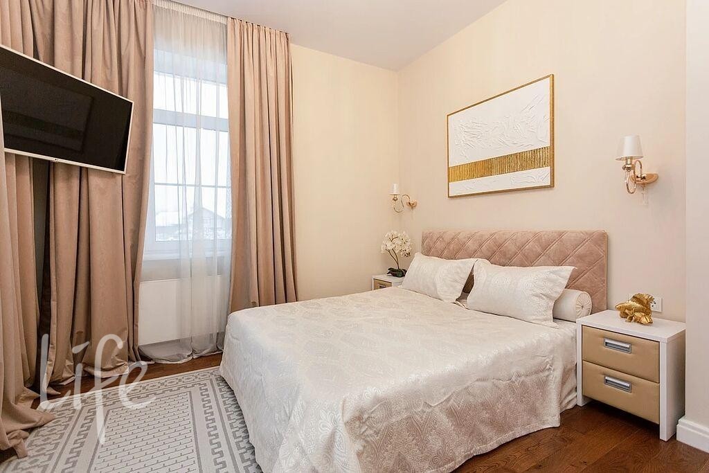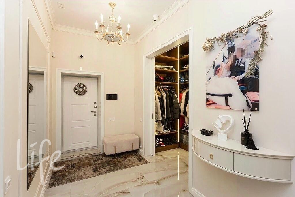 Интерьер выполнен в современном классическом стиле, в мягких светлых тонах. Со вкусом подобрана мебель и аксессуары. Современные системы освещения.