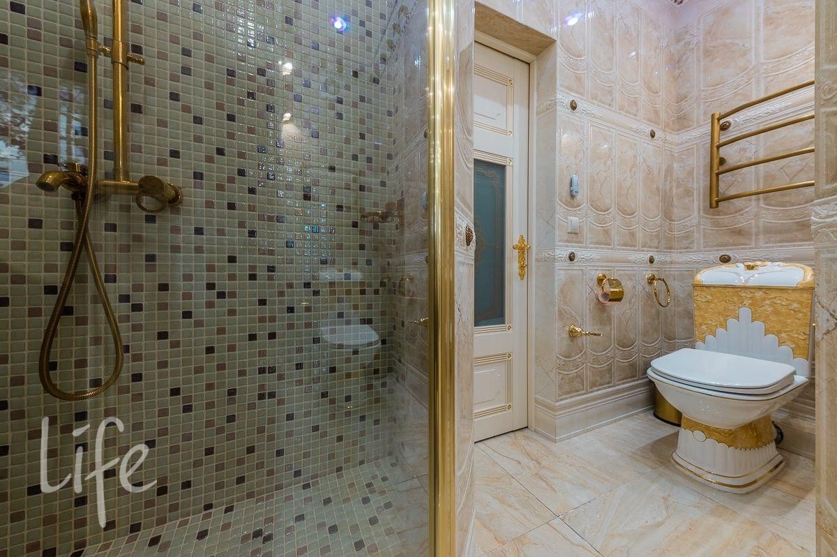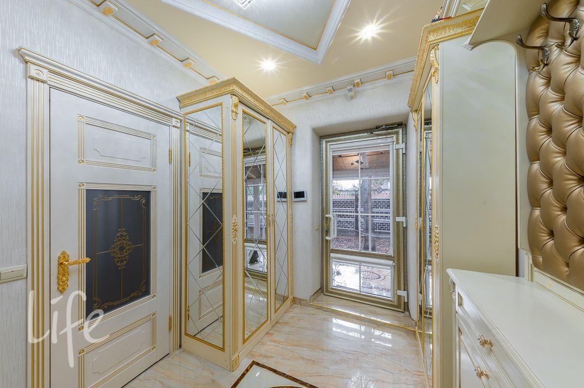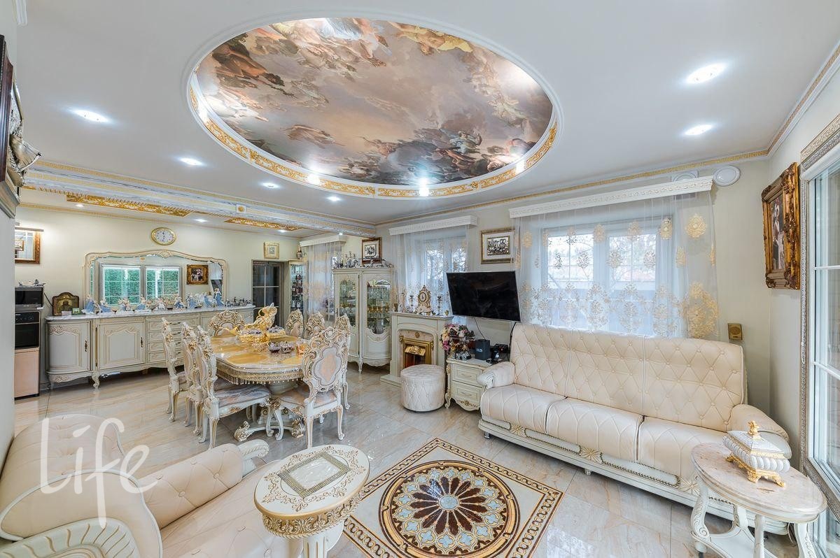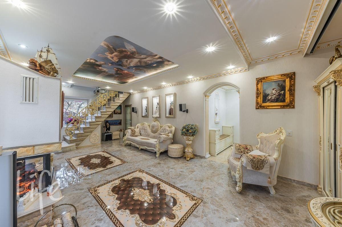 Интерьер выполнен в классическом стиле, потолок и стены украшены лепниной, со вкусом подобрана дорогая мебель и предметы быта. Гостиную украшает действующий дровяной камин.