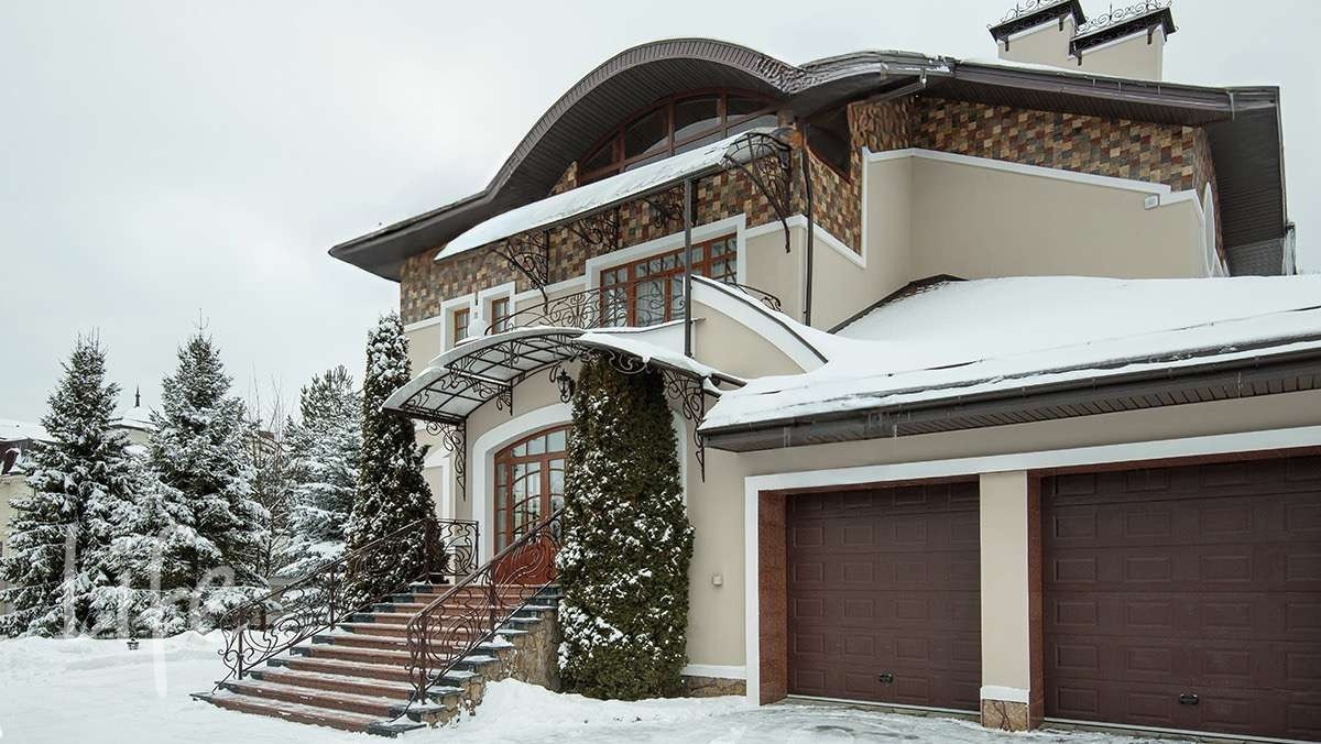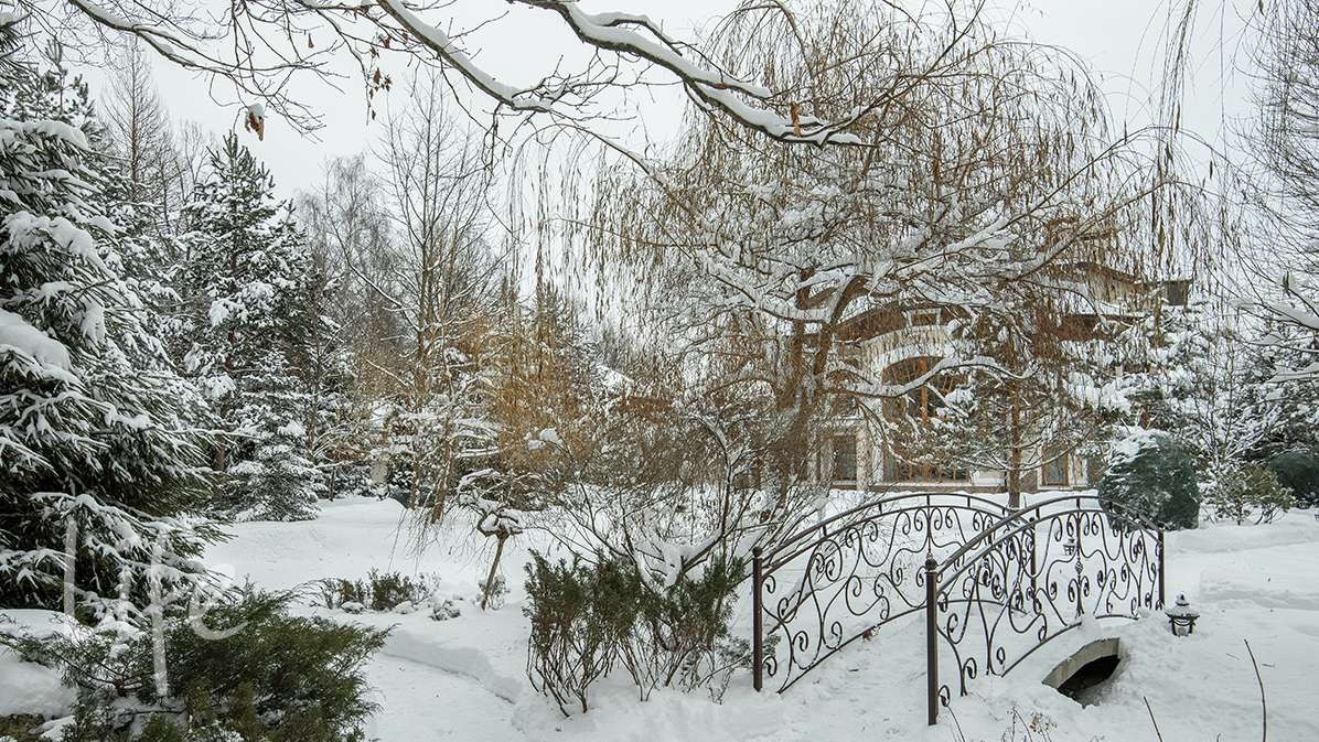 Выполнен ландшафтный дизайн, посажены декоративные растения и кустарники, 5 видов сосен, кедр, пихты. Тротуары вымощены камнем и гранитом, установлено ландшафтное освещение. В центре участка находится декоративный пруд голубиной 3 метра с ручьем и водопадом.