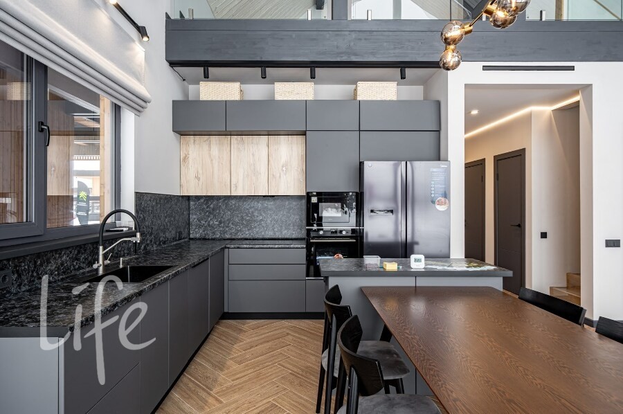 Планировка: 3 спальни, включая мастер-спальню с собственным гардеробом и с/у, две просторные детские комнаты, кабинет/гостевая на первом этаже, 3 с/у, гардеробные и места хранения, уличная терраса, хозблок.