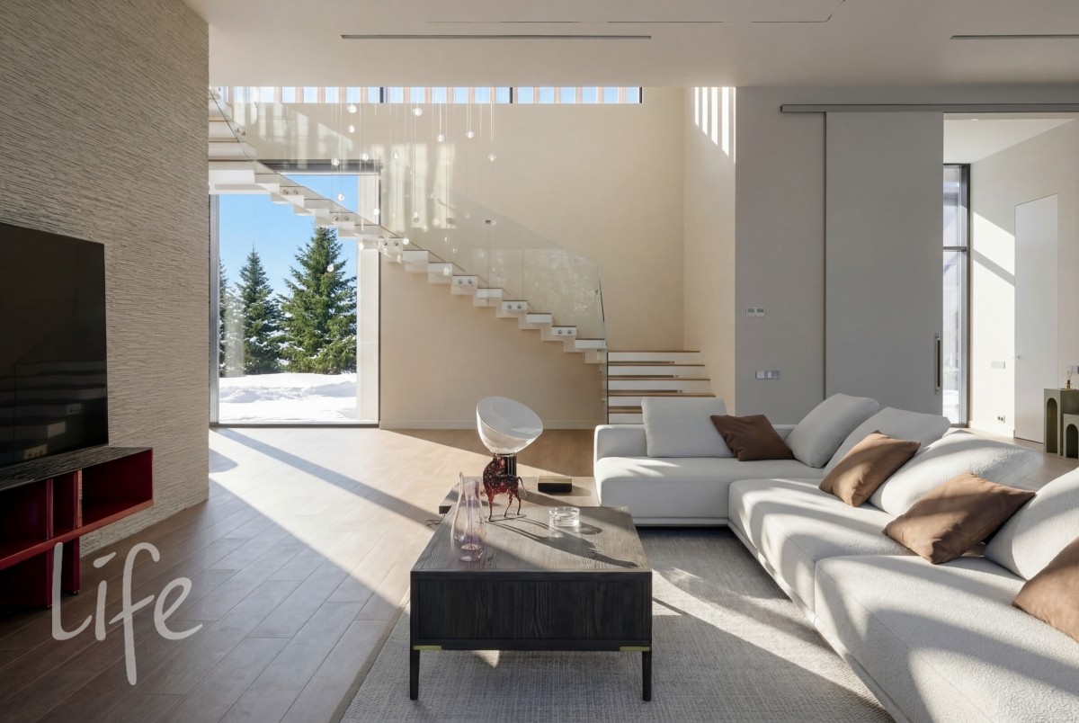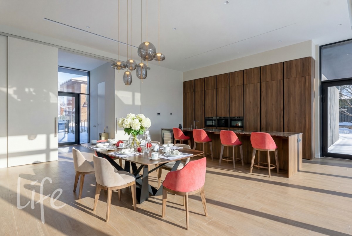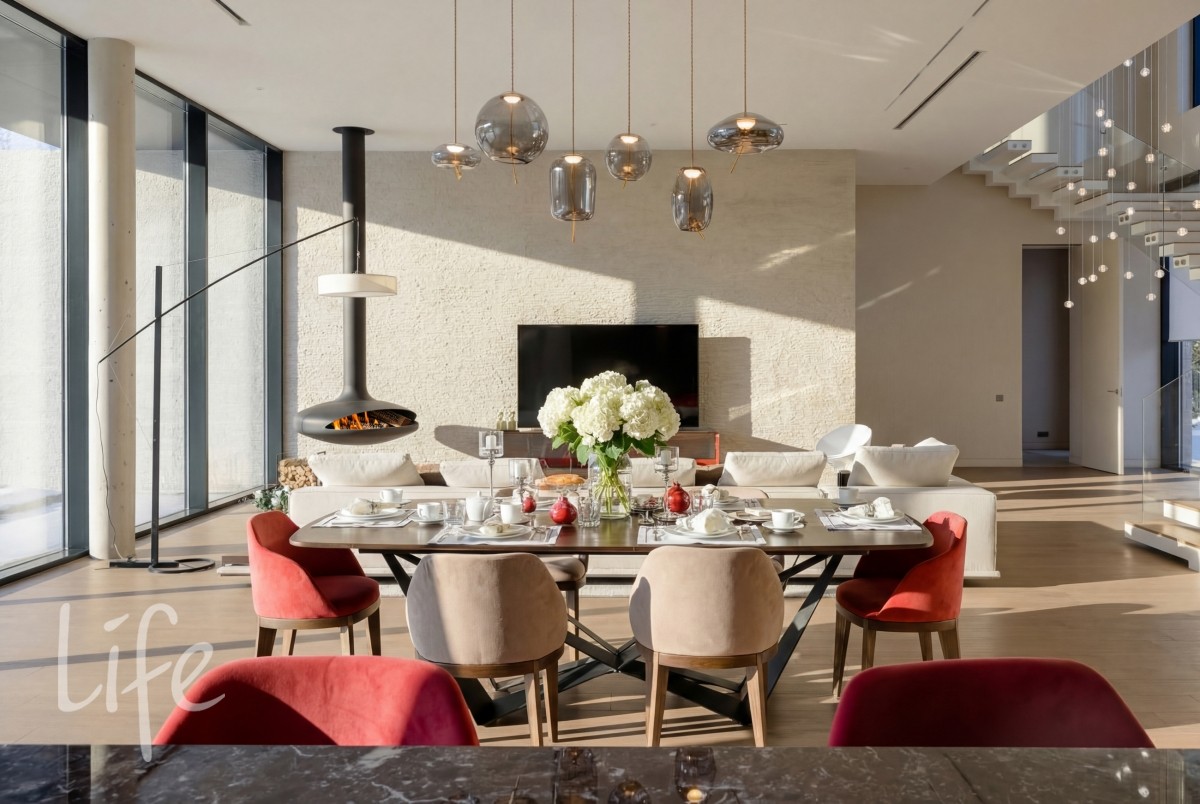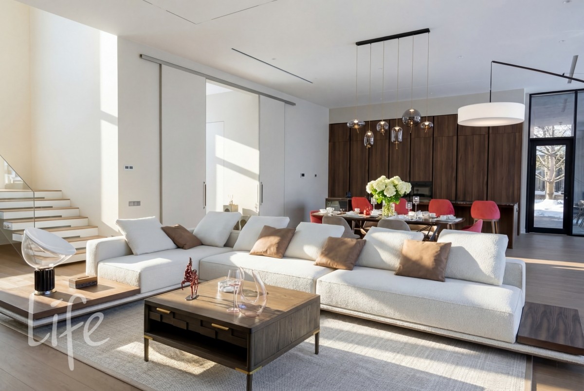Масштаб и свет: Высота потолков 3,7 м на первом этаже и 3,5 м на втором создают исключительное ощущение объема.