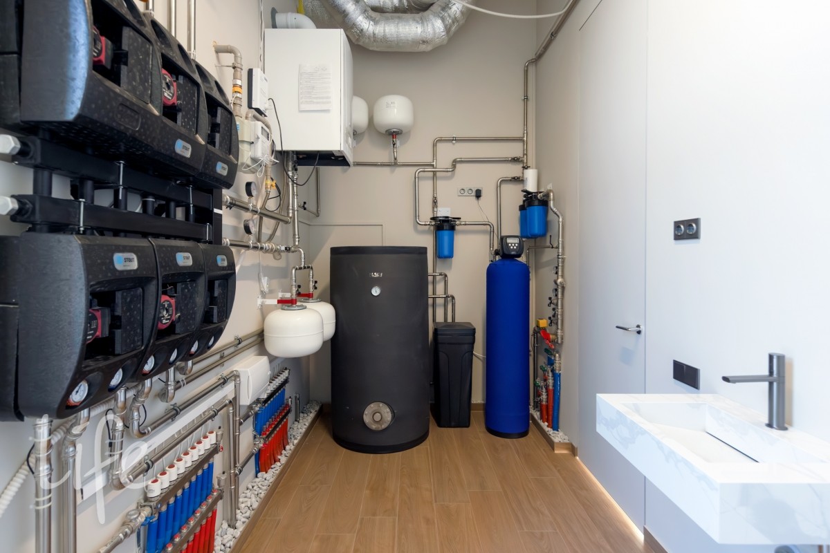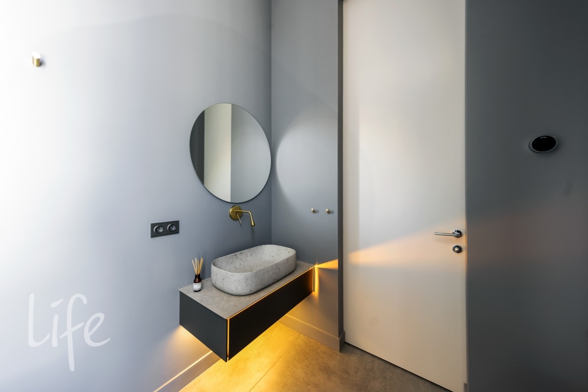 1 этаж: центральный холл и гостевой с/у. Единое пространство кухни-гостиной с дровяным камином и выходом на террасу. Гостевая спальня со своим санузлом. Функциональный блок: гардеробная при входе, постирочная, бойлерная с сервисной комнатой.
