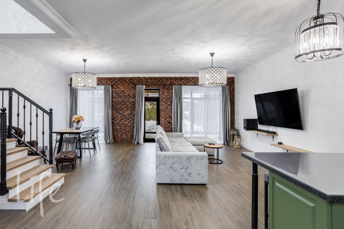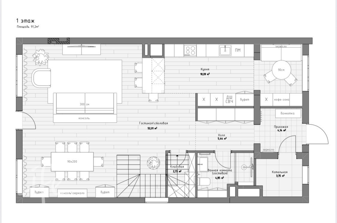 1 этаж: просторная гостиная с выходом на большую террасу и участок, кухня - столовая, гардеробная, с/у.