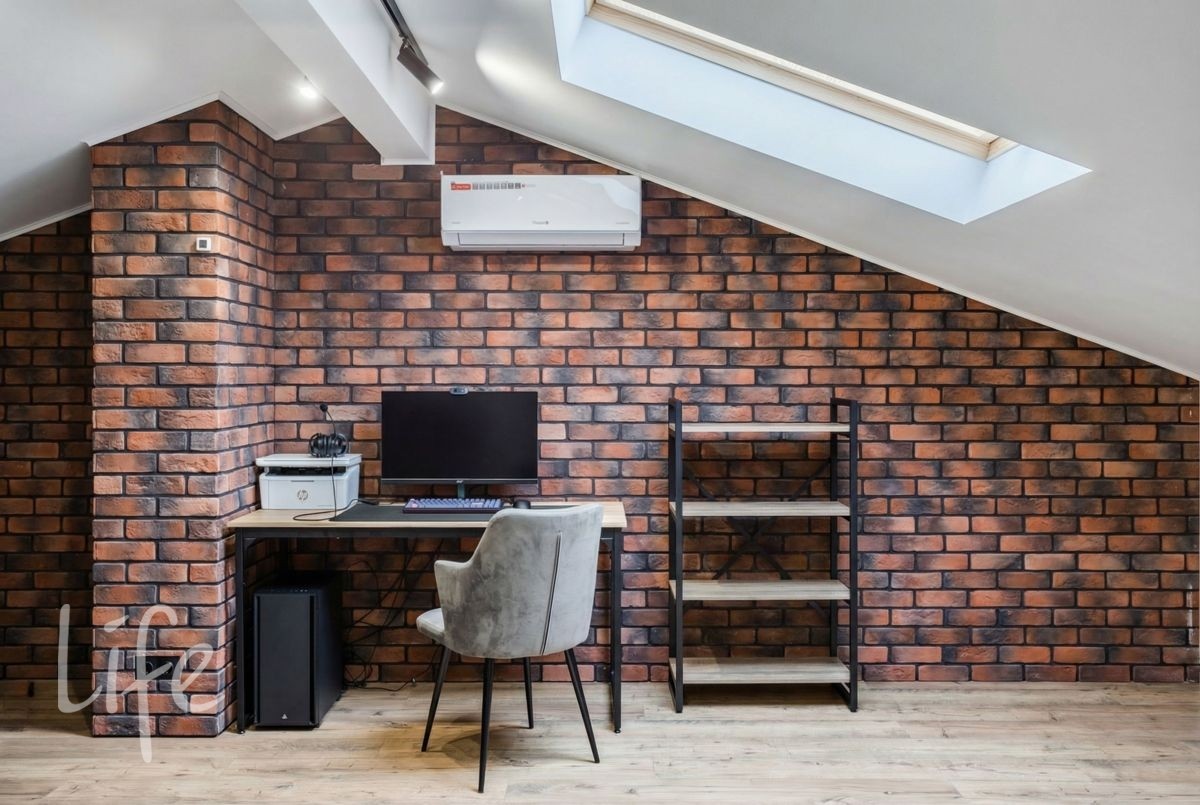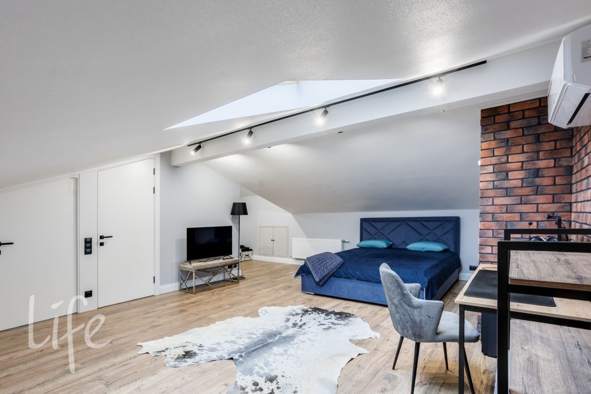 Мансарда: отдельная спальня с рабочей зоной и ванной комнатой.