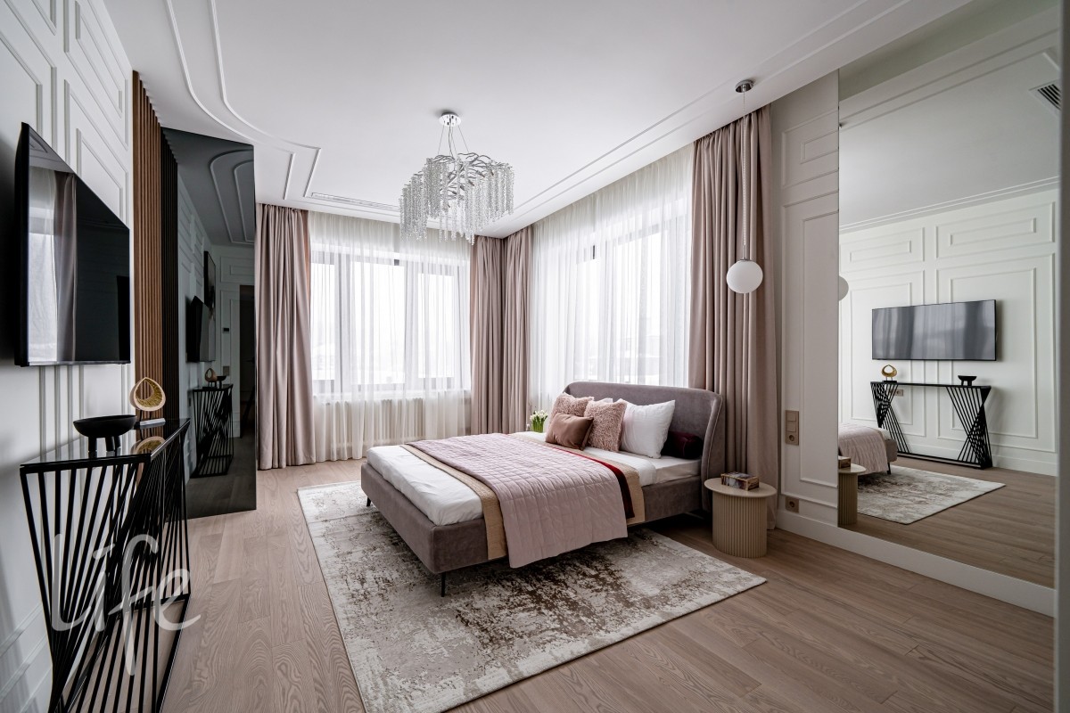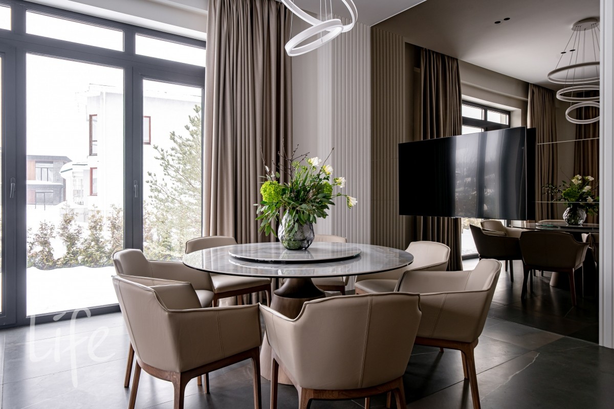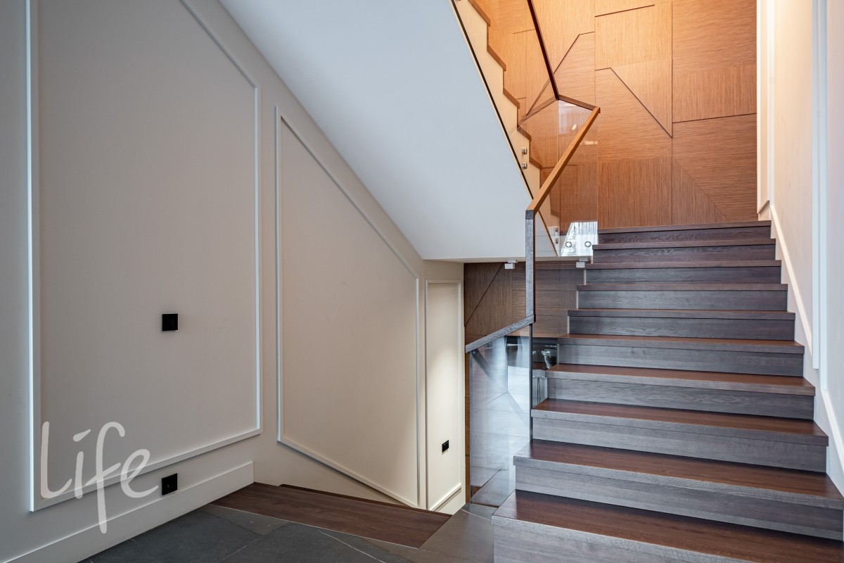 1 этаж: гостиная, кухня-столовая (Оборудована островом со встроенной вытяжкой и премиальнойтехникой ASKO, включая винный шкаф и кофемашину). Мебель от Dantone Home. Мастер-спальня, гостевая зона (спальня с собственным с/у), просторный холл, постирочная, гостевой с/у и гараж на 2 авто и 2 мотоцикла.