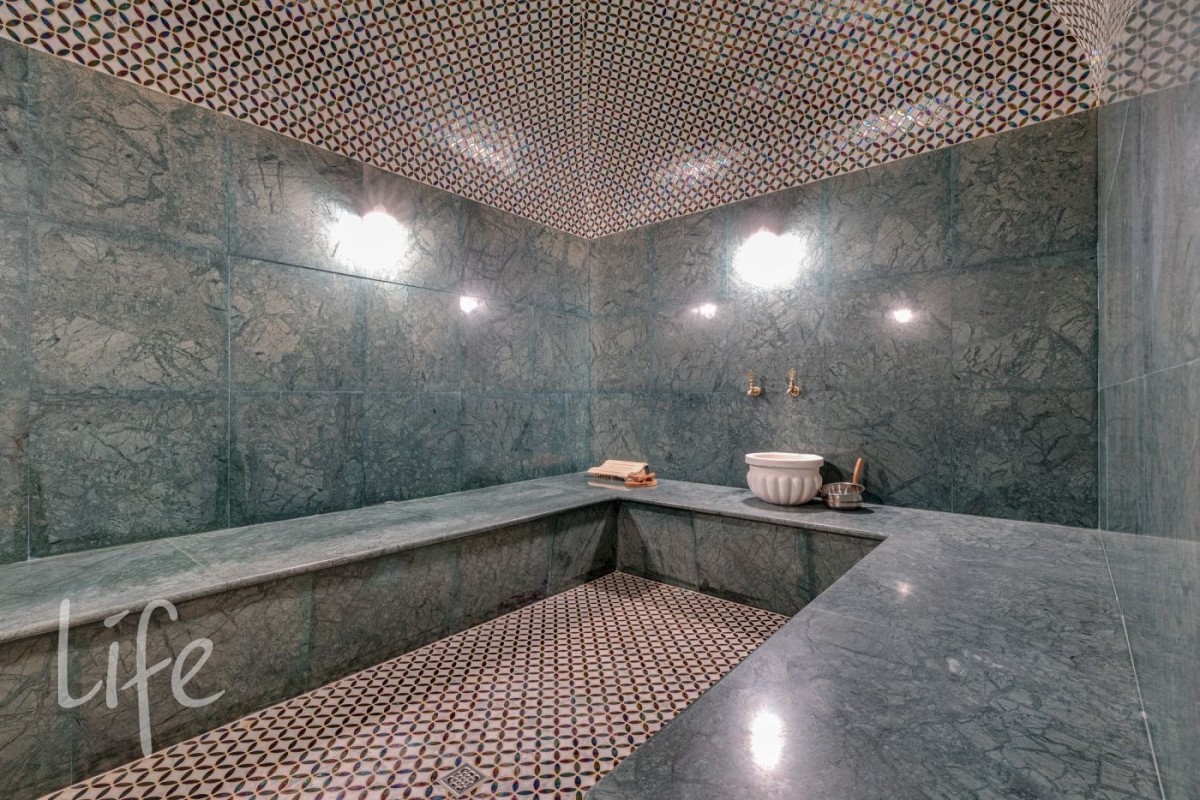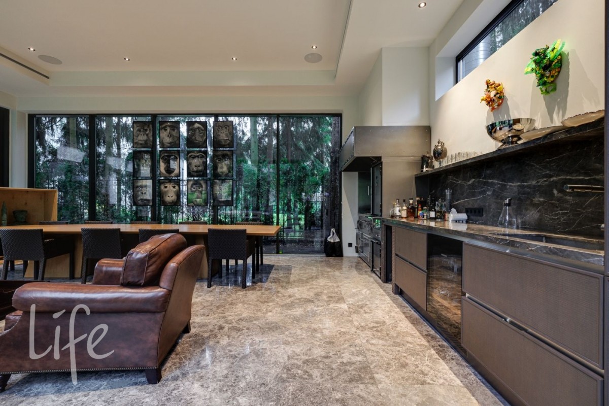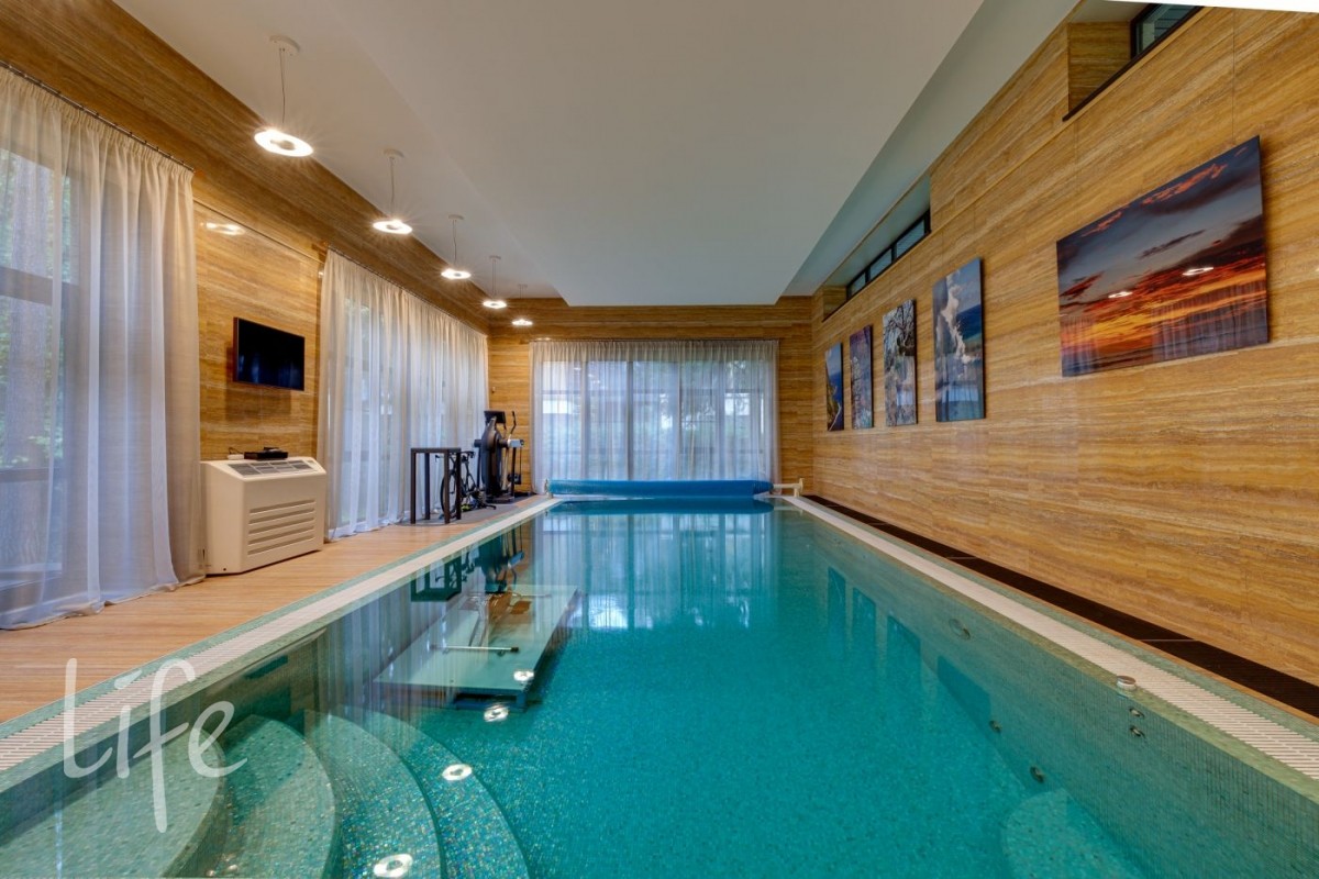 1 этаж: прихожая, гардеробная комната, гостевой с/у, кухня с выходом на террасу, кладовая при кухне, столовая, гостиная с камином и выходом на террасу, учебная/игровая комната, гостевая спальня с с/у, SPA-зона с выходом на террасу: комната отдыха, бассейн (10/4), хаммам, с/у с душевой; гараж на 2 м.м., квартира для персонала с отдельным входом.