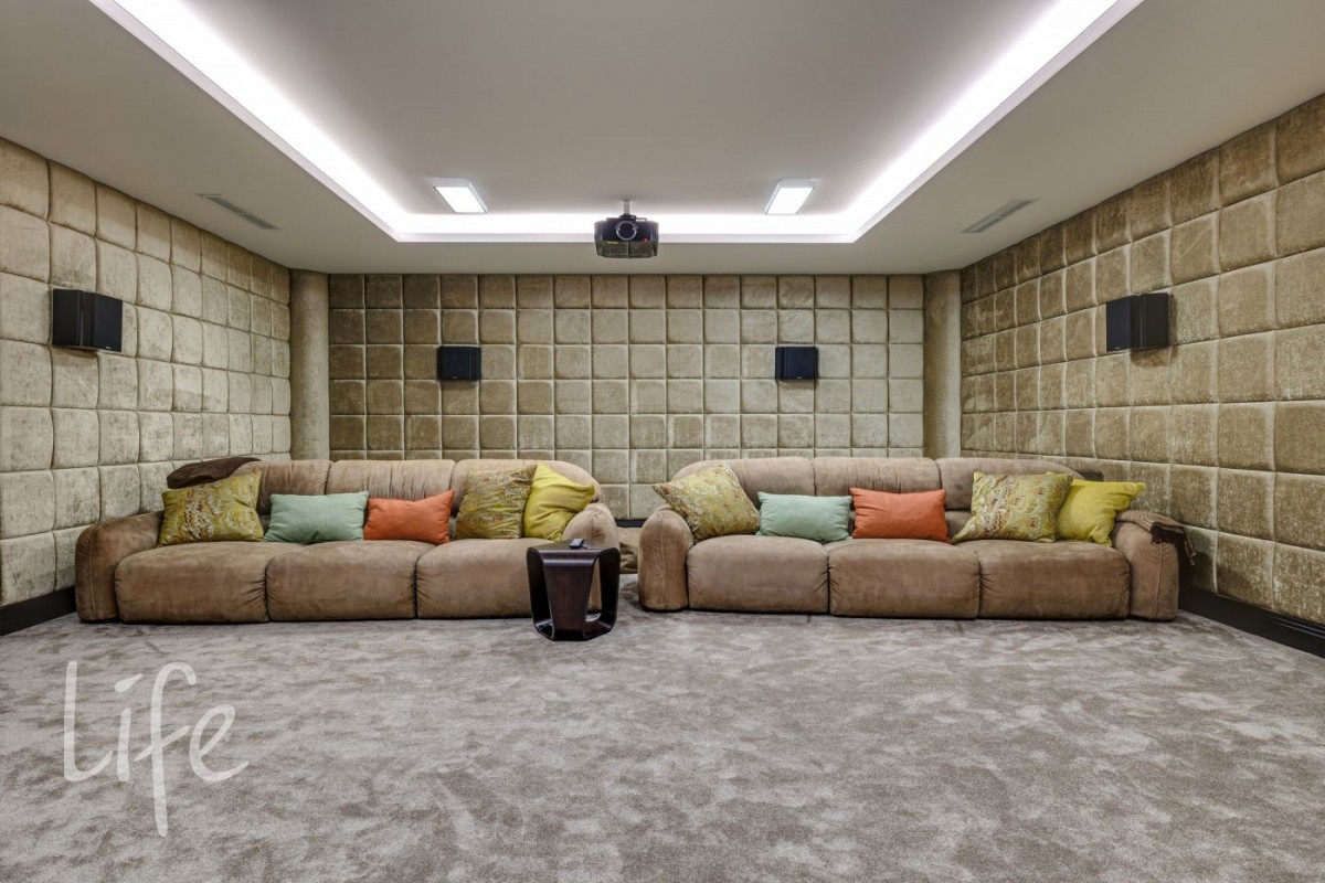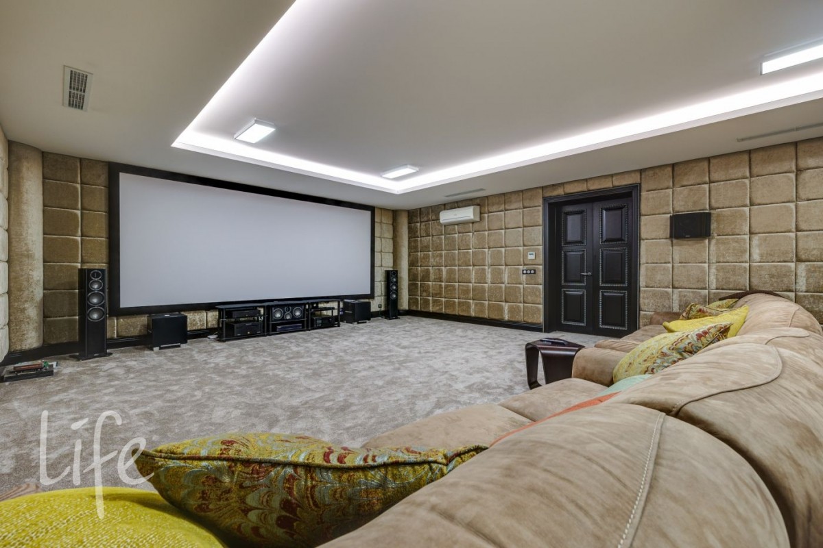 Цоколь: холл-библиотека, спортивный зал, винная комната, санузел, кинотеатр, сезонная гардеробная, постирочная, котельная, серверная, выход на улицу.