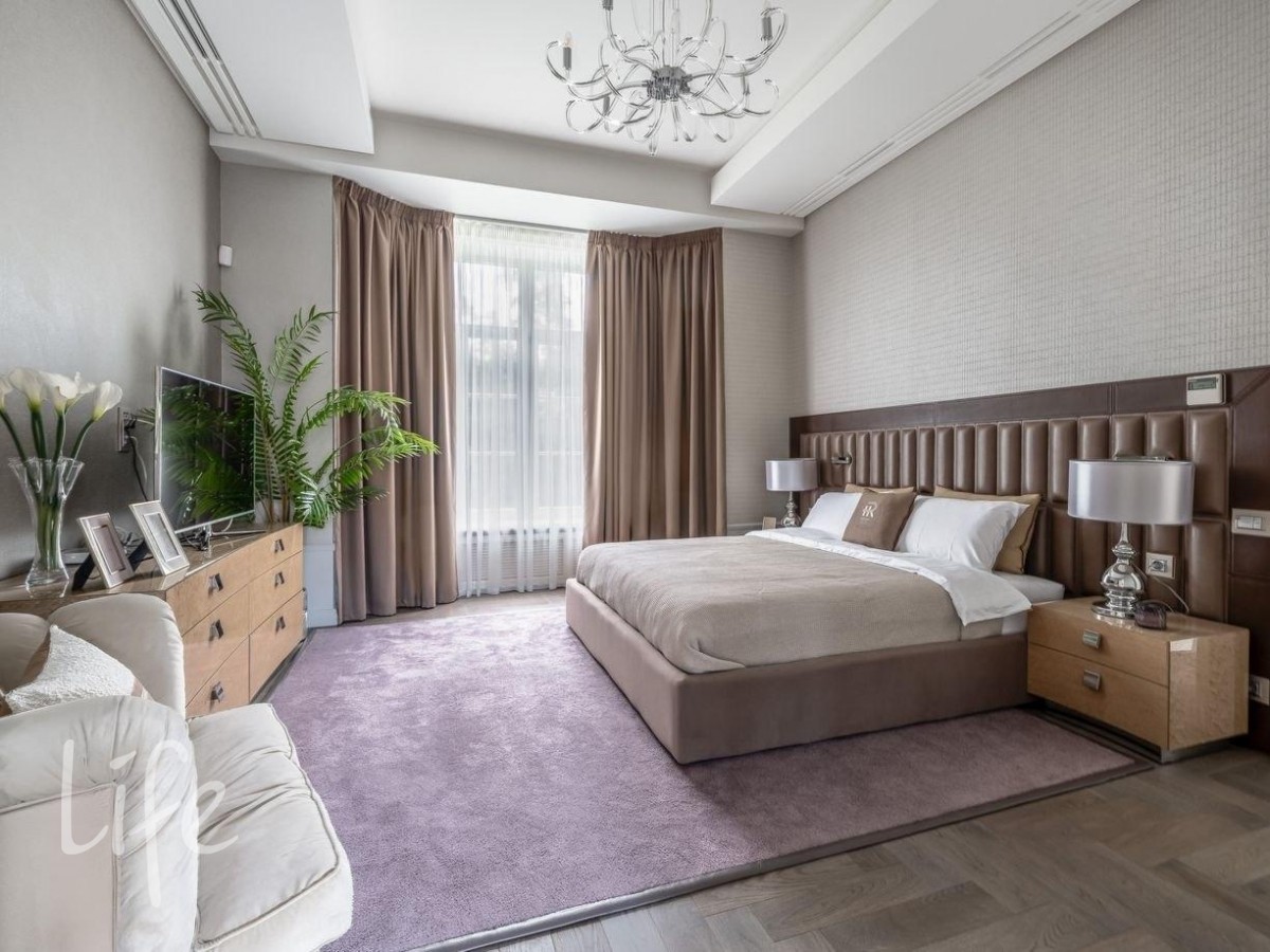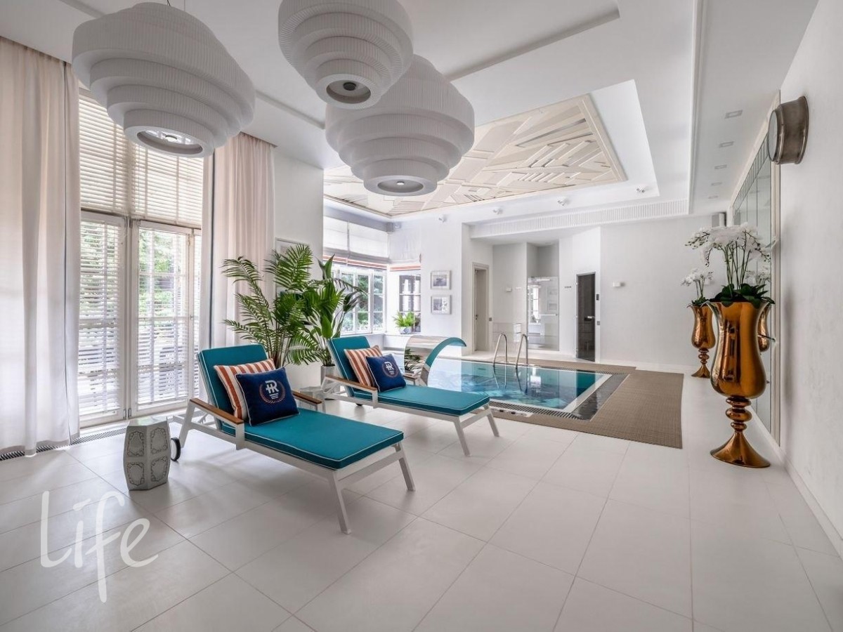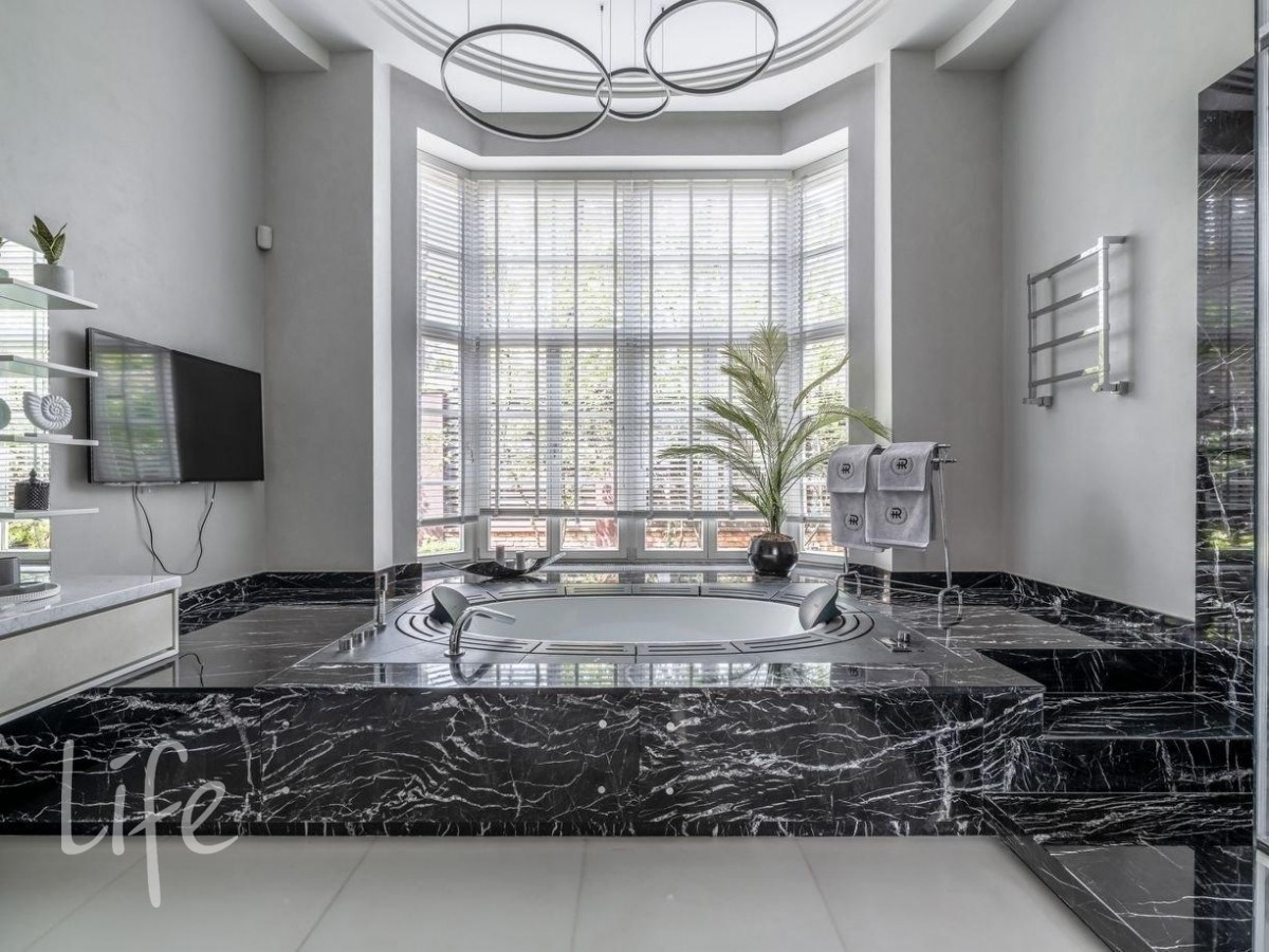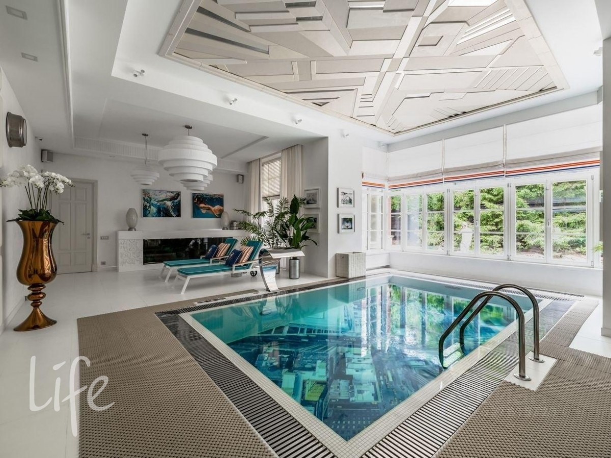 Комфортная планировка с пятью спальнями, гостиной, зоной СПА с бассейном подойдет для большой дружной семьи, а зона СПА с бассейном скрасит досуг. Есть блок для обслуживающего персонала в отдельно стоящем строении.