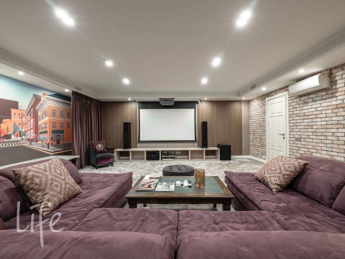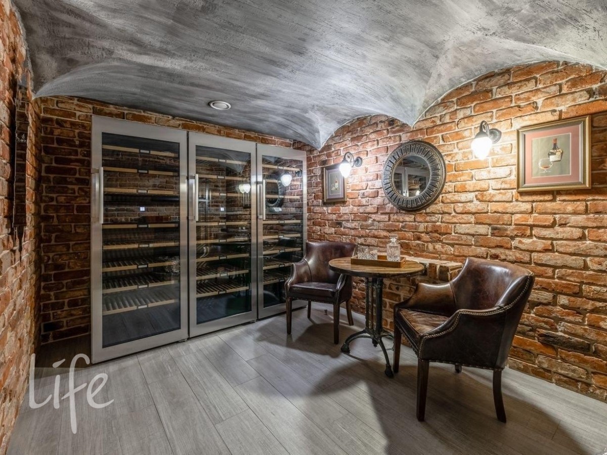 Цоколь: домашний кинотеатр, винный погреб, гардеробная и кладовая комнаты, черновая кухня, сейфовая, комната персонала, постирочная.