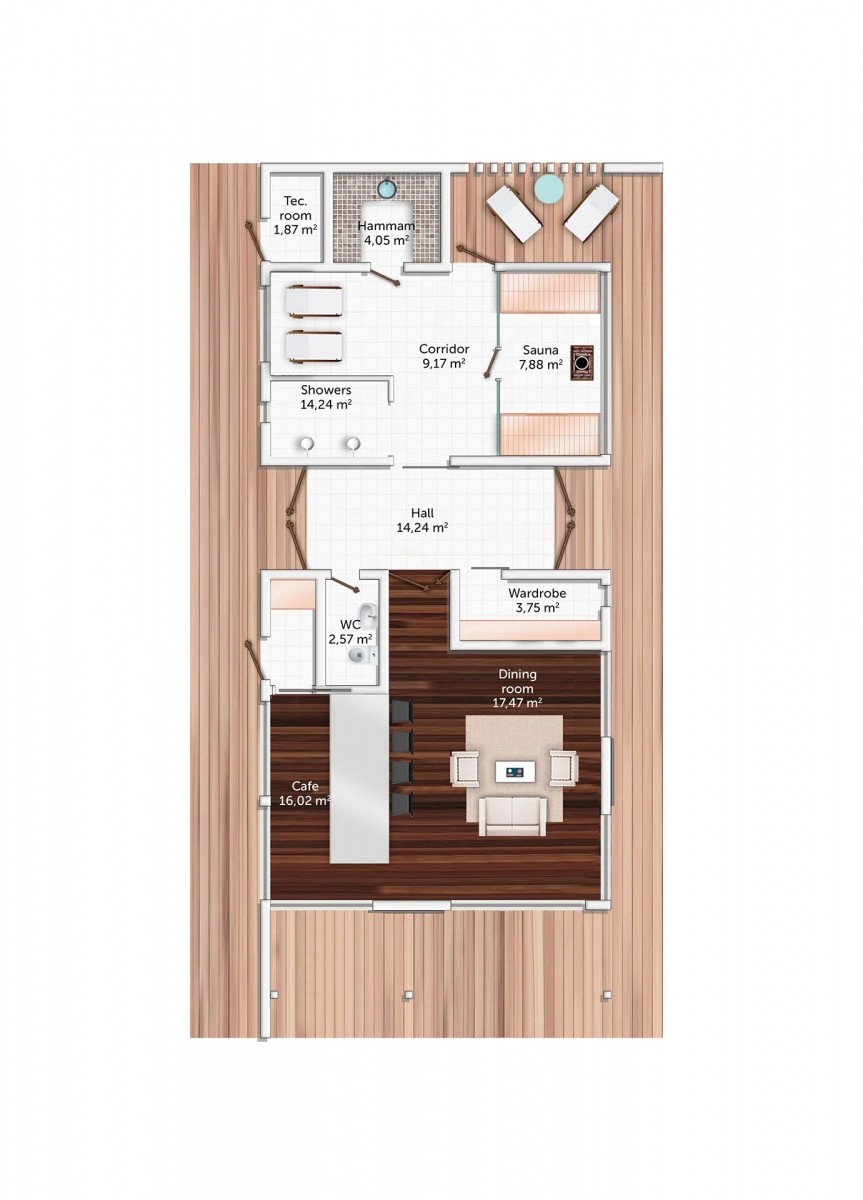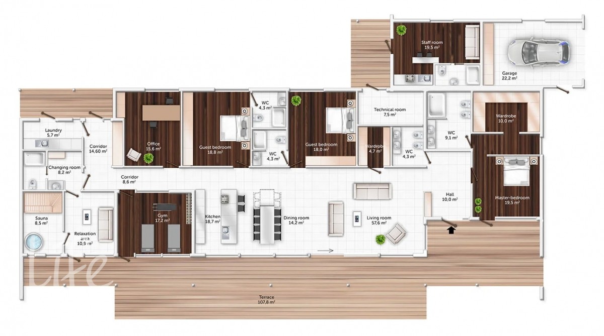 1 этаж: террасы 129 м2, 4 спальни, 5 санузлов.