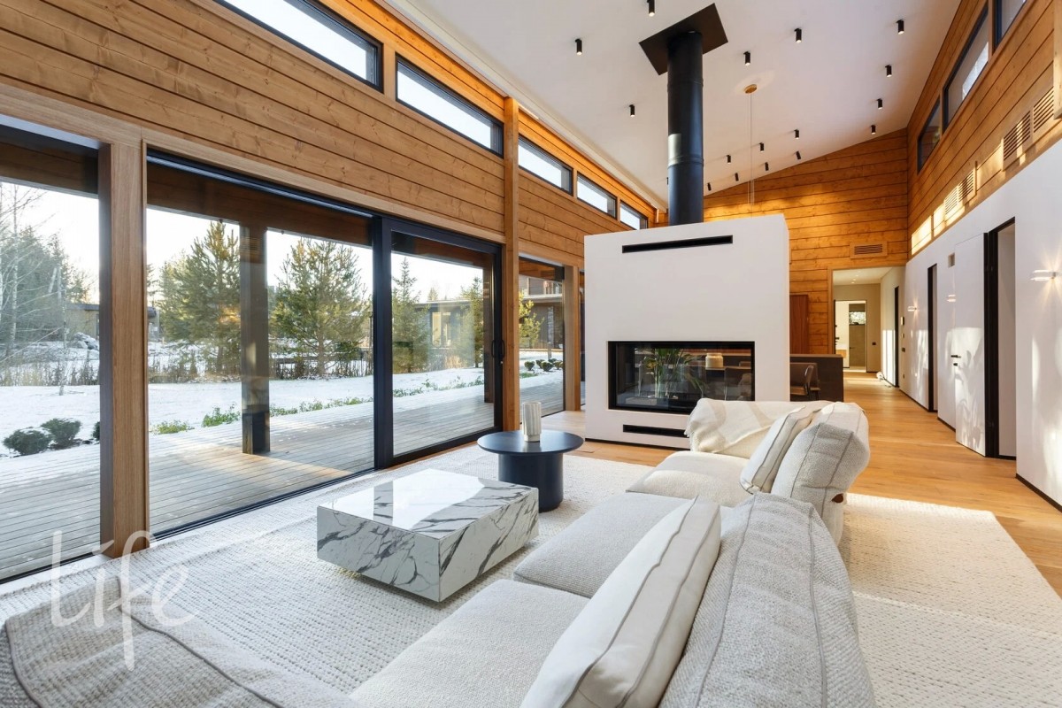 — Просторная двусветная гостиная с панорамным остеклением + с окнами в кровле