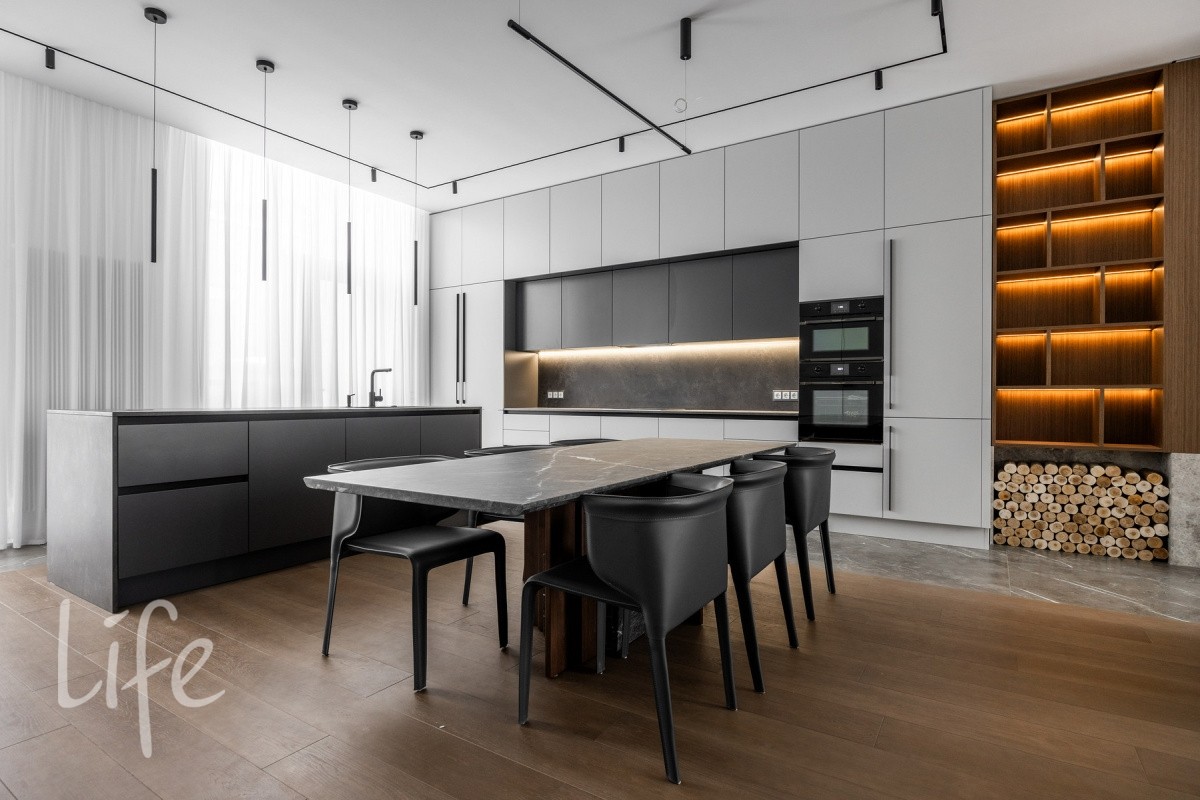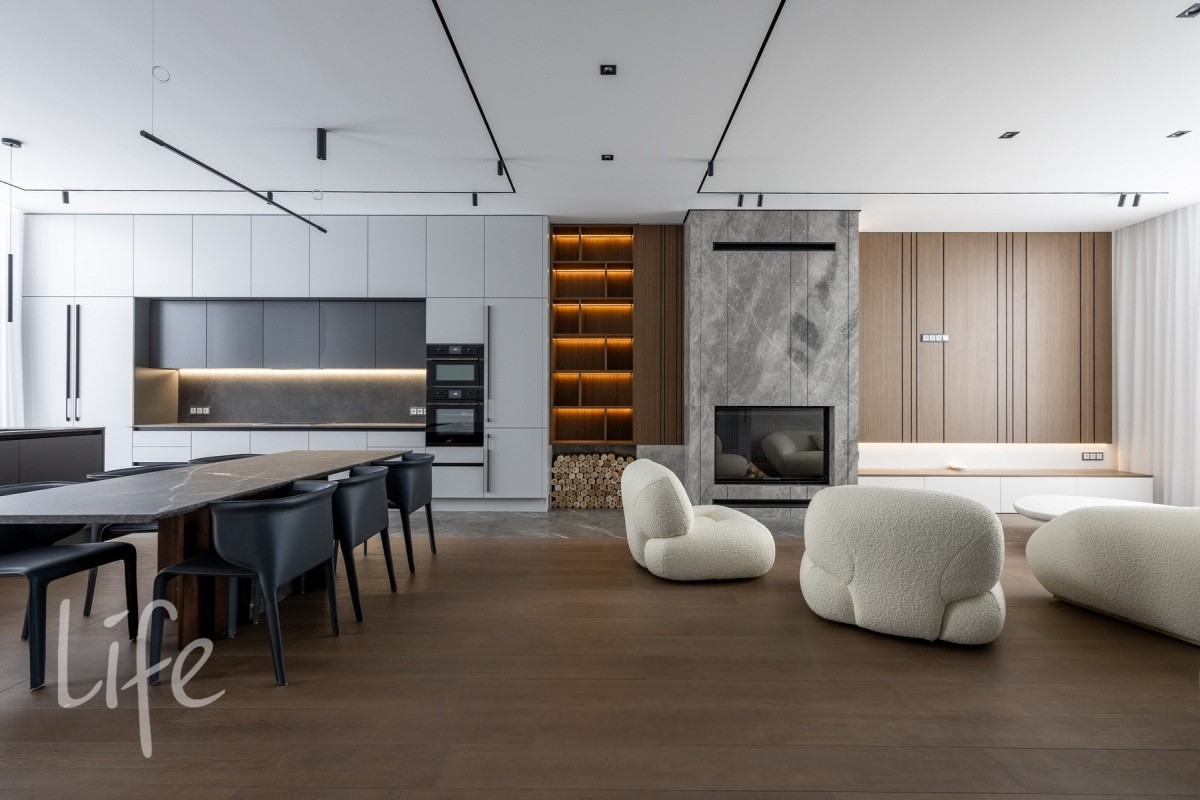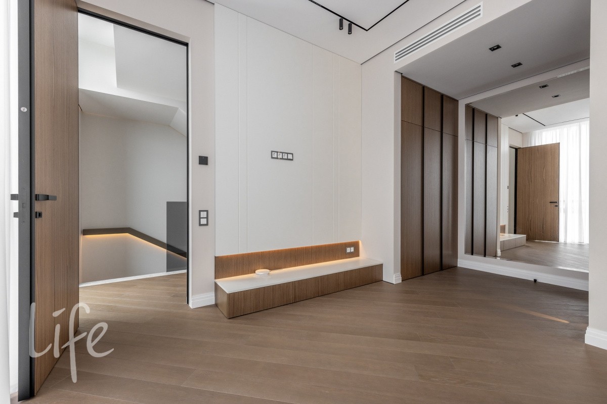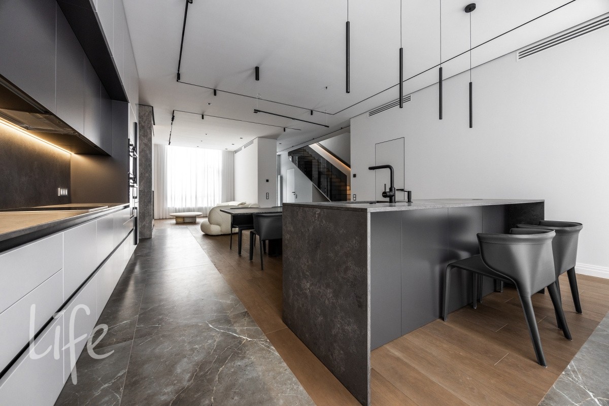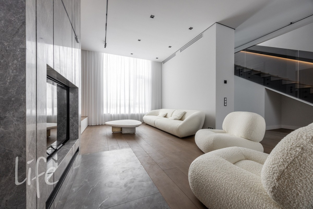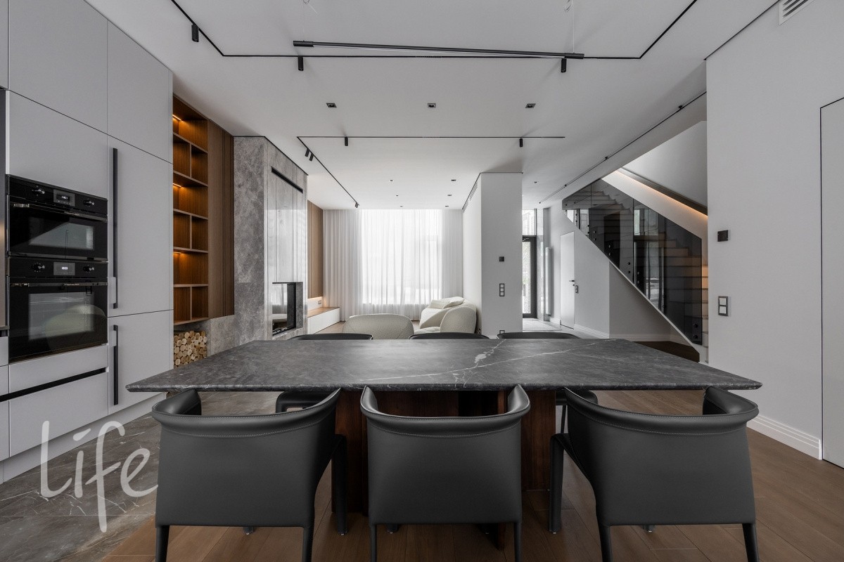 В таунхаусе выполнен дизайнерский ремонт в современном стиле с использованием премиальных материалов. В интерьере применены натуральный камень, деревянные панели, дорогие столярные изделия и широкоформатный керамогранит. Многоуровневая подсветка подчеркивает архитектуру пространства и создает атмосферу уюта в