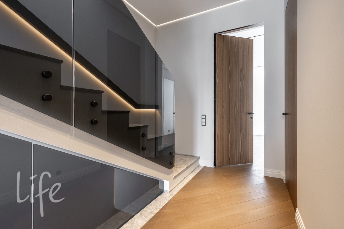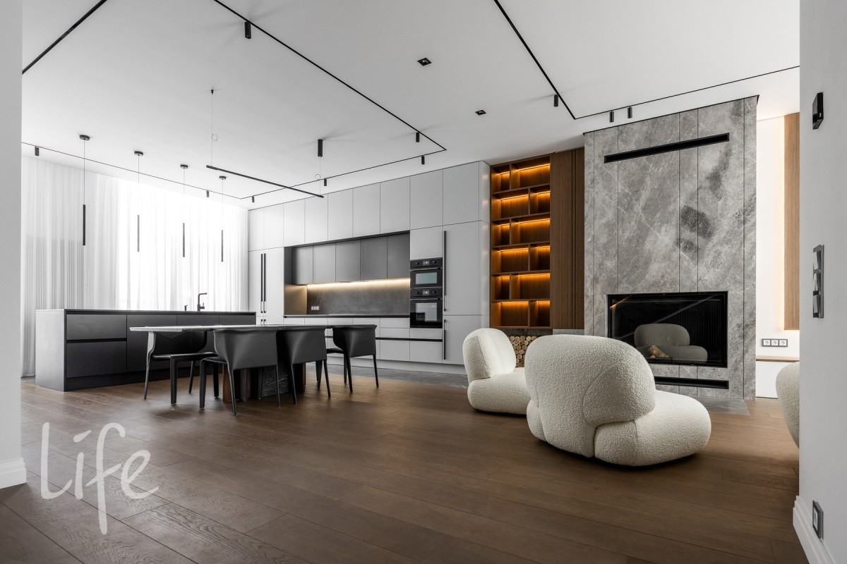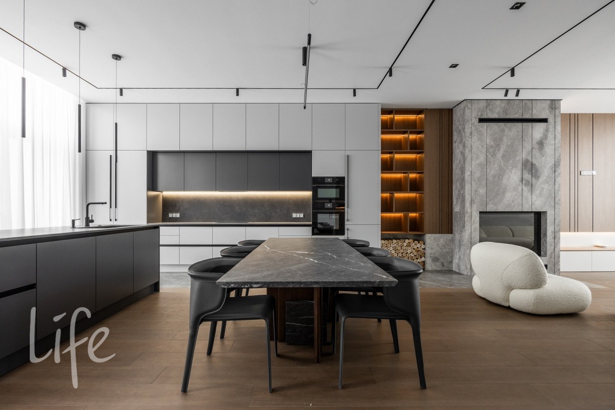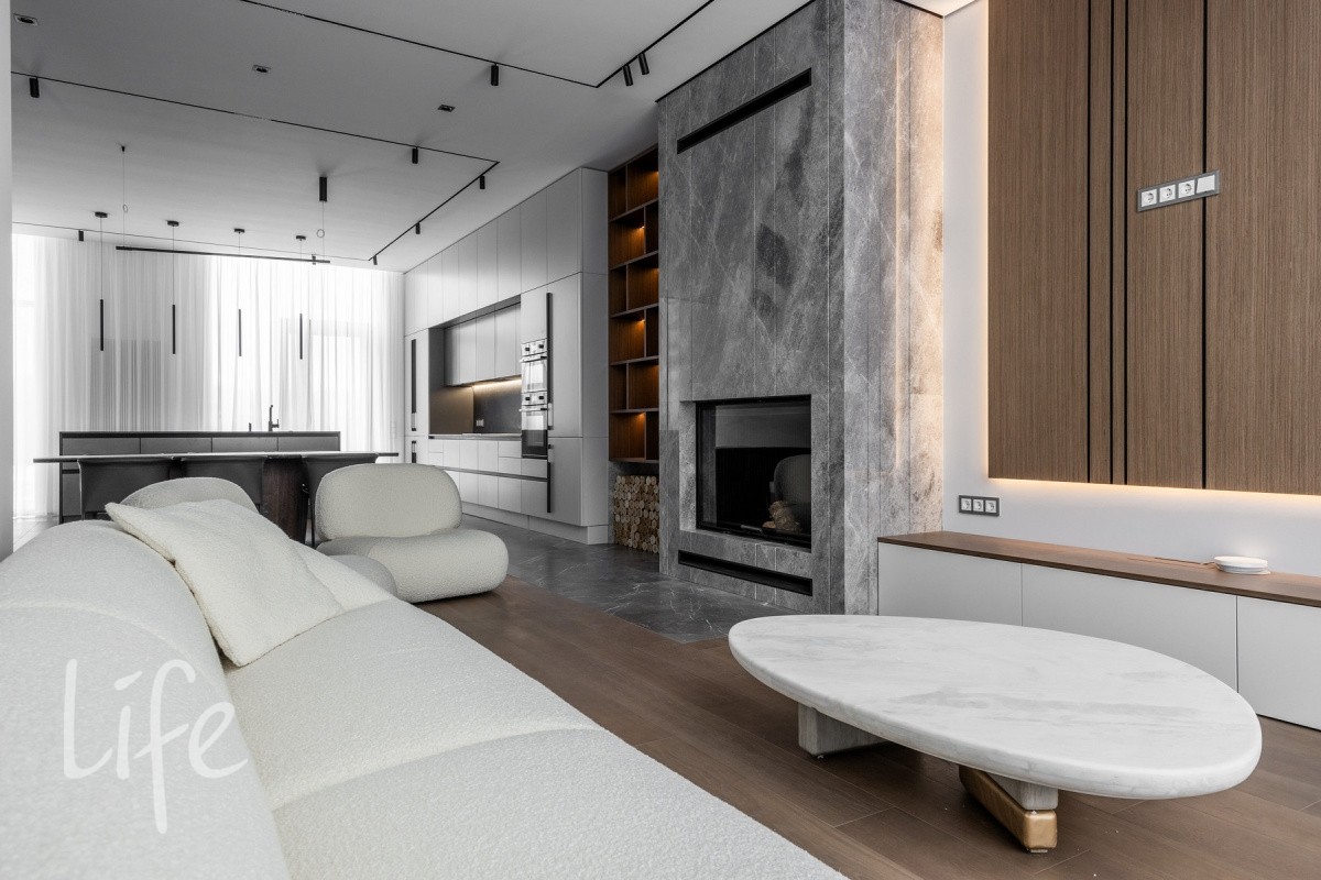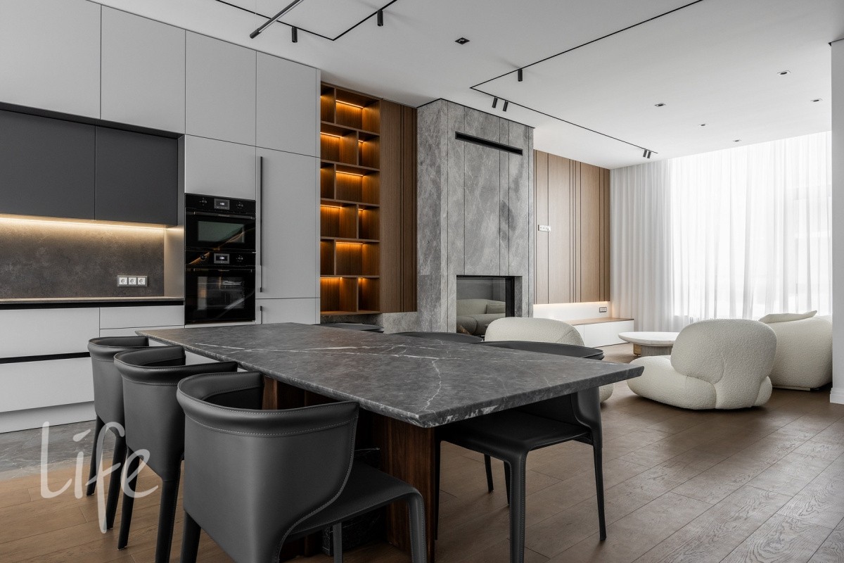 В таунхаусе выполнен дизайнерский ремонт в современном стиле с использованием премиальных материалов. В интерьере применены натуральный камень, деревянные панели, дорогие столярные изделия и широкоформатный керамогранит. Многоуровневая подсветка подчеркивает архитектуру пространства и создает атмосферу уюта в