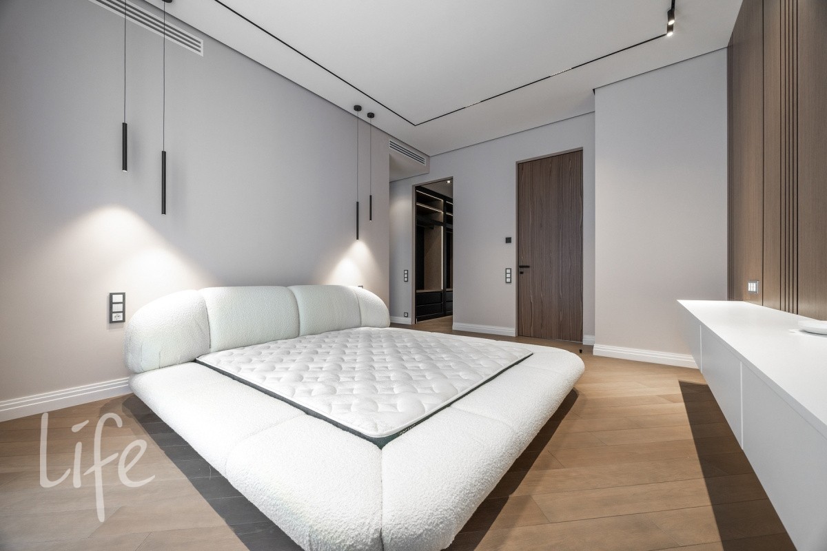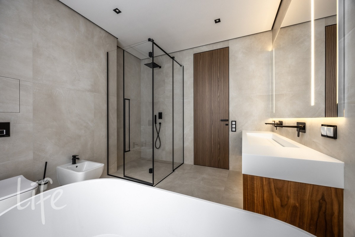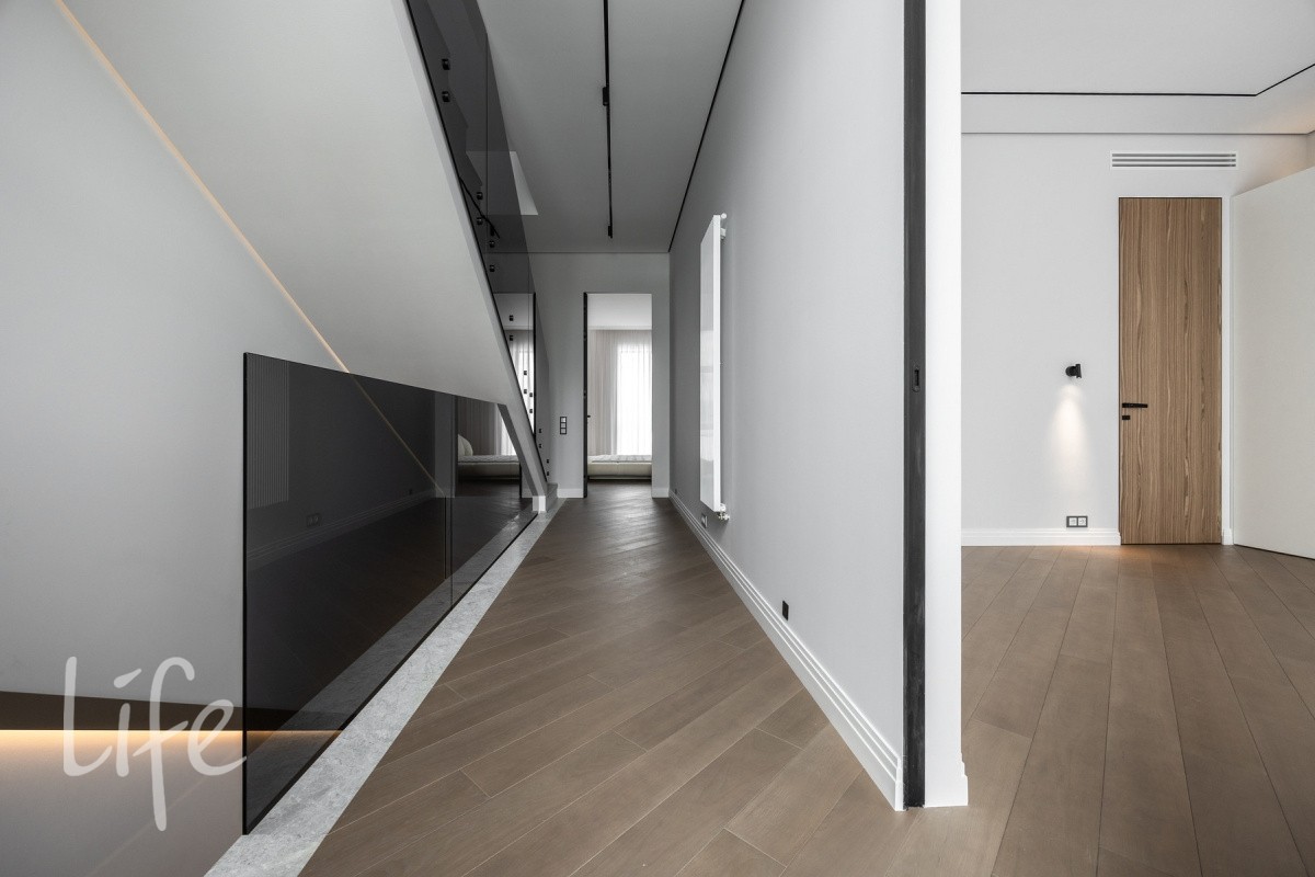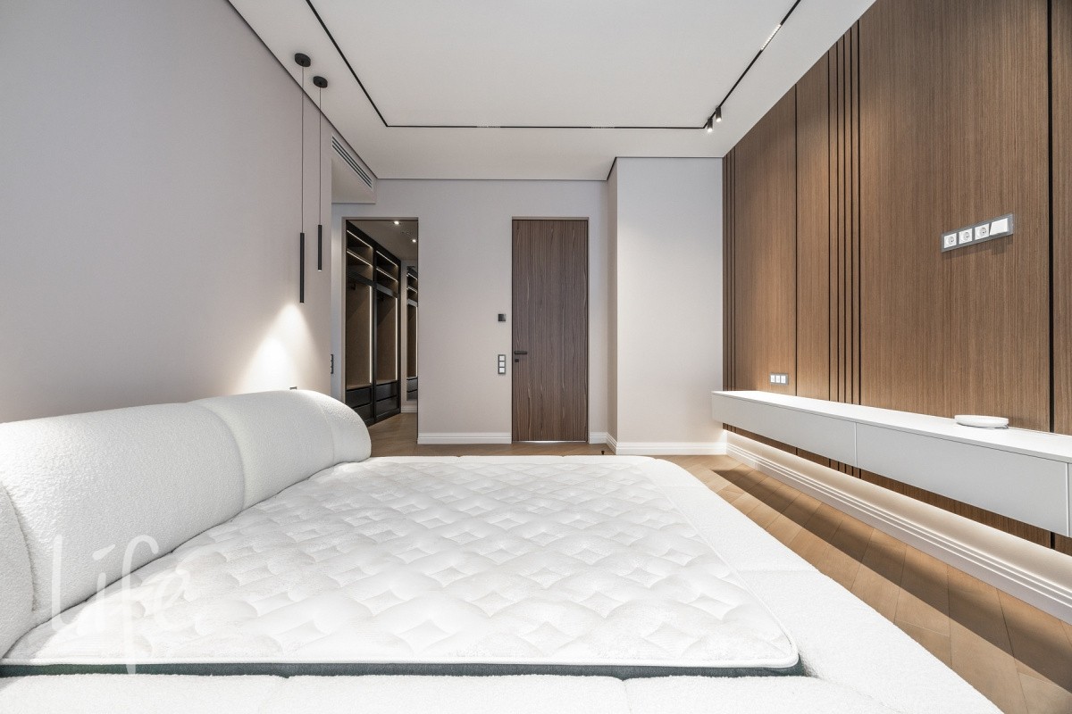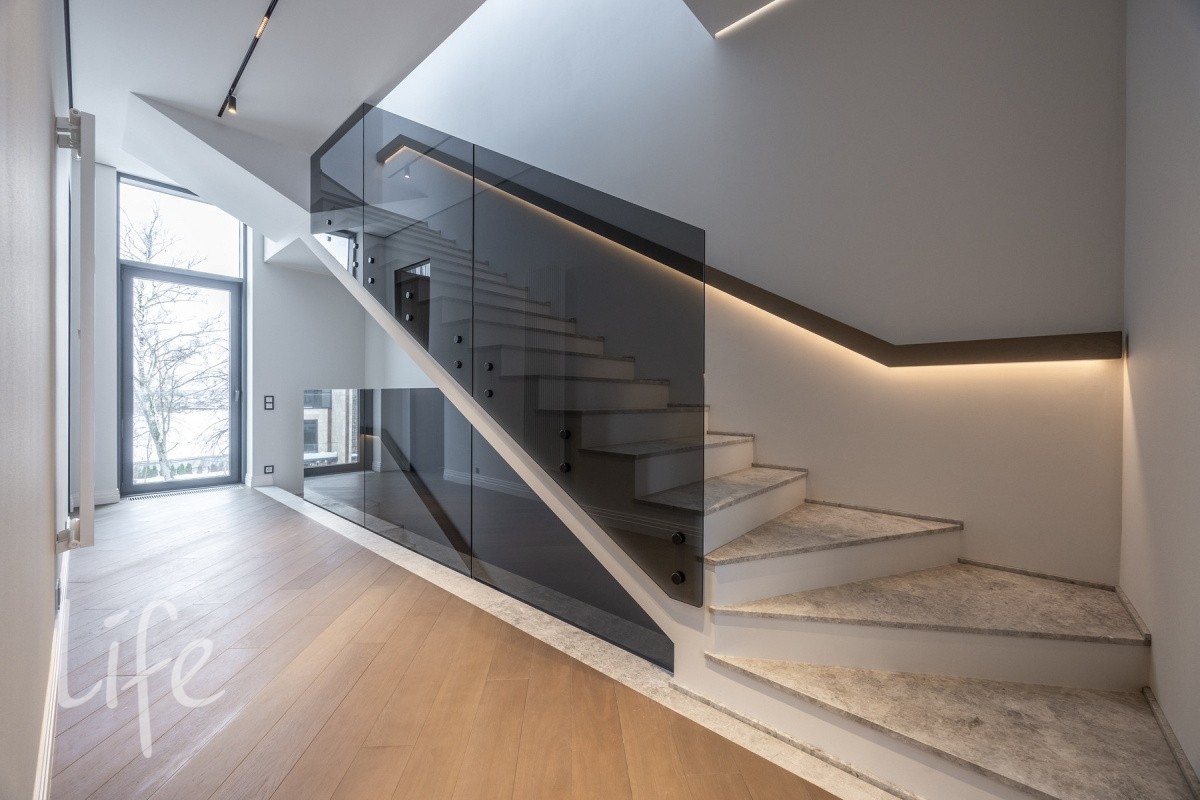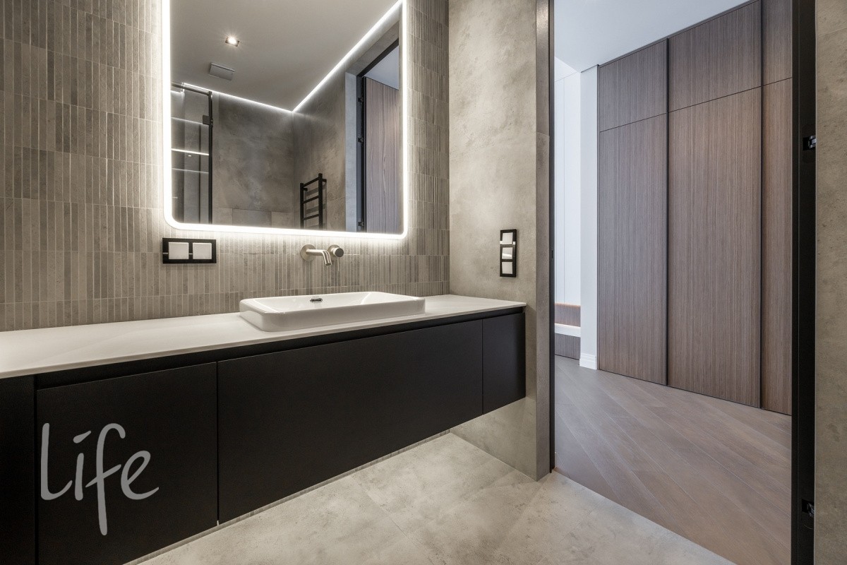 В таунхаусе выполнен дизайнерский ремонт в современном стиле с использованием премиальных материалов. В интерьере применены натуральный камень, деревянные панели, дорогие столярные изделия и широкоформатный керамогранит. Многоуровневая подсветка подчеркивает архитектуру пространства и создает атмосферу уюта в