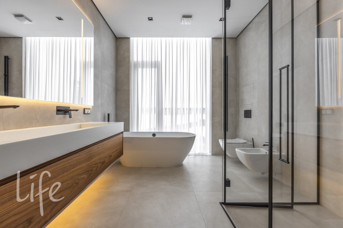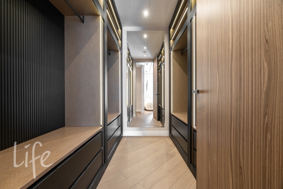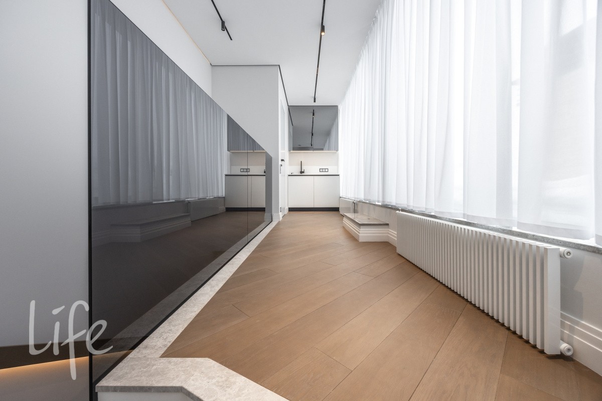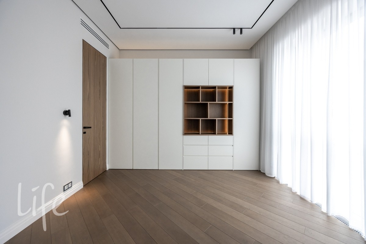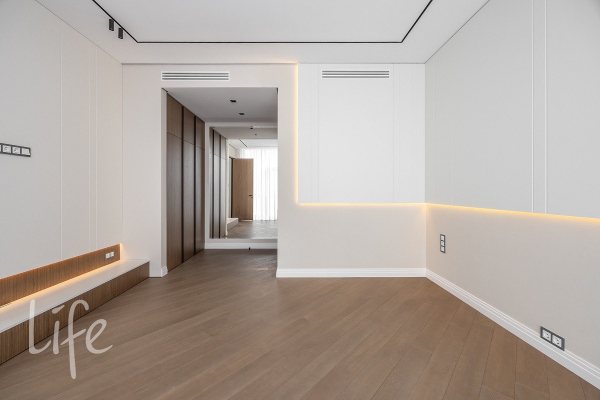 В таунхаусе выполнен дизайнерский ремонт в современном стиле с использованием премиальных материалов. В интерьере применены натуральный камень, деревянные панели, дорогие столярные изделия и широкоформатный керамогранит. Многоуровневая подсветка подчеркивает архитектуру пространства и создает атмосферу уюта в