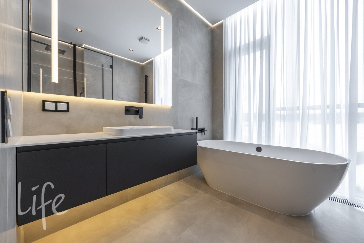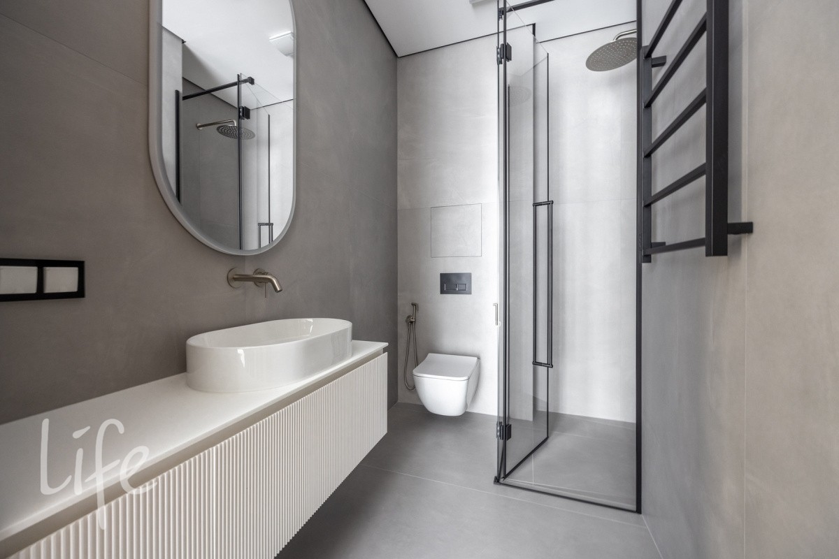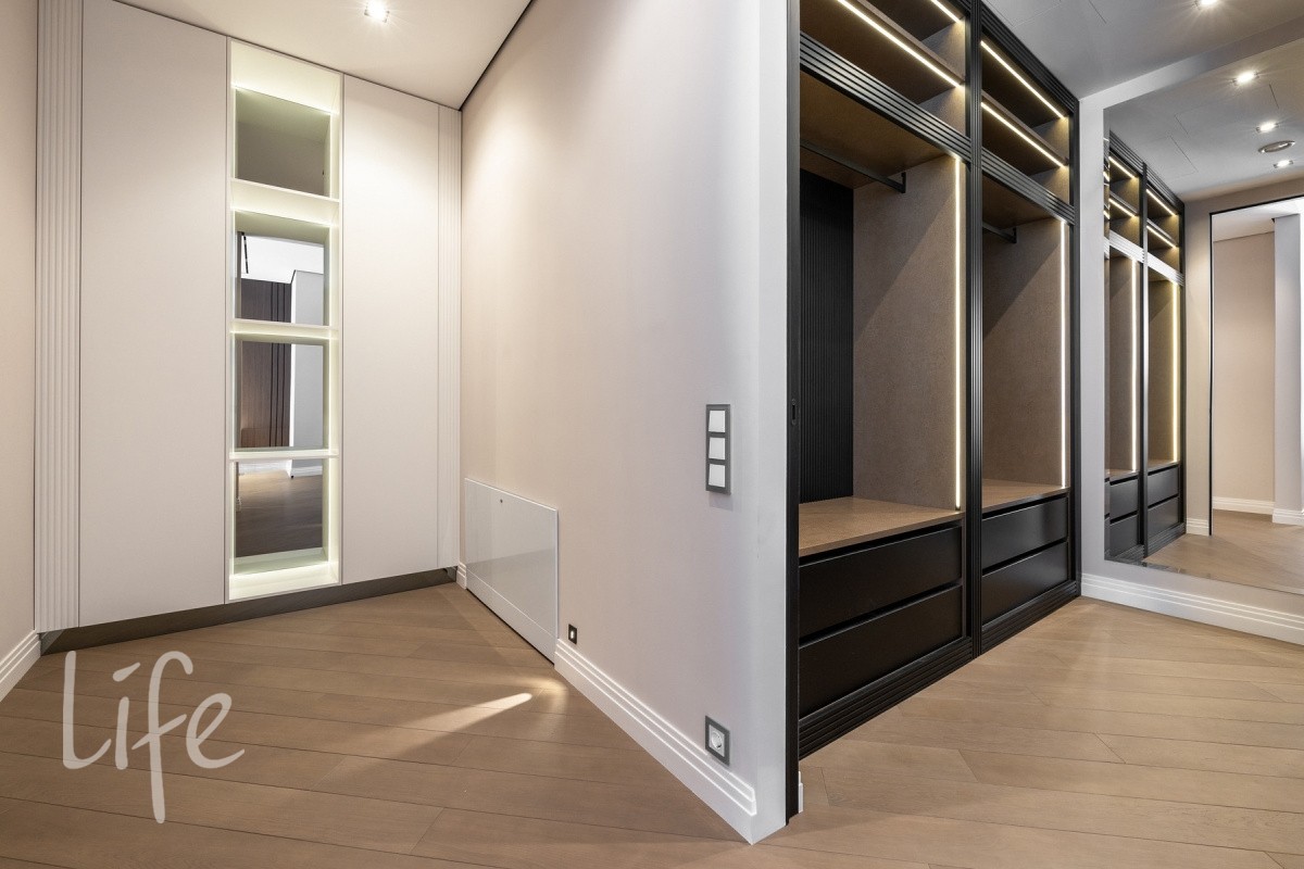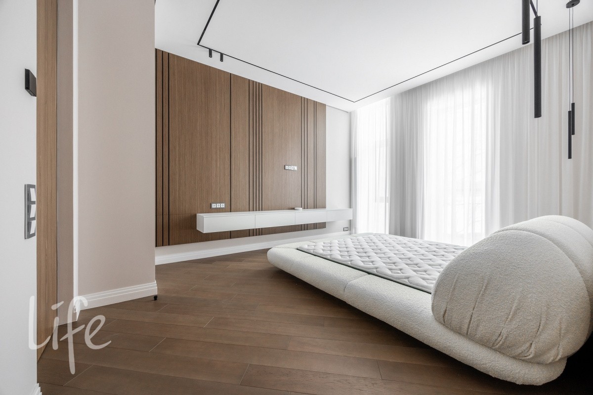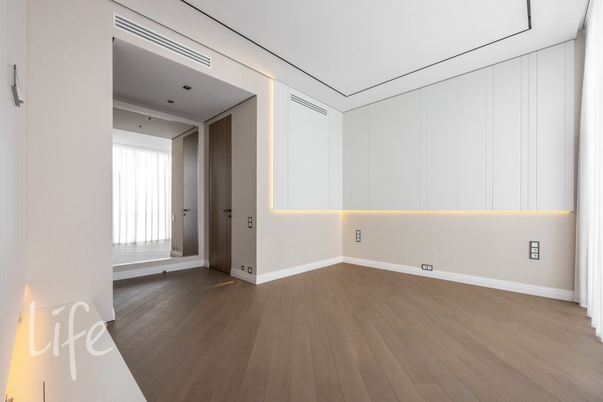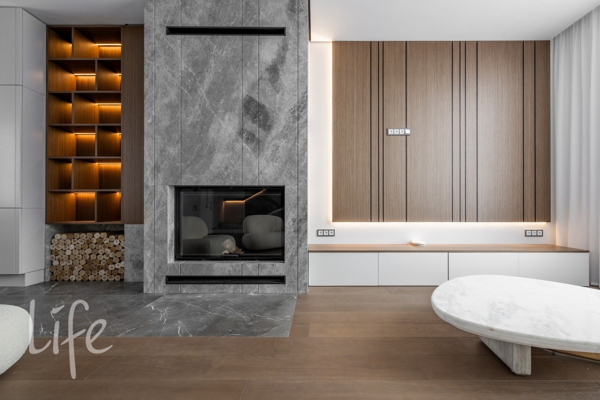 В таунхаусе выполнен дизайнерский ремонт в современном стиле с использованием премиальных материалов. В интерьере применены натуральный камень, деревянные панели, дорогие столярные изделия и широкоформатный керамогранит. Многоуровневая подсветка подчеркивает архитектуру пространства и создает атмосферу уюта в