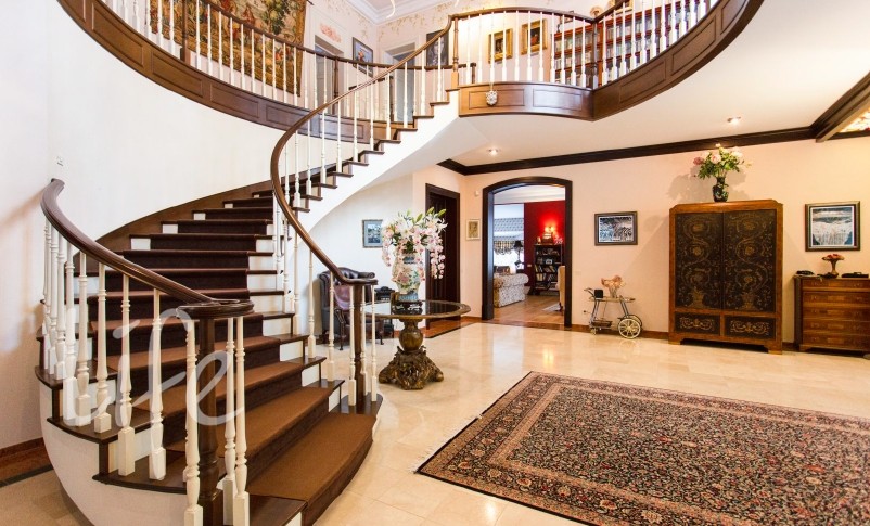 1 этаж: холл с парадной лестницей, гостиная с камином и бильярдной зоной, зимний сад, спорт зал, су с душем, кабинет, столовая, кухня, кладовая, постирочная.