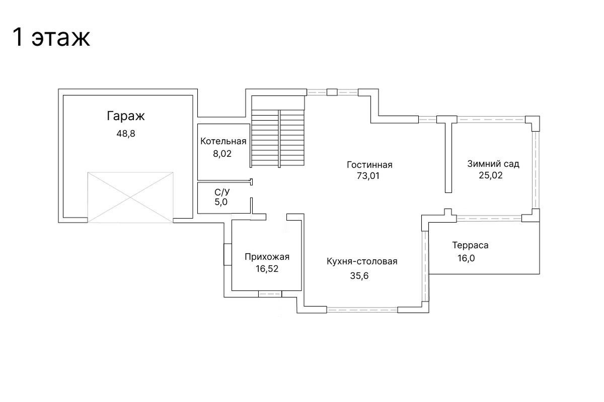 1 этаж: прихожая, с/у, котельная, кухня-гостиная столовая единым пространством, зимний сад (спальня), гараж на 2 авто.