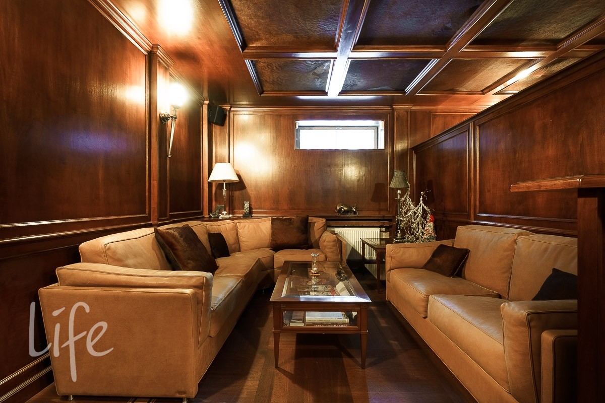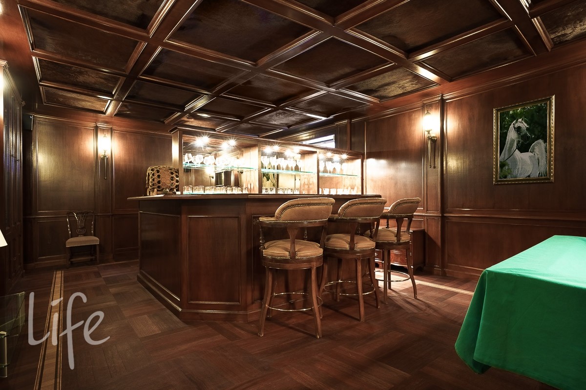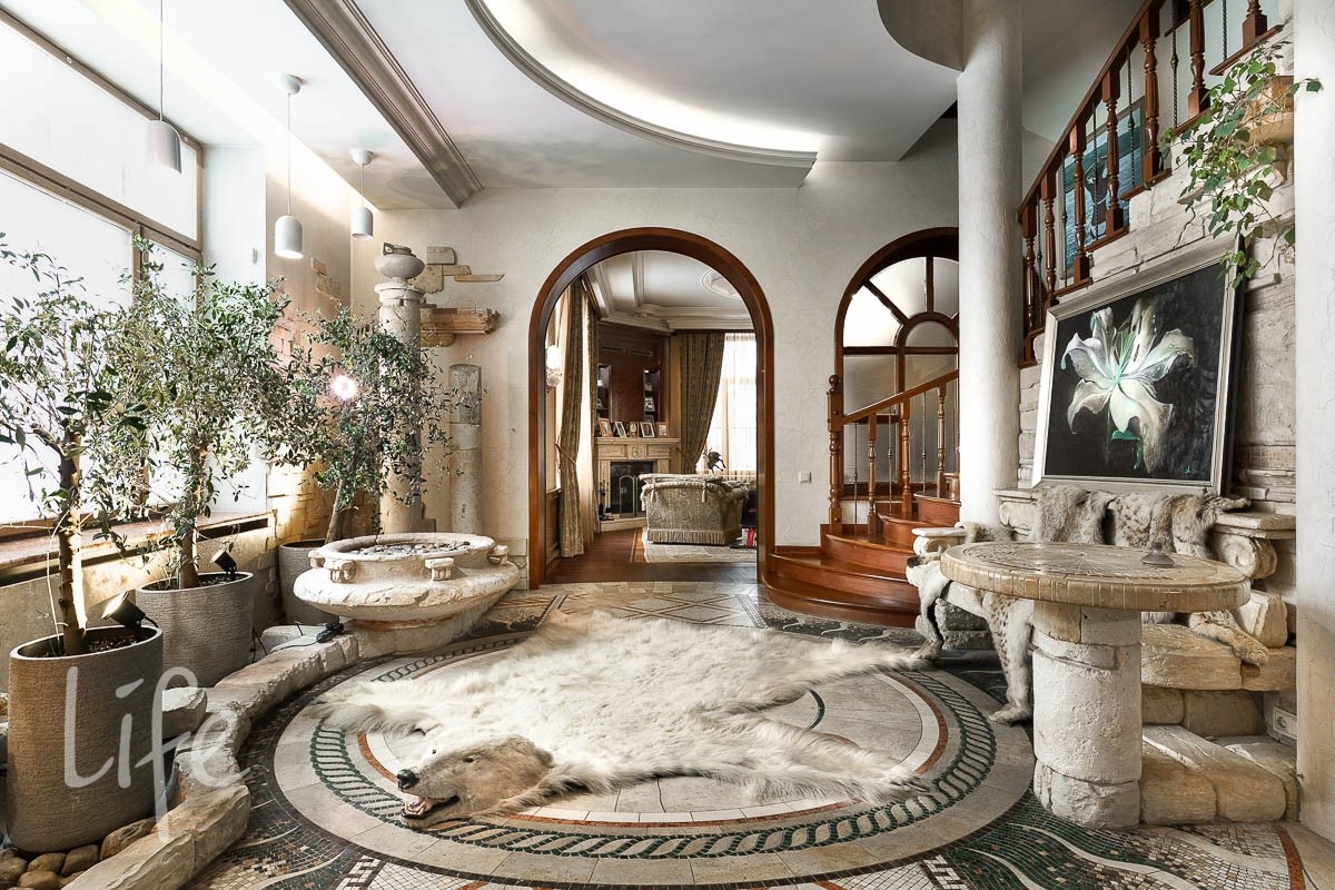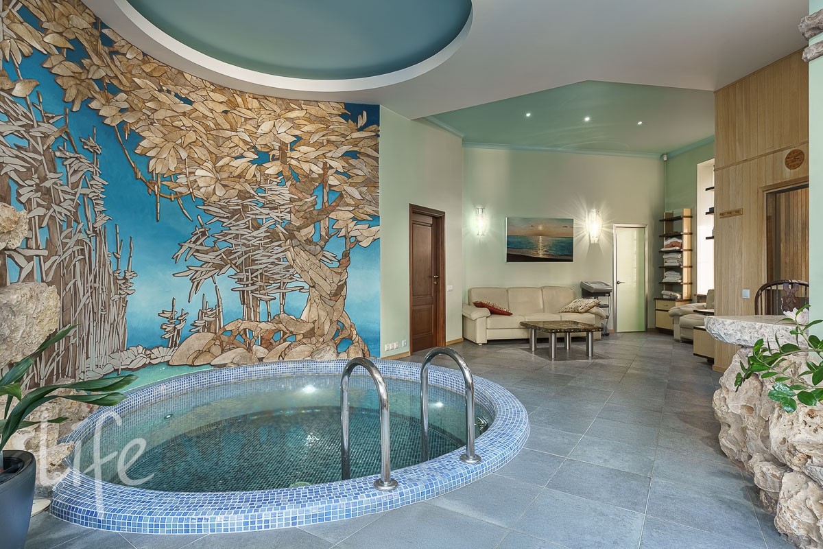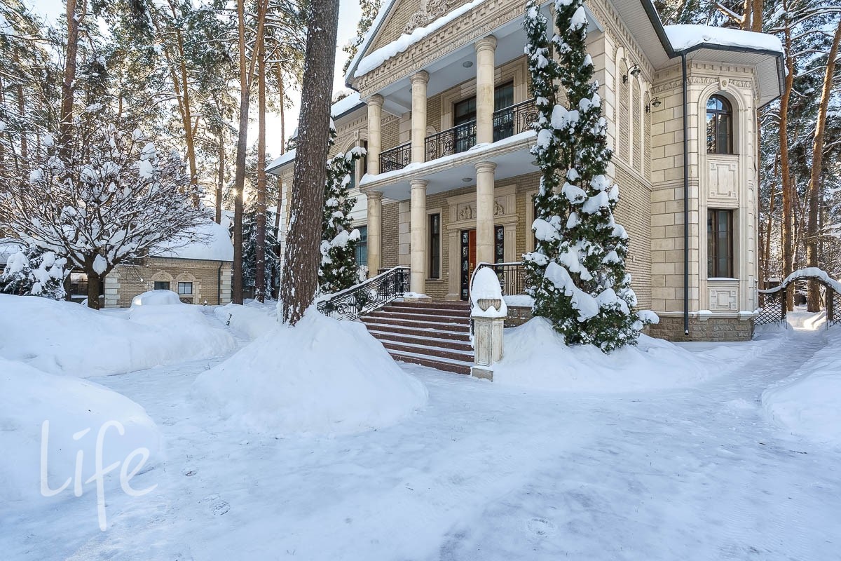 В доме: 4 спальни со своими с/у и гардеробными, гостиная с камином и зоной столовой с выходом на террасу, кухня, кабинет, бильярдная с барной зоной, сигарная, зона отдыха на мансардном этаже, SPA-зона: сауна, купель, душевая.