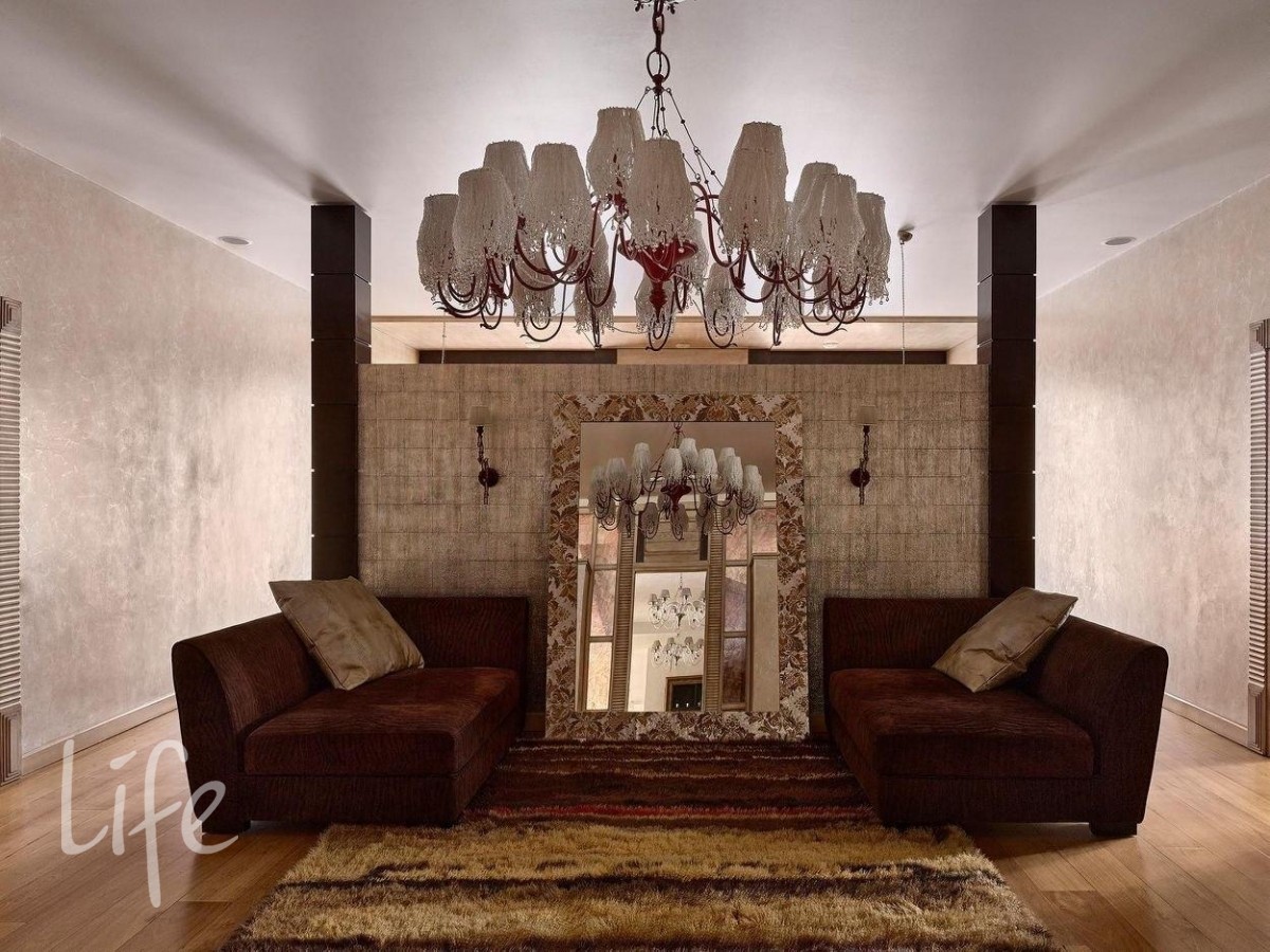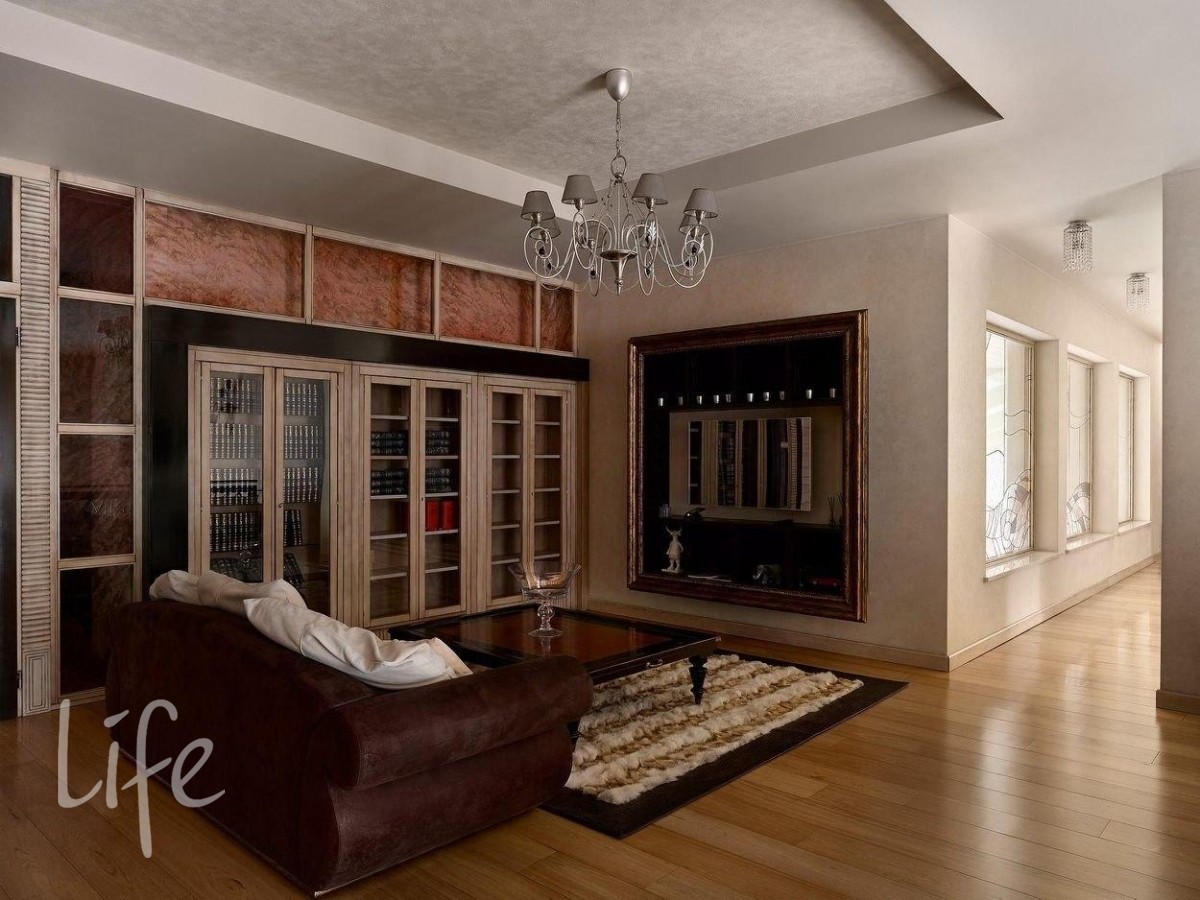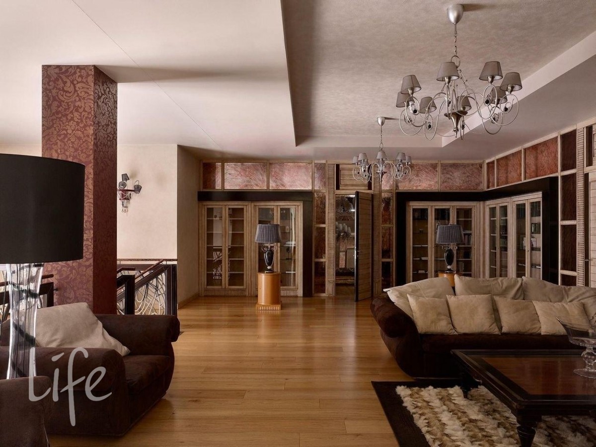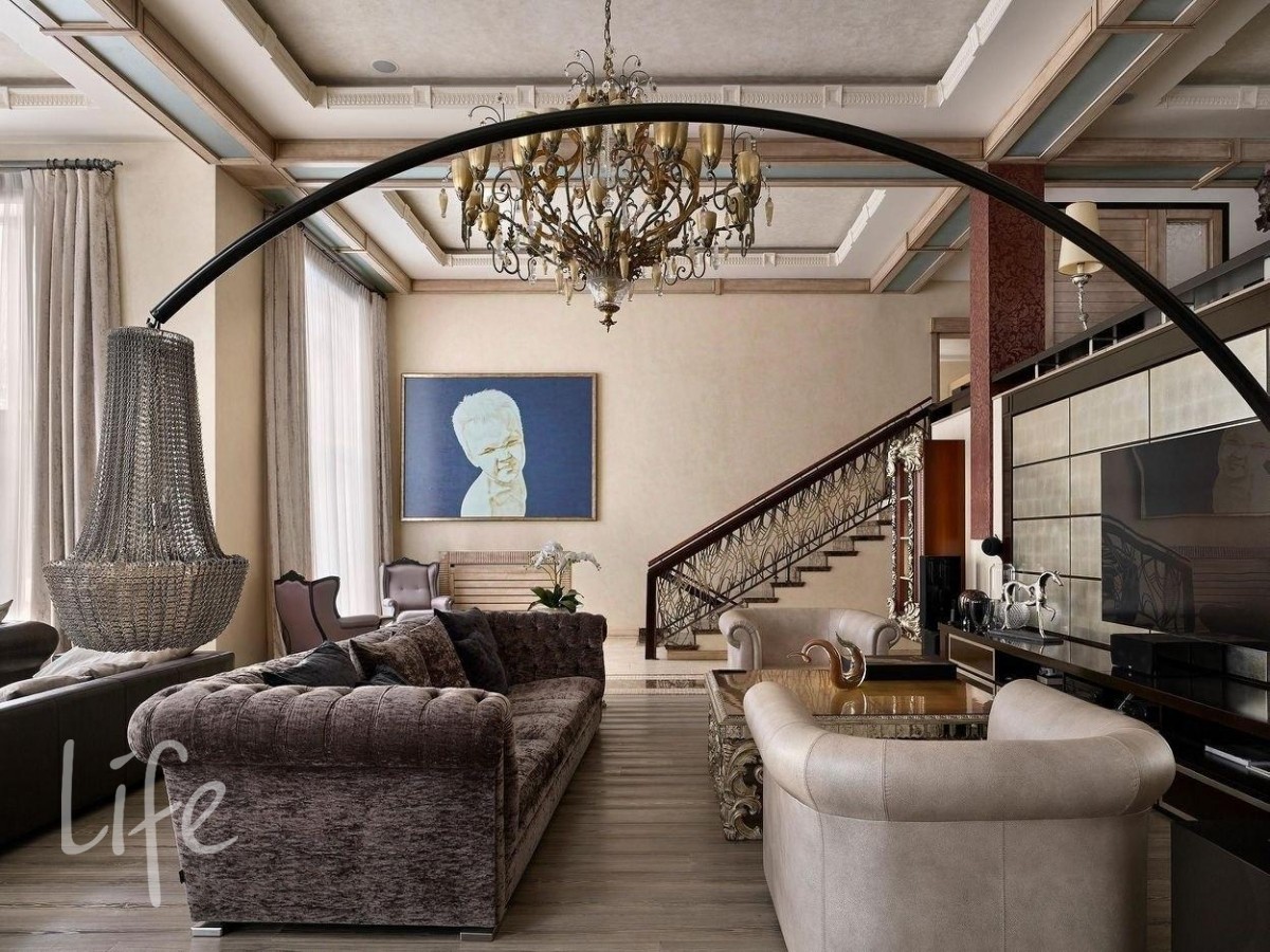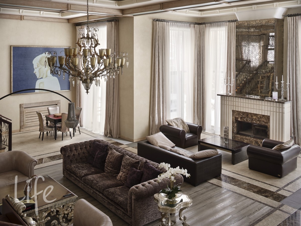 Интерьер выполнен в современном классическом стиле, дорогая мебель и аксессуары, шикарные люстры. Гостиную украшает дровяной камин.