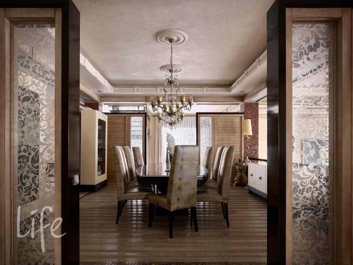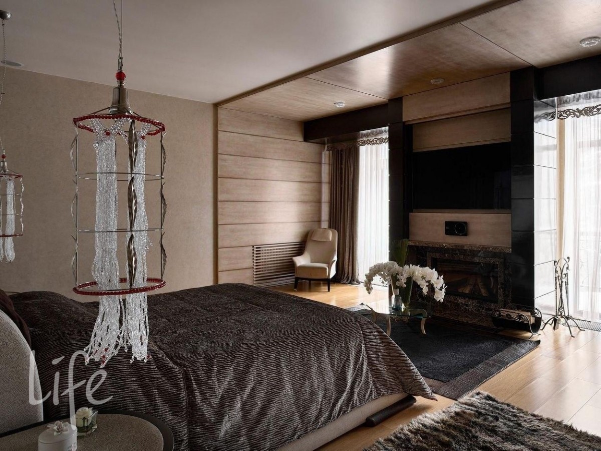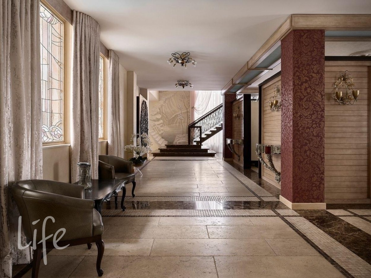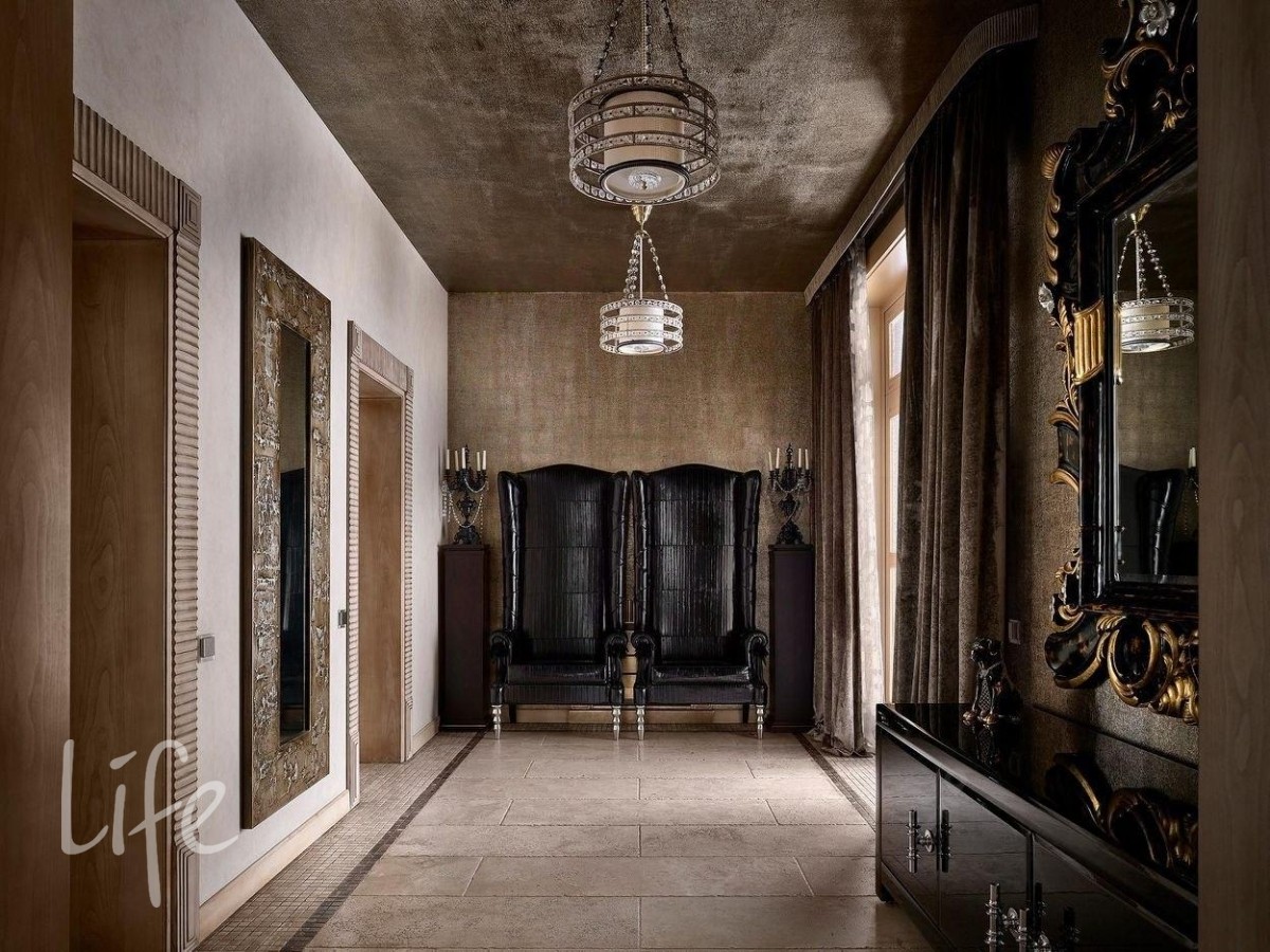 Интерьер выполнен в современном классическом стиле, дорогая мебель и аксессуары, шикарные люстры. Гостиную украшает дровяной камин.