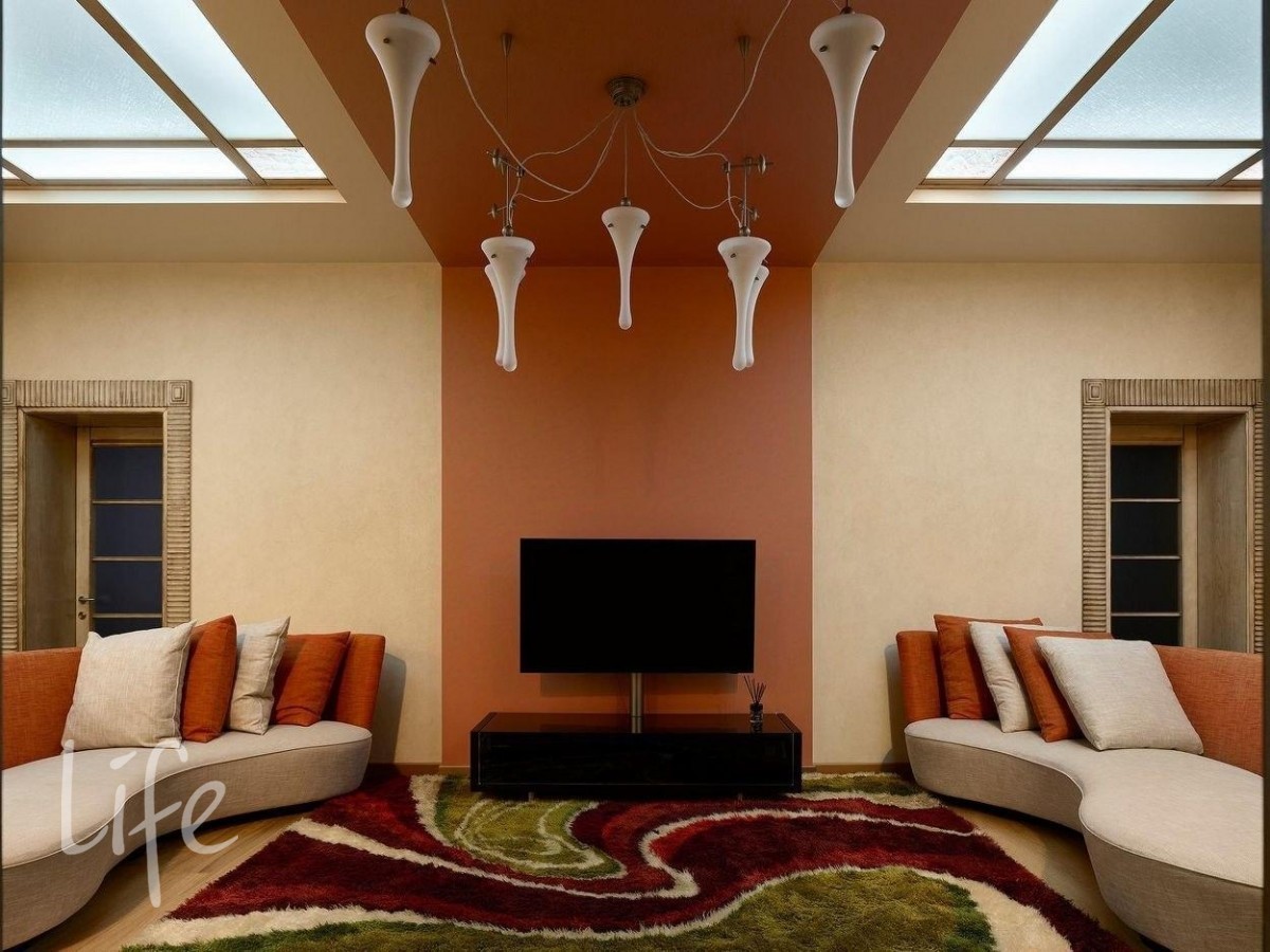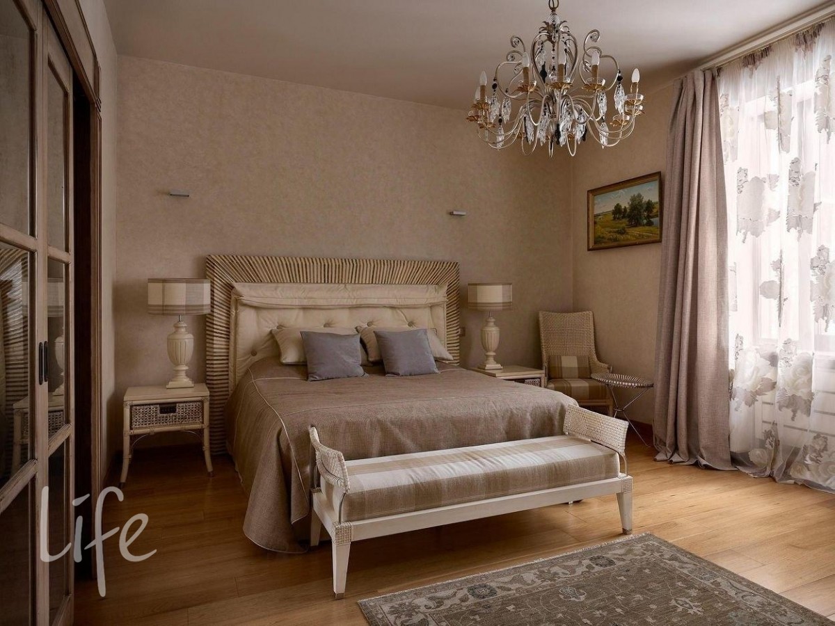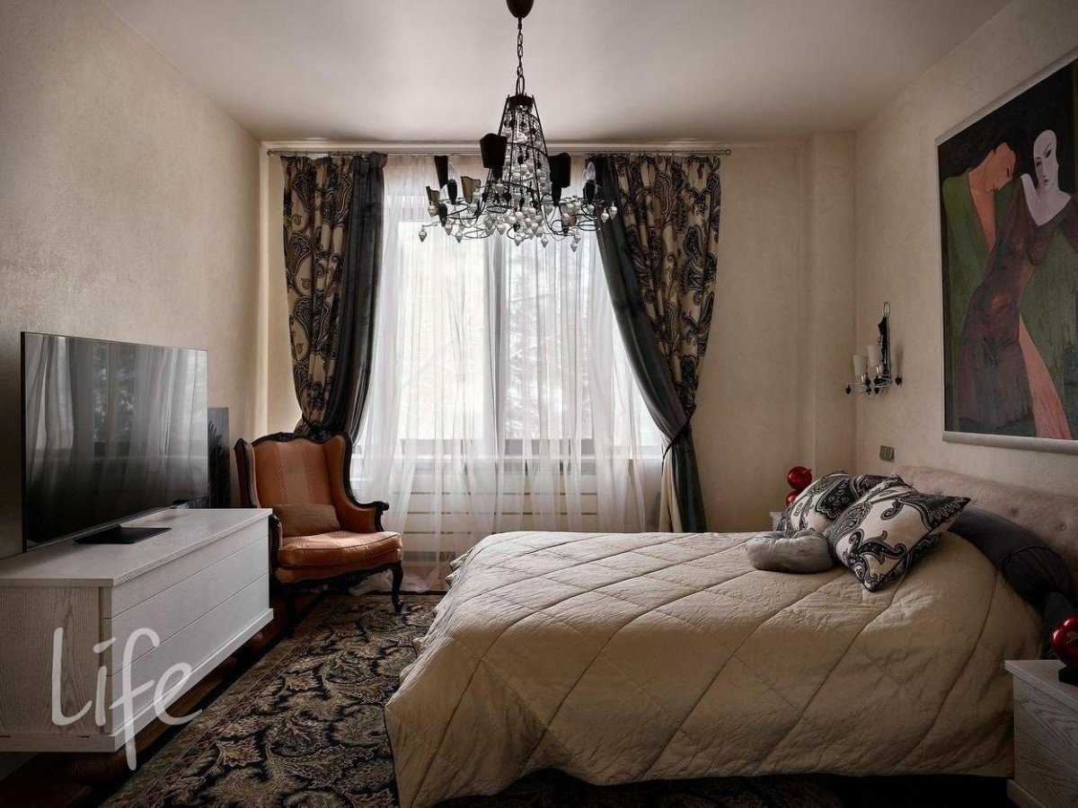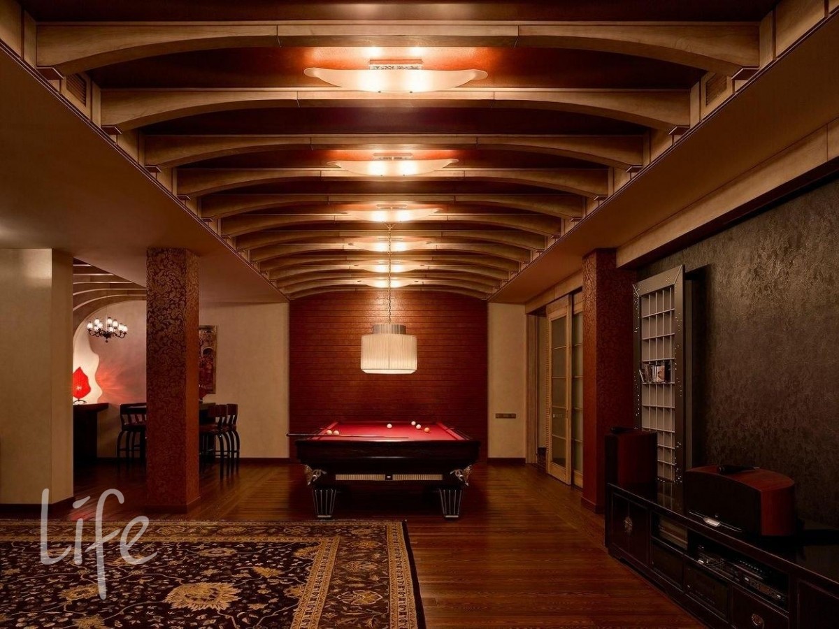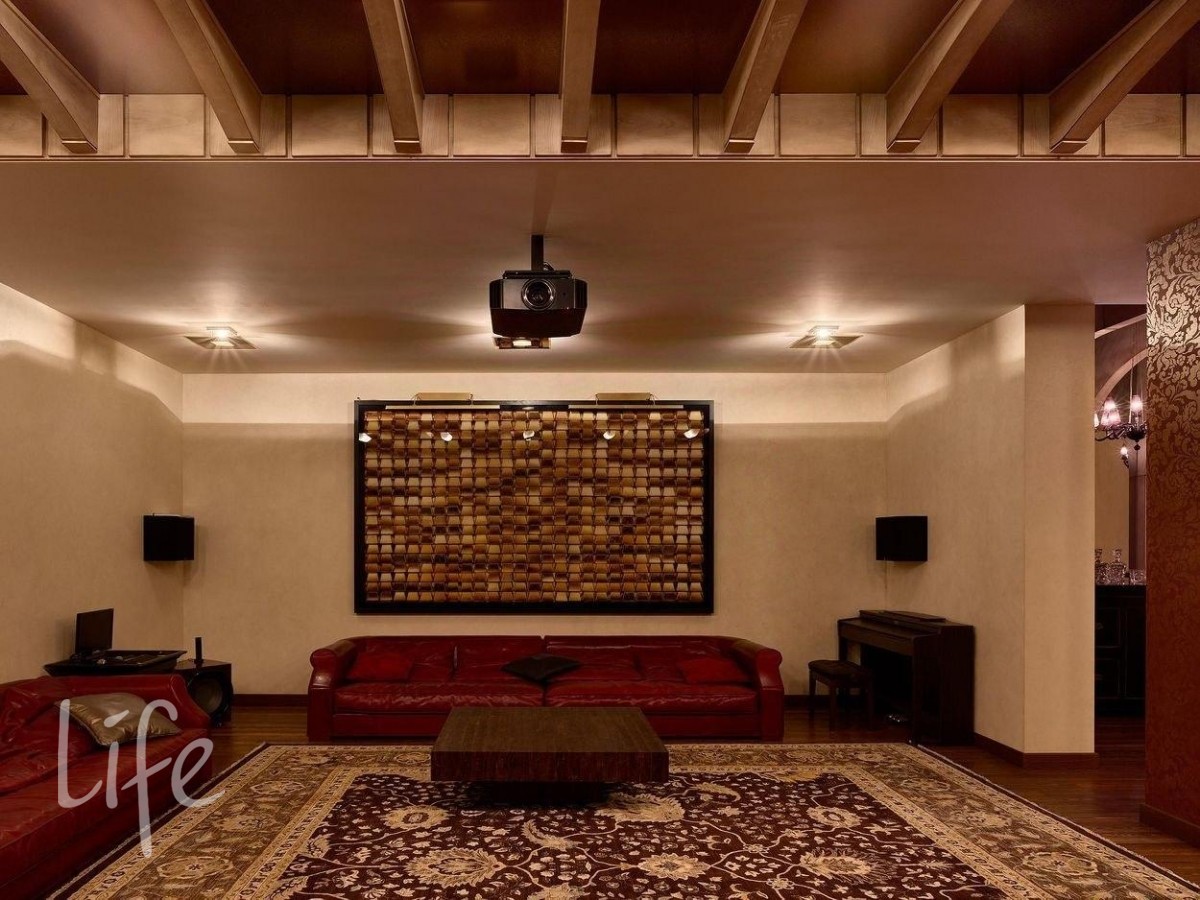 Интерьер выполнен в современном классическом стиле, дорогая мебель и аксессуары, шикарные люстры. Гостиную украшает дровяной камин.