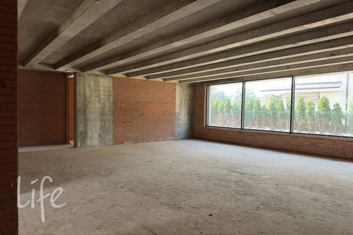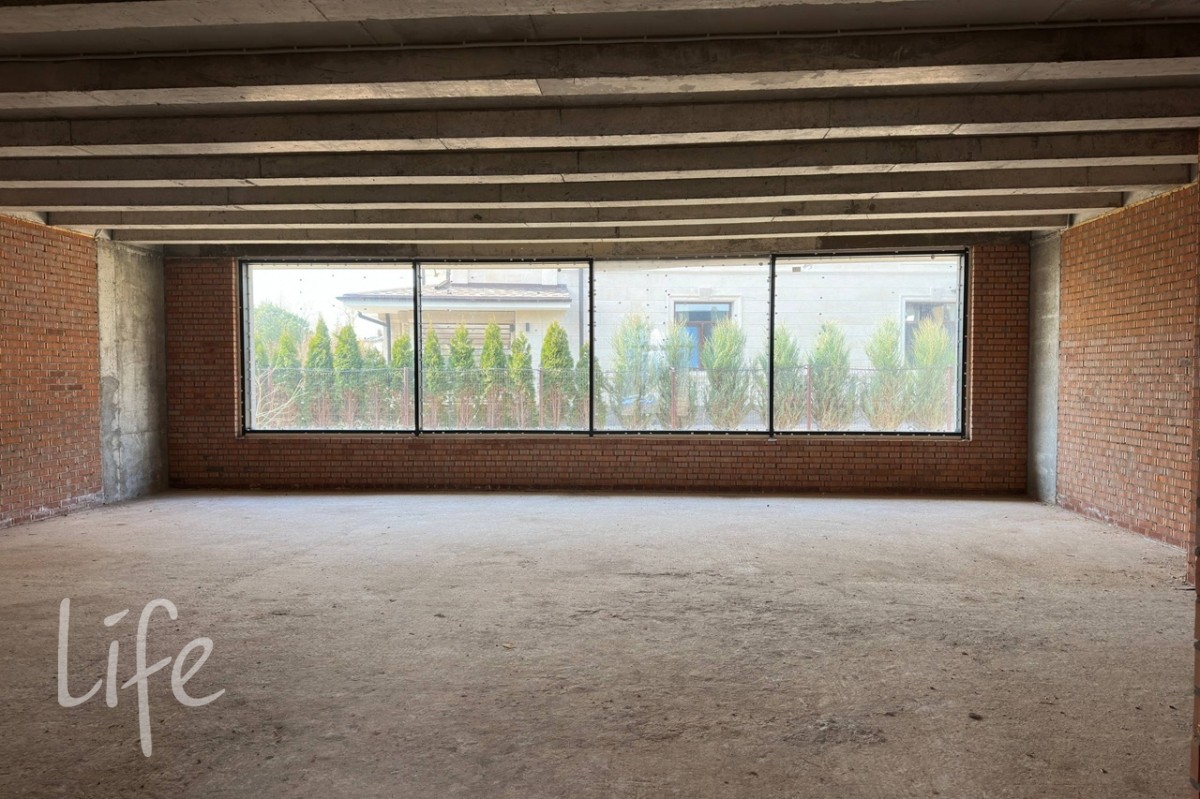 Алюминиевые окна бренда «ALUTECH» и высокие потолки делают внутреннее пространство светлым и визуально ещё более просторным.
