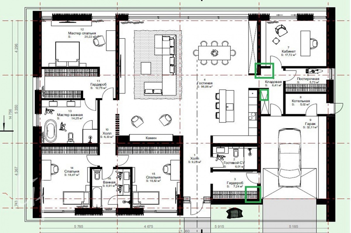 Планировка дома: холл, гостиная, мастер-спальня (с гардеробной и ванной комнатой), 2 гостевые спальни, кабинет, общая гардеробная, ванная комната, гостевой с/у, кладовая, постирочная, гараж.