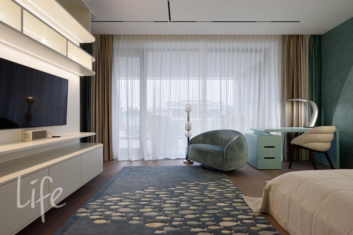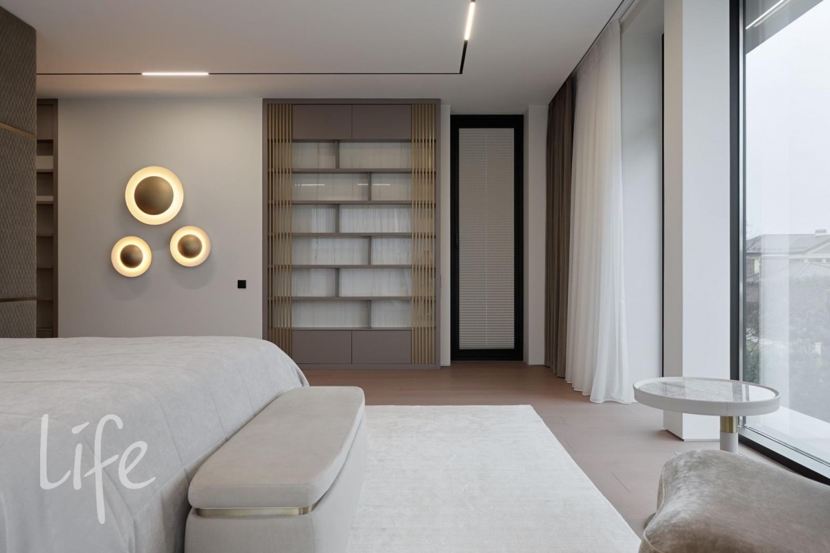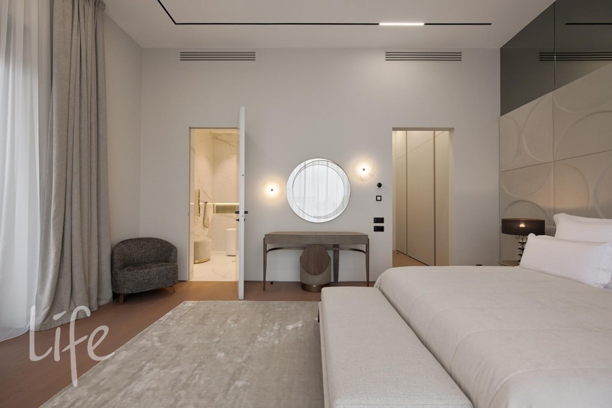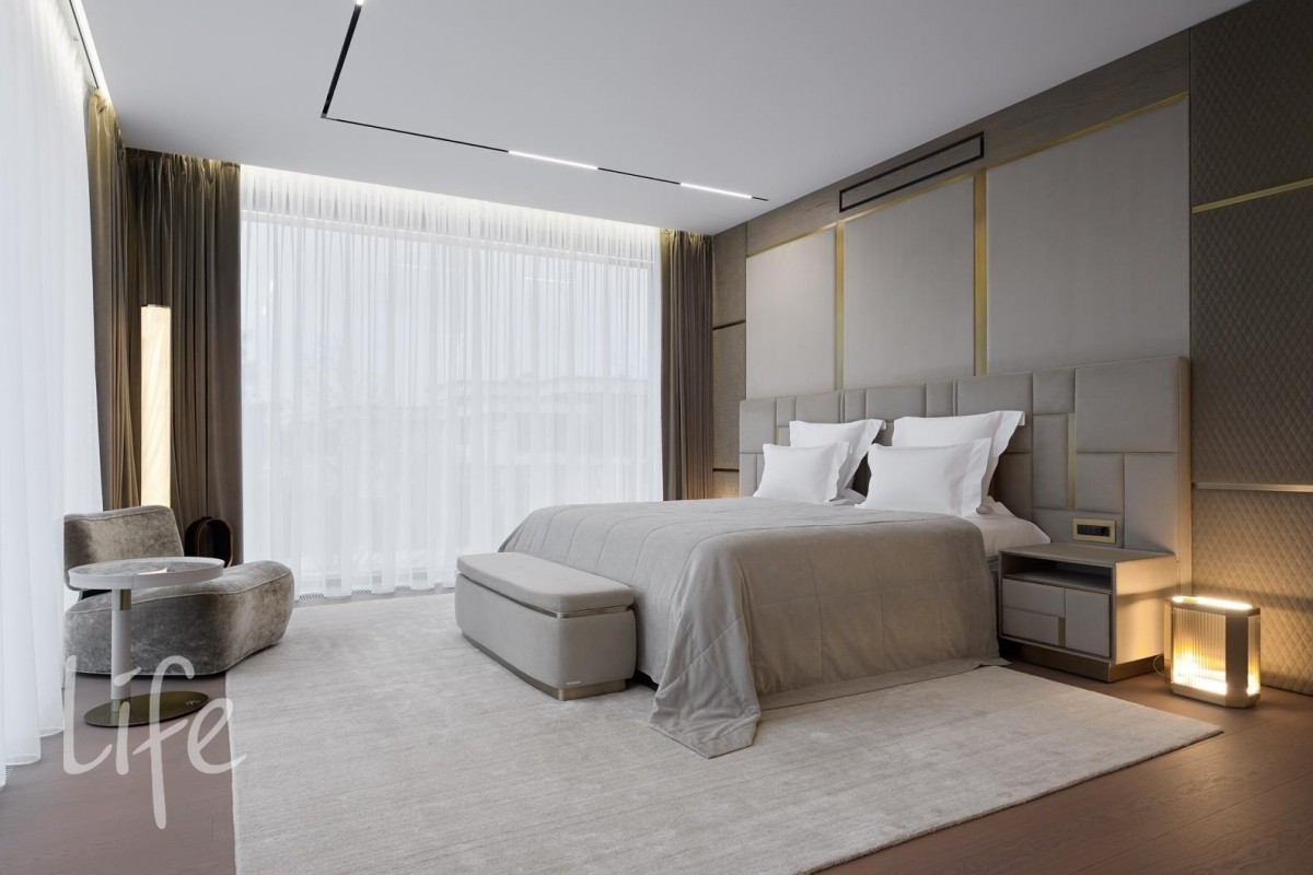 2 этаж: мастер спальня с балконом, двумя большими гардеробными и ванной комнатой, детская с балконом, ванной и гардеробной комнатой, две спальни свободного назначения со своими ванными и гардеробными комнатами, блок для постоянного проживания персонала с отдельным входом (кухня-гостиная, две спальни с санузел).