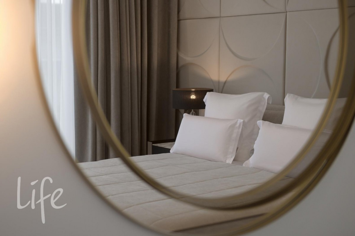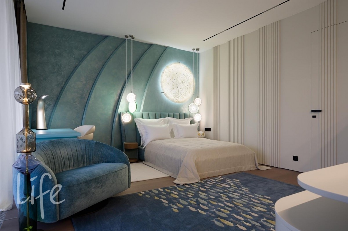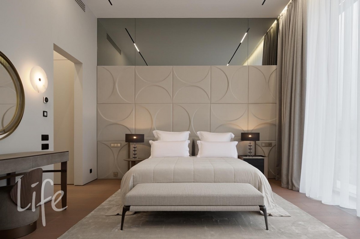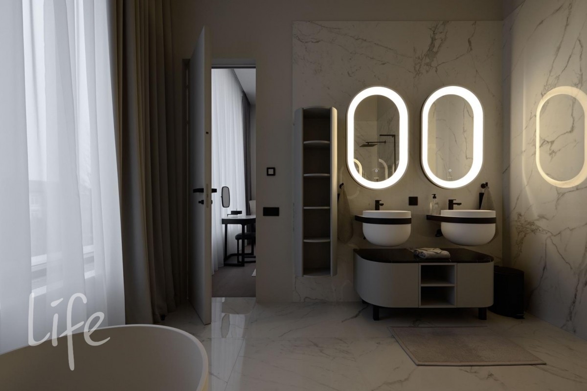 2 этаж: мастер спальня с балконом, двумя большими гардеробными и ванной комнатой, детская с балконом, ванной и гардеробной комнатой, две спальни свободного назначения со своими ванными и гардеробными комнатами, блок для постоянного проживания персонала с отдельным входом (кухня-гостиная, две спальни с санузел).