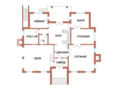 1 этаж: холл, гостиная, столовая, кухня-столовая с выходом на террасу, кабинет, гостевая спальня, гостевой с/у, гараж на два автомобиля.