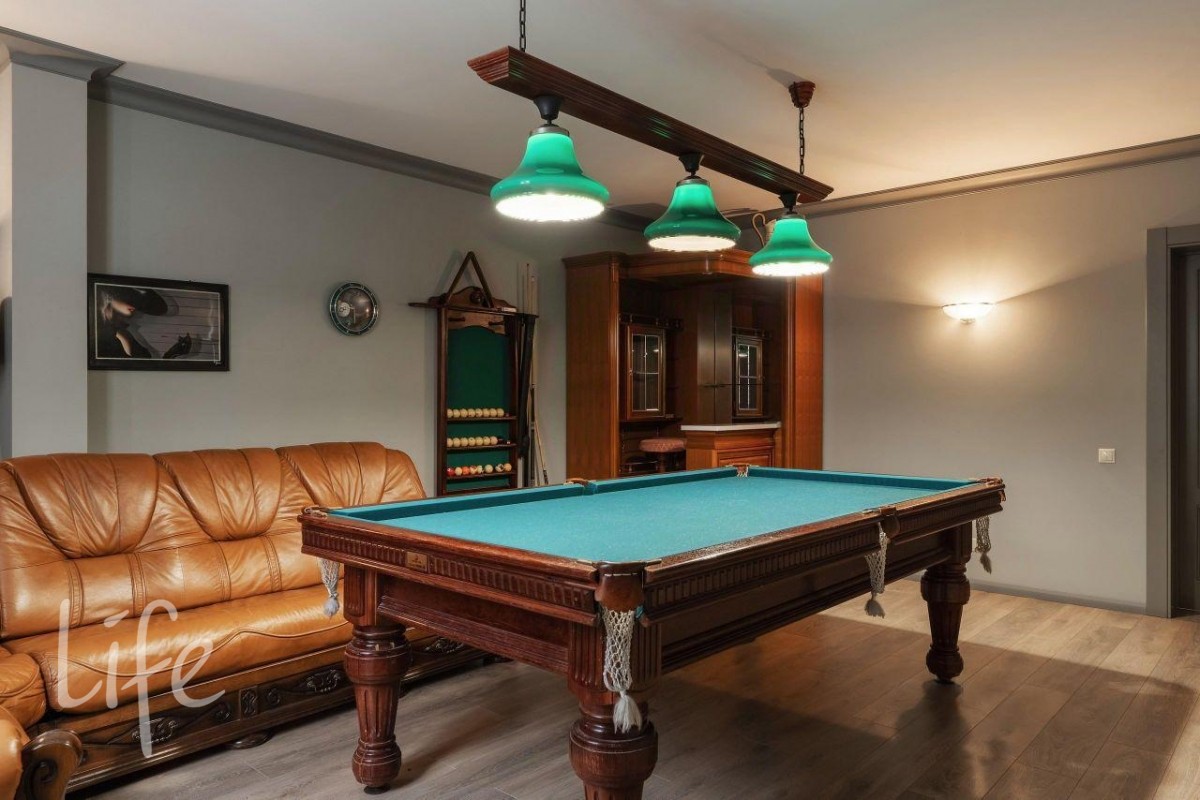 В доме пять спален, гостиная, зона отдыха с бильярдной в цоколе, что отлично подойдет для большой семьи.