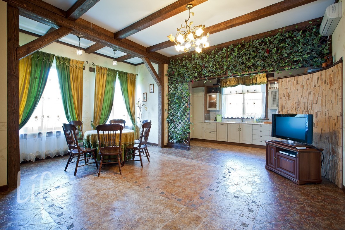 1 этаж: прихожая-холл с гардеробом, гостиная-кухня-столовая (студия), спальня, с/у с душевой кабиной и ванной; погреб для вина и продуктов.