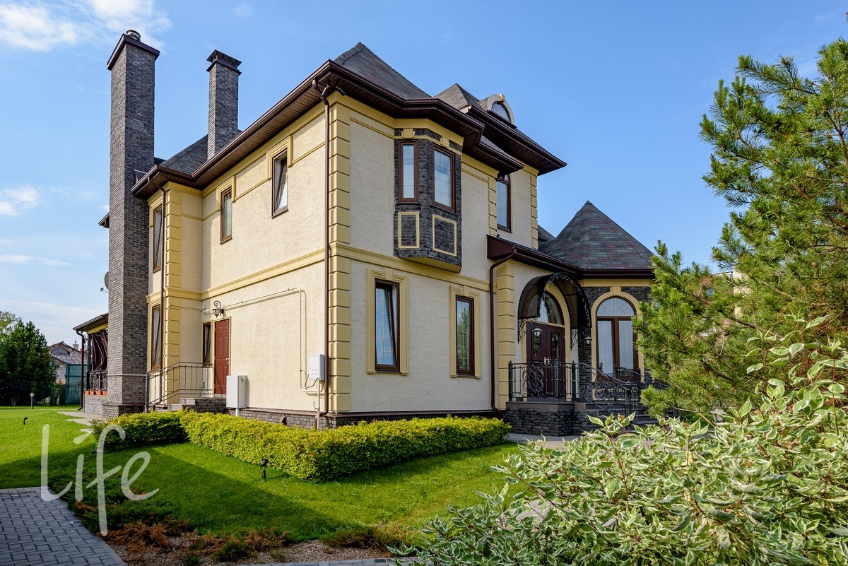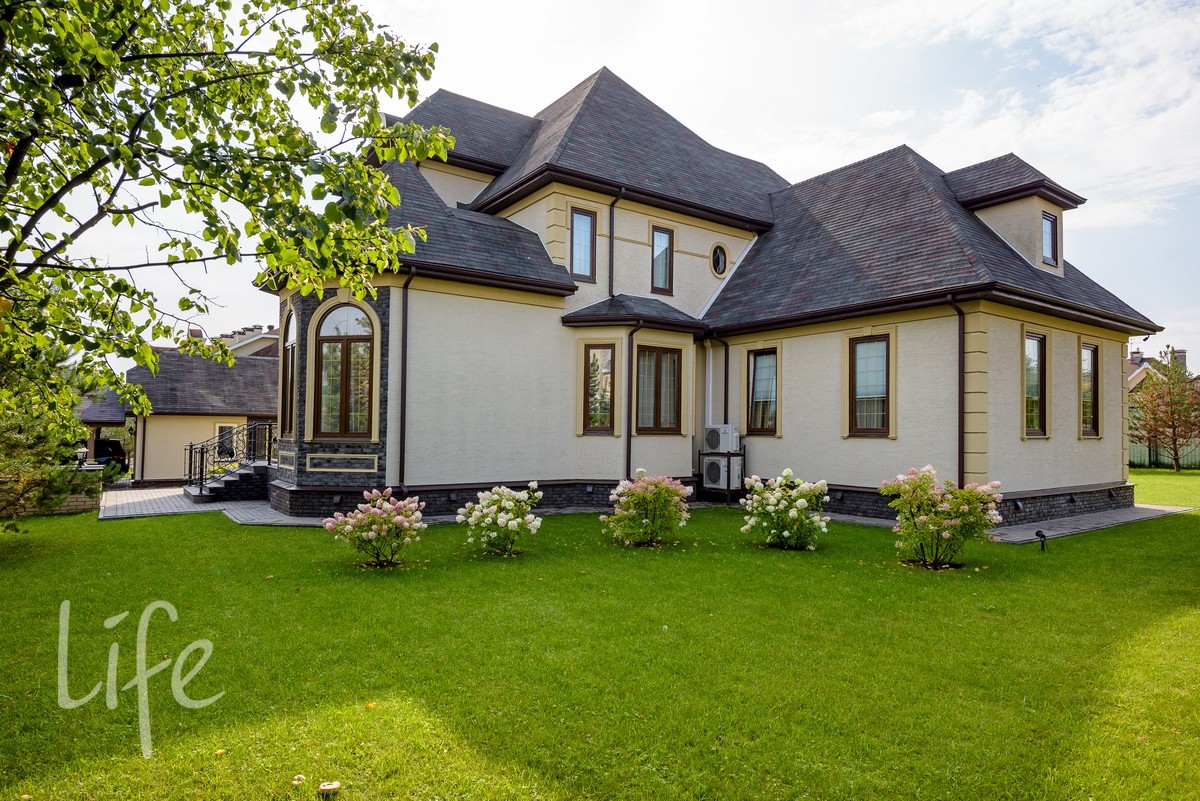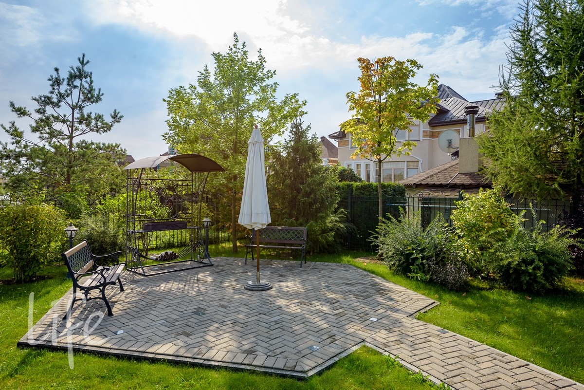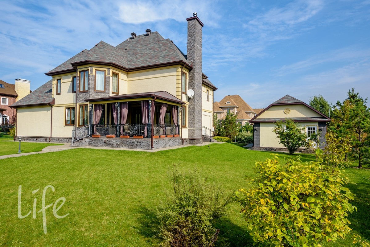 Дом расположен в вип-зоне поселка, прилегающей к лесному массиву, с персональной системой доступа. Участок правильной формы, с качественным ландшафтным дизайном. Площадки, дорожки замощены гранитной брусчаткой, с автоматическим парковым освещением и системой полива. Гараж на два автомобиля с блоком для персонала. Навес для автомобиля.