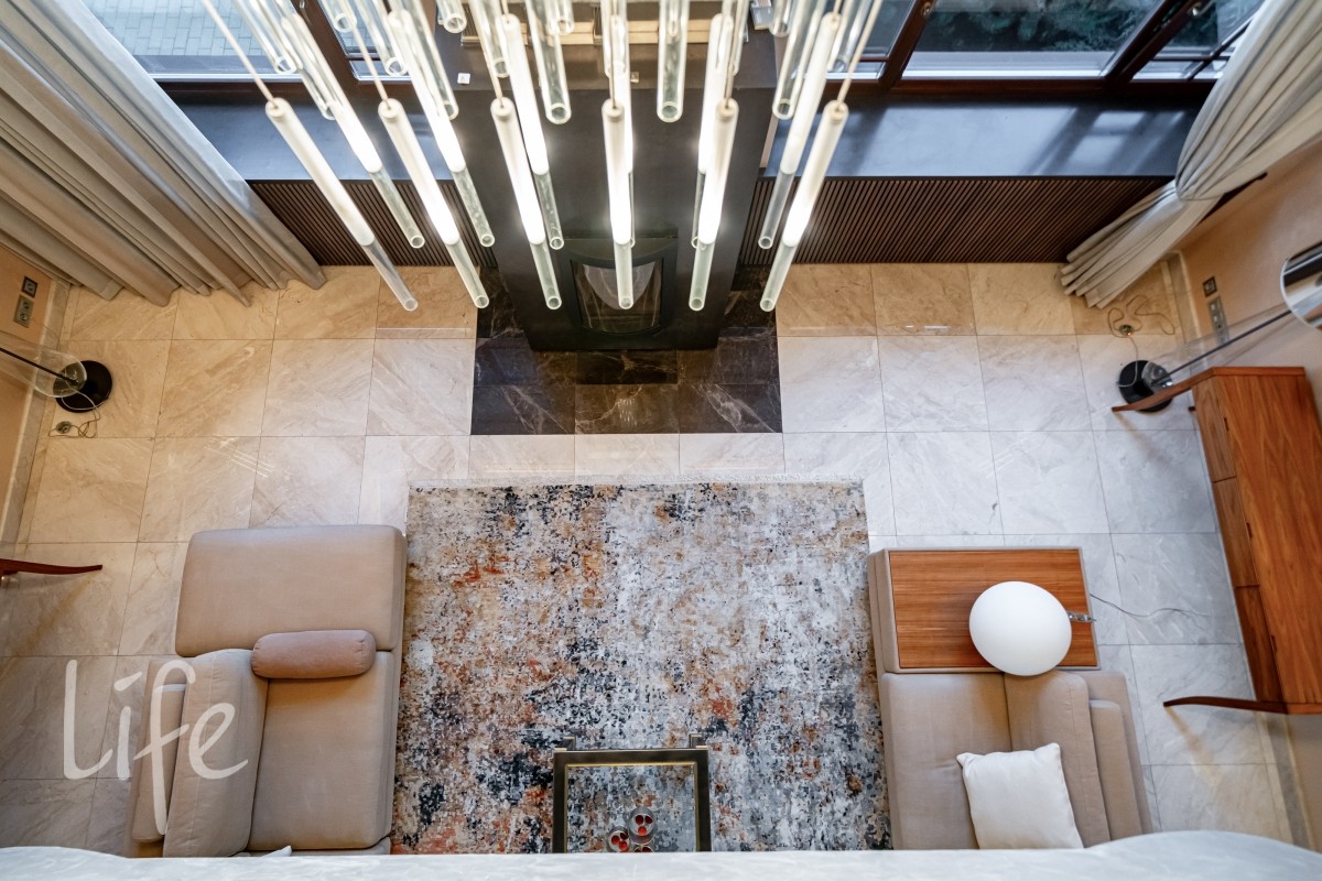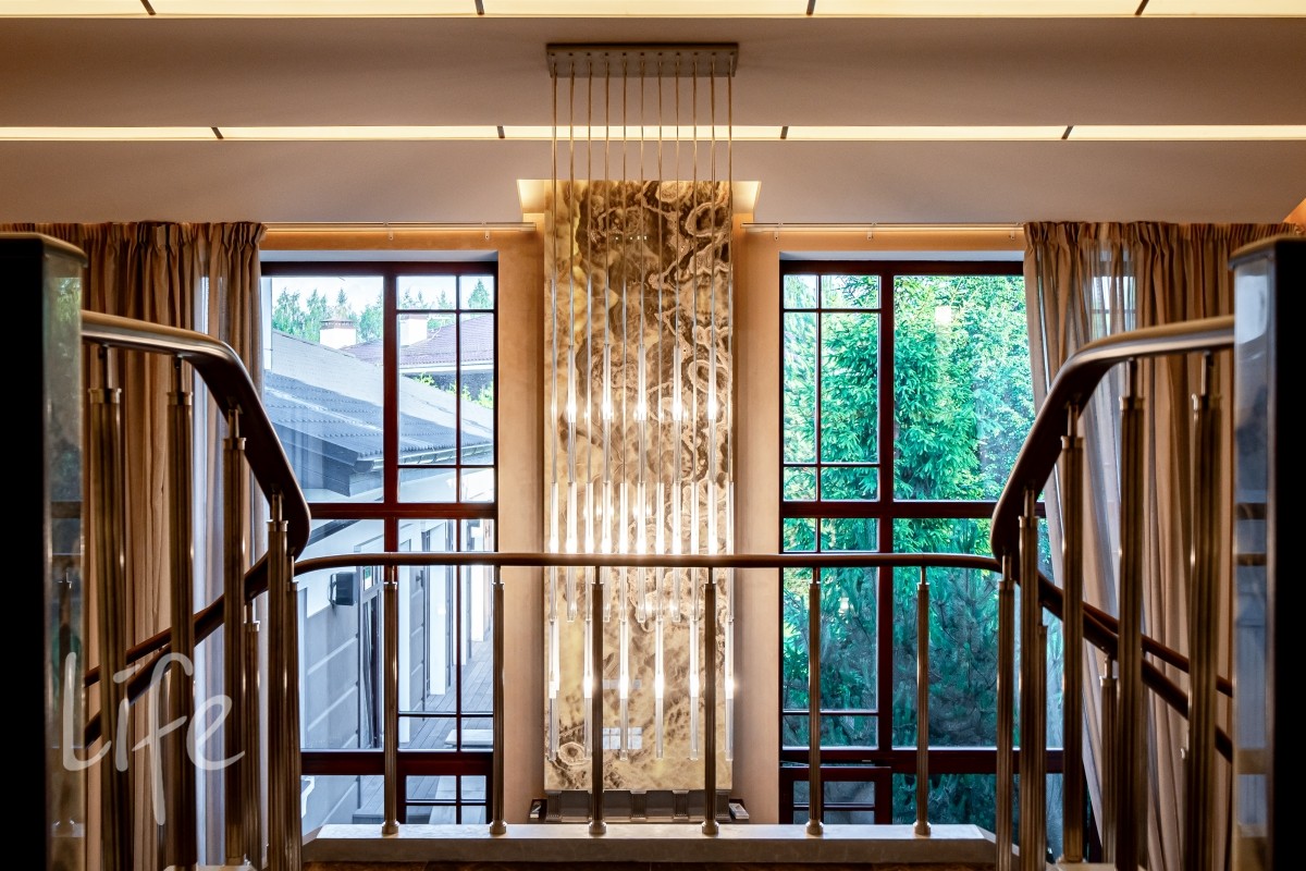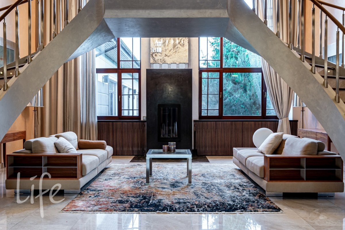 Дизайнерский интерьер выполнен в современном классическом стиле, в мягких светлых тонах, со вкусом подобраны мебель и аксессуары. Эксклюзивная мебель представлена от ведущих мировых производителей. Камин в каминном зале создаёт атмосферу уюта.