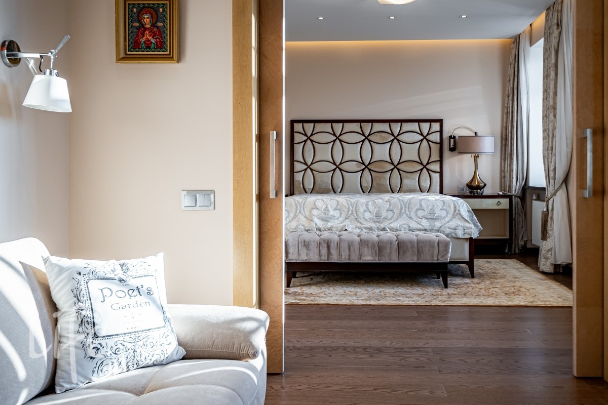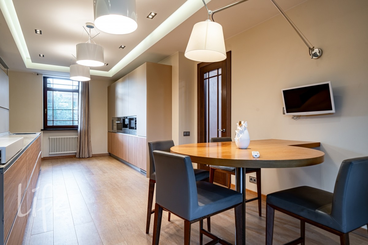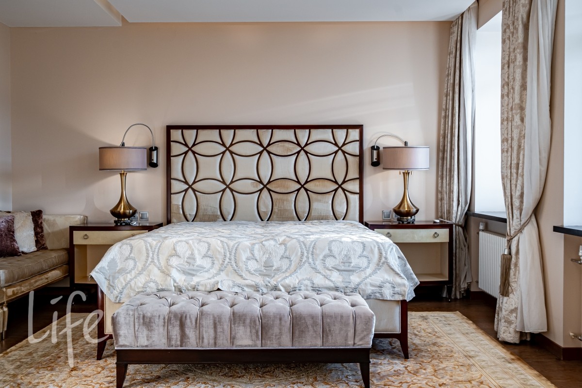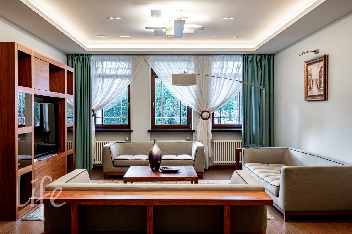 Дизайнерский интерьер выполнен в современном классическом стиле, в мягких светлых тонах, со вкусом подобраны мебель и аксессуары. Эксклюзивная мебель представлена от ведущих мировых производителей. Камин в каминном зале создаёт атмосферу уюта.