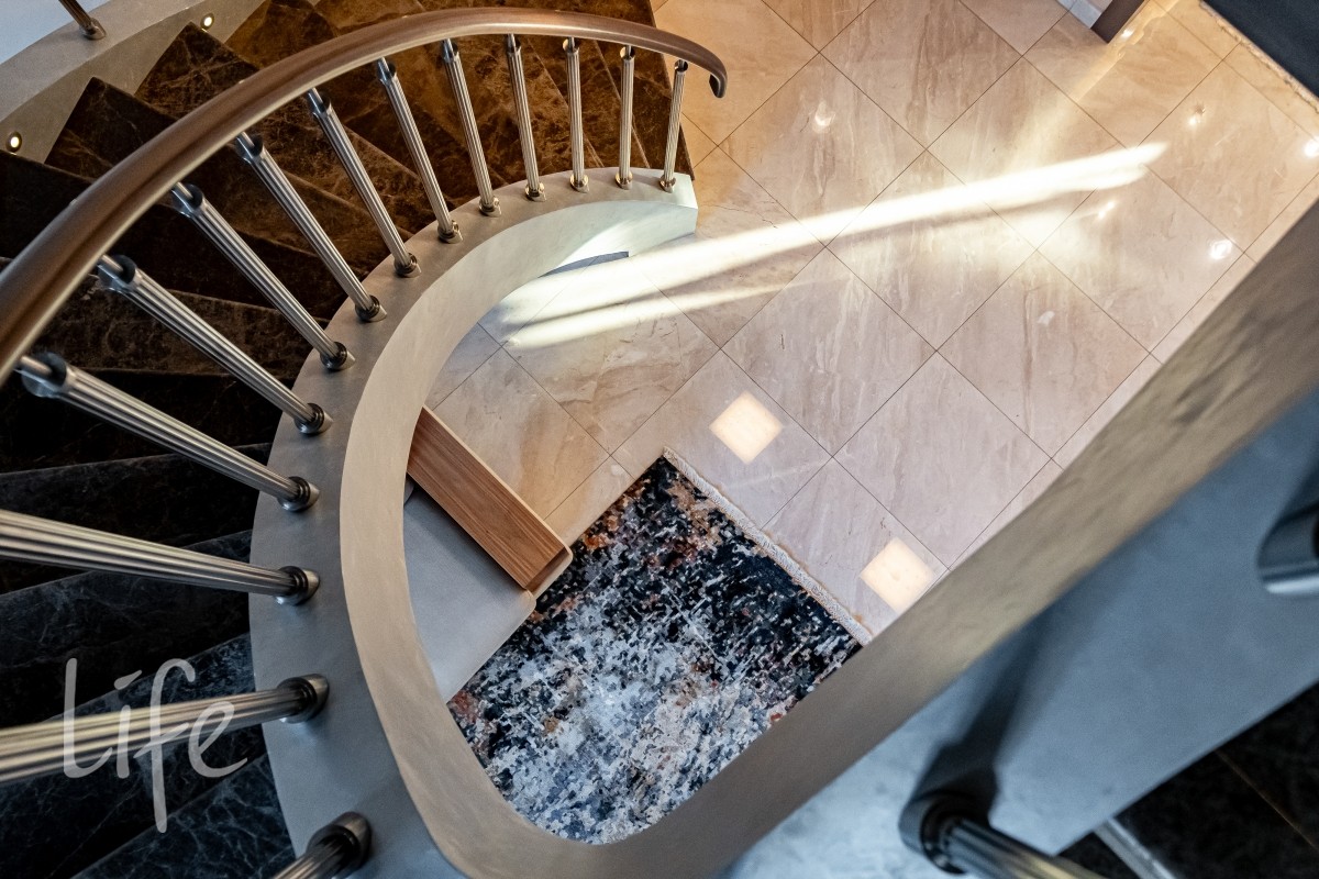 1 этаж: прихожая, гардеробная, каминный зал со вторым светом, гостиная с кабинетом, столовая, кухня, зона отдыха с выходом на террасу, две спальни, два с/у, СПА-зона — 12-метровый бассейн, сауна, зона отдыха, бильярдная, с/у с душевой, раздевалка, гараж на два автомобиля.