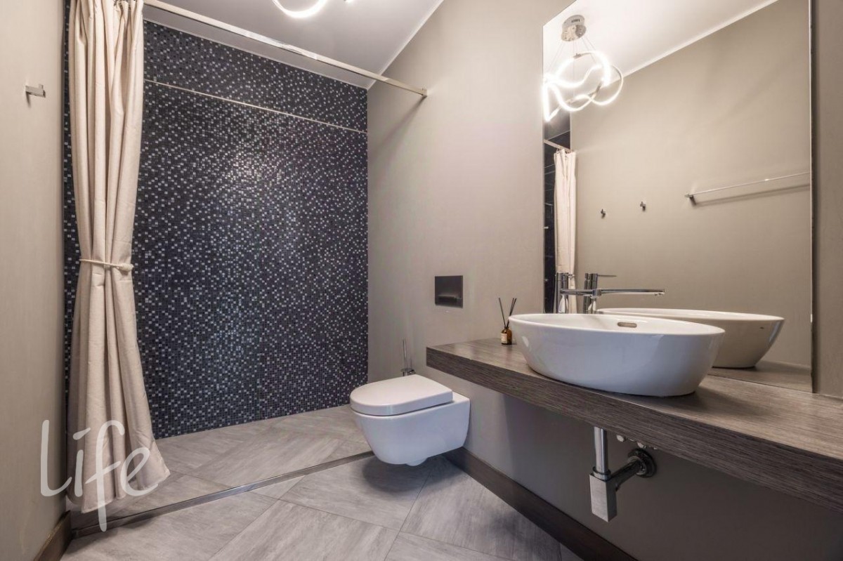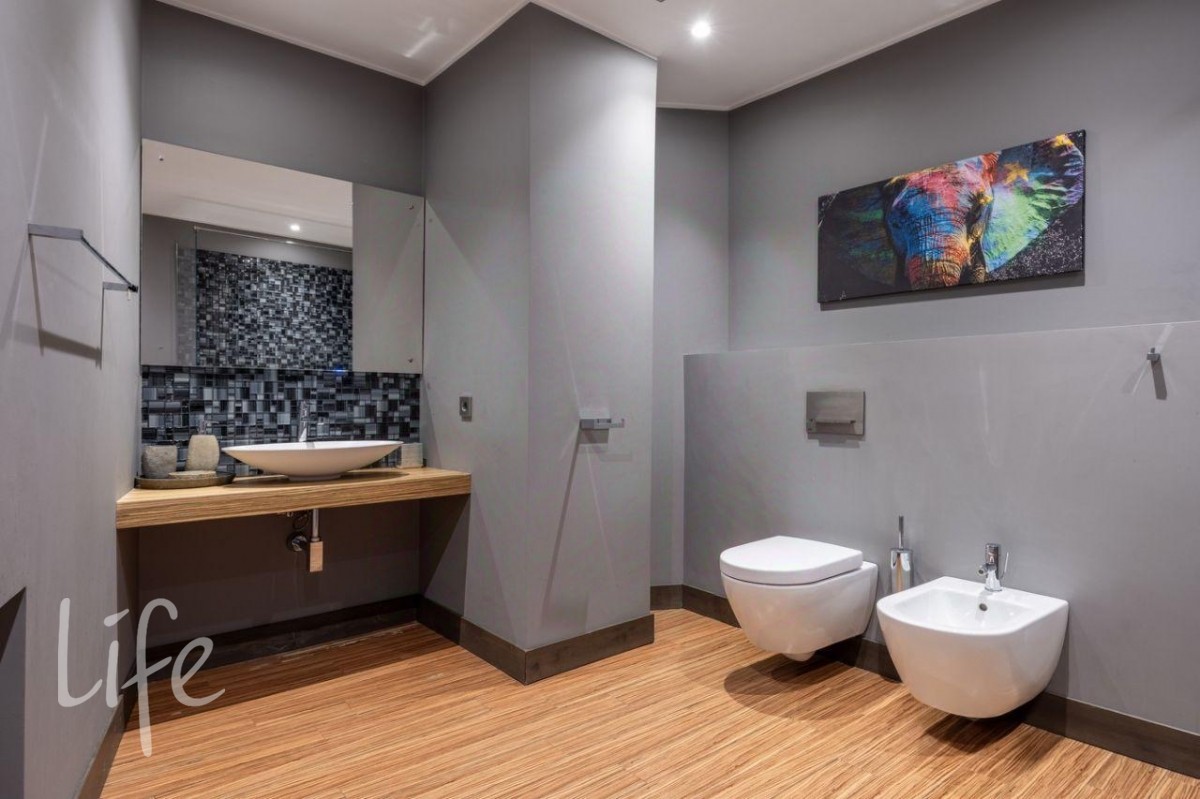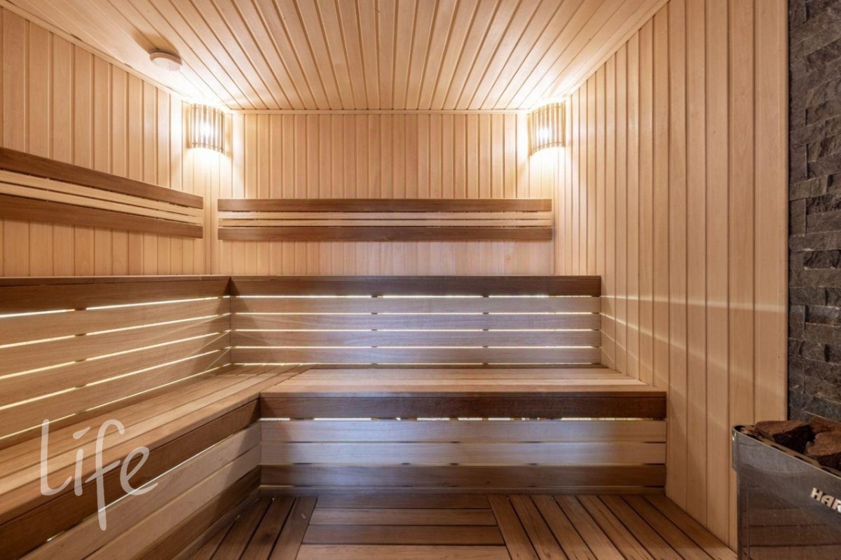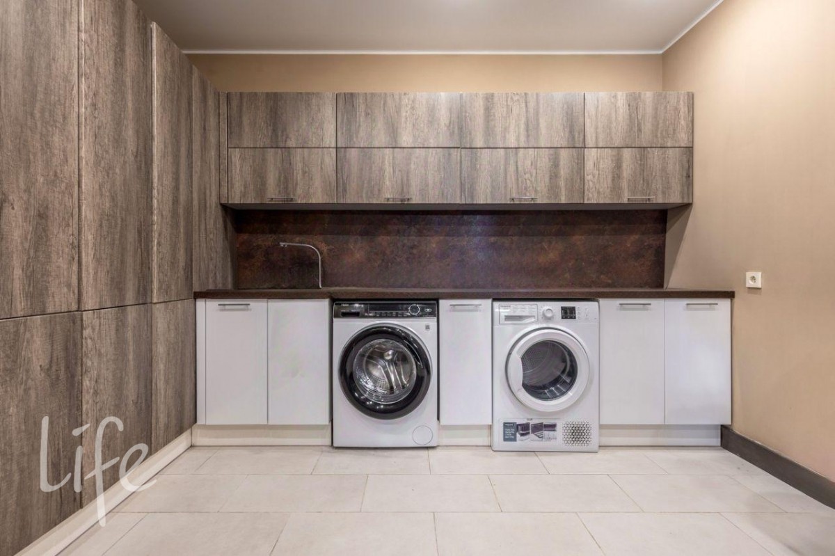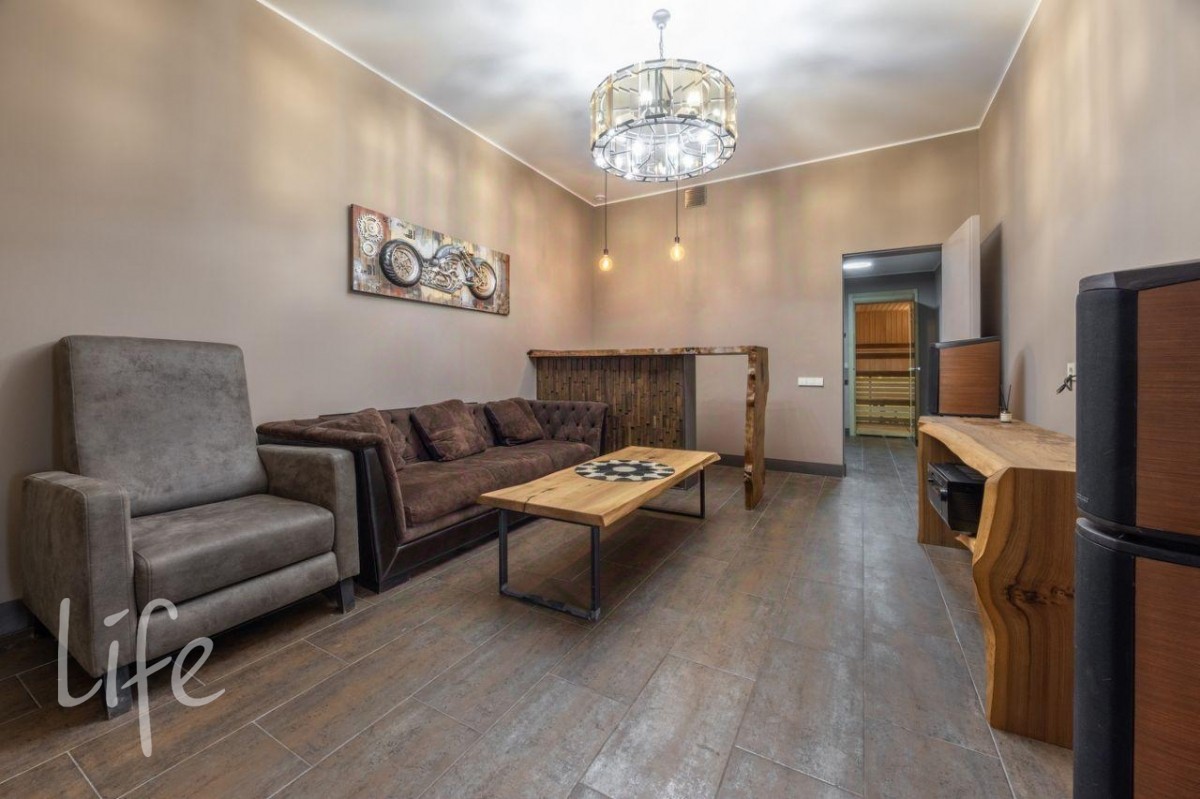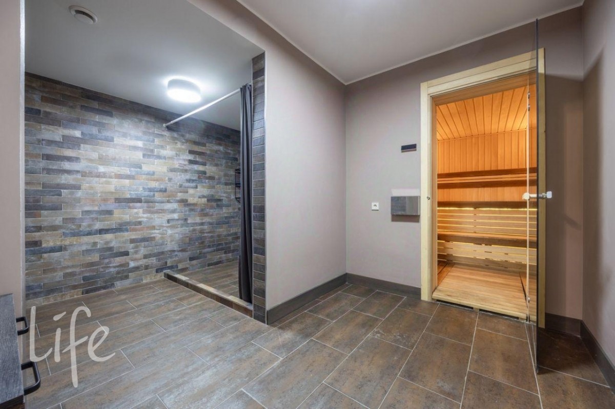 Цоколь: гараж на два автомобиля, техническое помещение, прихожая, гостевая ванная комната, прачечная с комнатой для мытья собак, зона СПА: сауна, душ, гардеробная, комната отдыха с баром.